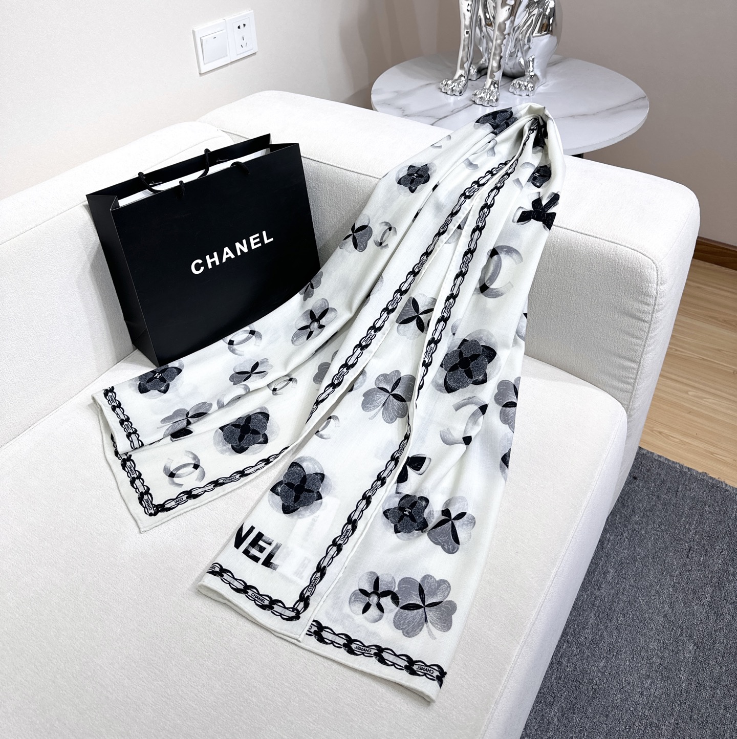 P205 💞小香【山茶花长围巾】~超级抬气色!高级女人味!羊绒围巾也能这么美!!!这款双面花卉羊绒围巾真的好高级!香奶奶家招牌的花卉花色搭配服饰很显品味!!招牌山茶花与双C字母元素的新融合,奢华优雅感,薄薄的羊绒手感,双面印花的设计真的很赞!春夏搭配白衬衫更是又气质又时髦,秋冬搭配大衣超级显品味,懂得搭配的姐妹一定要入手!!柔软软糯顺滑!赋予了围巾非常容易造型,非常重磅奢华的设计,上身却别样衬得人高贵气质!简单的打底配此款围巾,简单的搭配却给人非常舒适有品味的大牌感…推荐!!尺寸规格:60*180cm双面印染工艺羊绒长巾