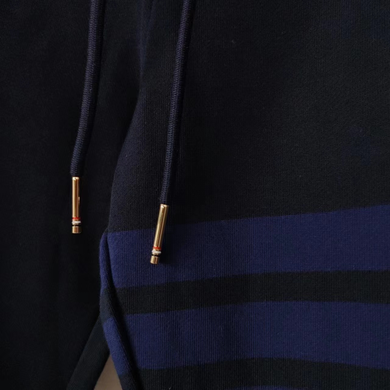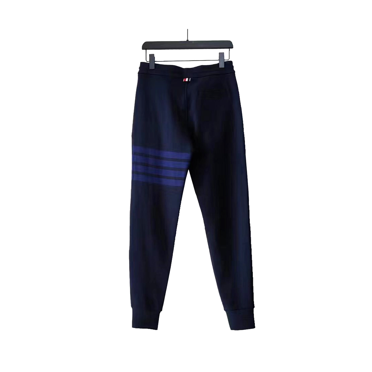 TB长裤色织经典色织灰、蓝彩条四条杠长卫裤 ZP面料色织定制 380克重经典毛圈棉 高清还原细节 做工精细 采用进口缝纫设备缝制 针距细密 螺纹裤头定制弹性织成 五金裤绳可转动