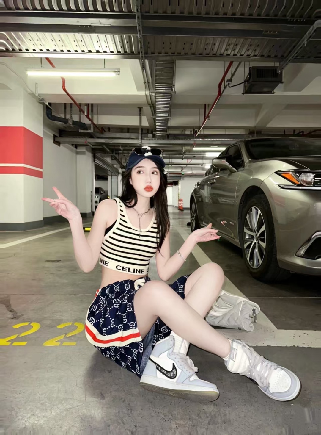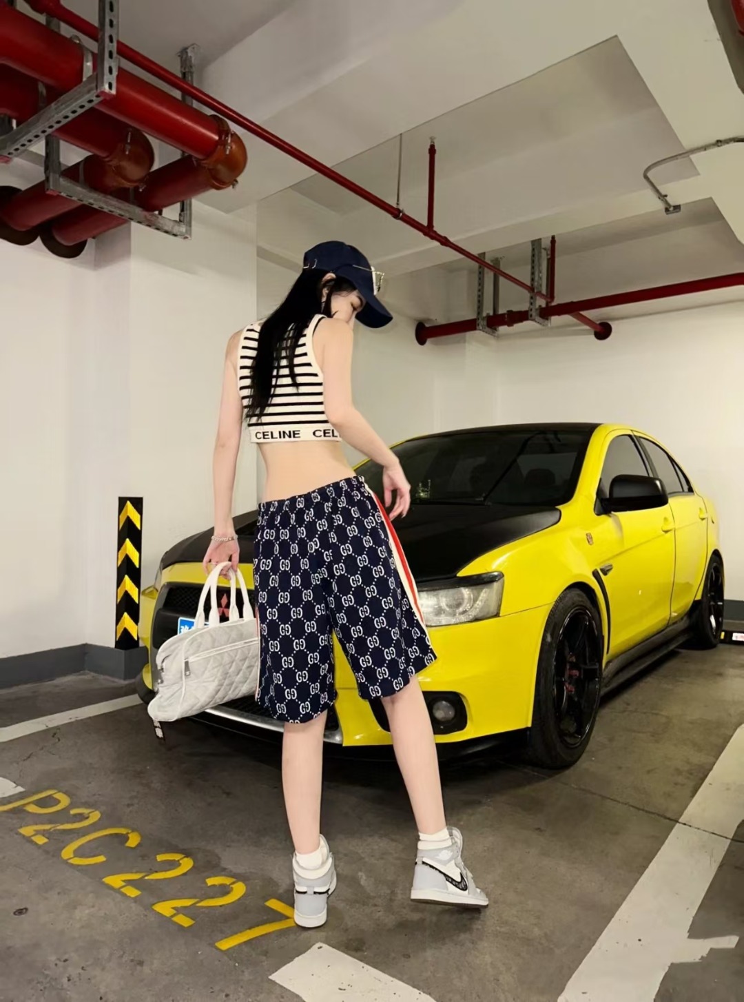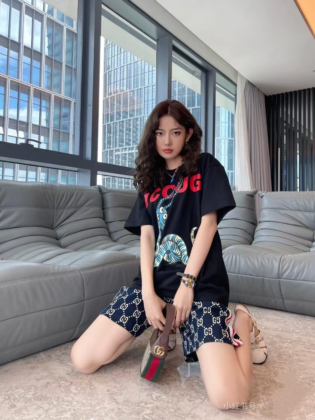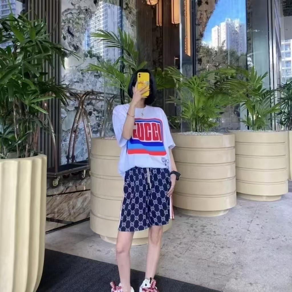 模特上身效果 Gucci/古驰 织带拼接满印字母logo休闲短裤