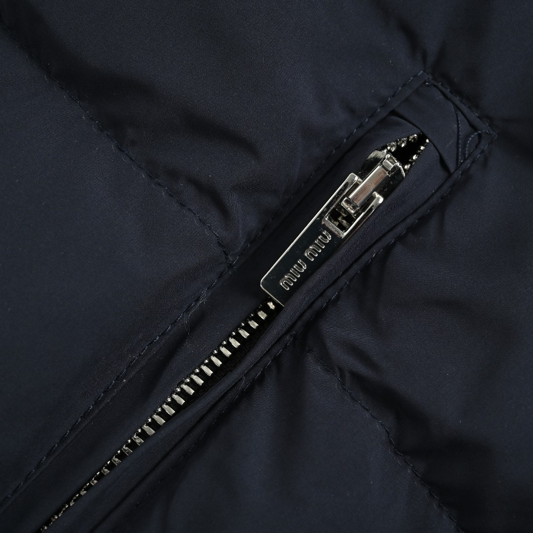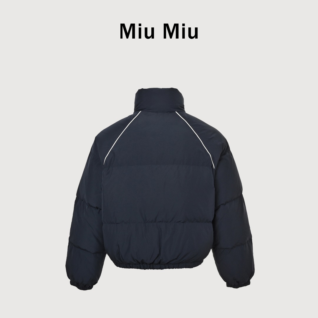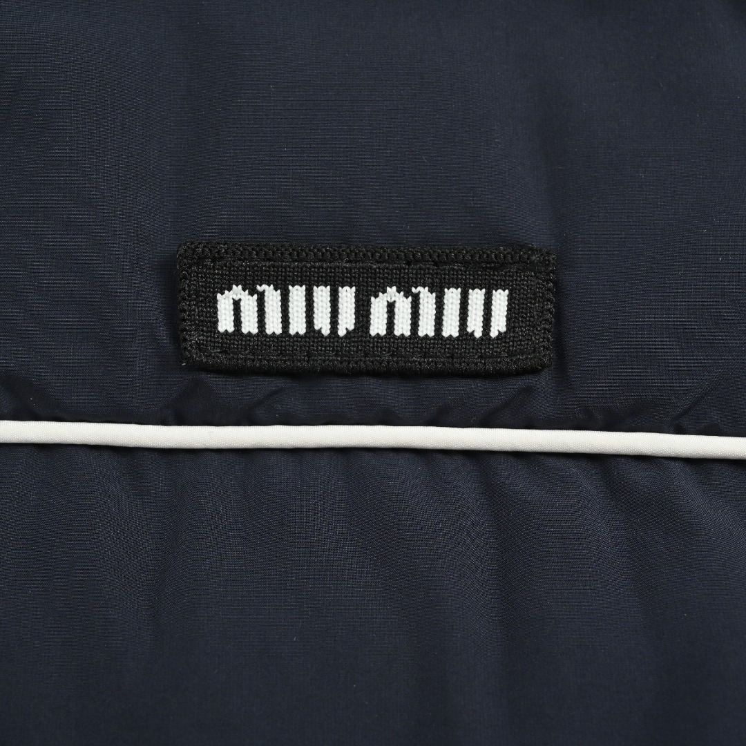 本地自取💰580 Miu Miu 25Fw Miu小标捆条短款羽绒服 -核心内里填充180G广检认证90%纯白鸭绒 定制开发高支高密梭织面料,其纱线结构与织法经过精 密计算,旨在实现极佳的防绒钻性,同时保证面料本身的轻盈与耐久度,面料色彩为独家定染,确保了色彩的纯粹度与独特性,采用捆条拼接工艺,该工艺在每块裁片的接缝处内衬一条白色织带,再将面料拼接并压线固定,白色的捆条在深色面料上形成了鲜明而利落的轮廓线,强化了单品的结构化视觉,内里填充90白鸭绒,高纯度绒子能锁住大量空气,形成静止空气层,实现高效保暖,这使得羽绒服在拥有极强保暖性的同时,重量得以大幅减轻,选用进口电脑充绒设备,确保每一个独立绗格内的羽绒填充量都精准、均匀,避免出现局部空洞或结块,从而保证羽绒服整体的平整度、保暖均匀性与持久蓬松,定制辅料三标 Size:38 40 42