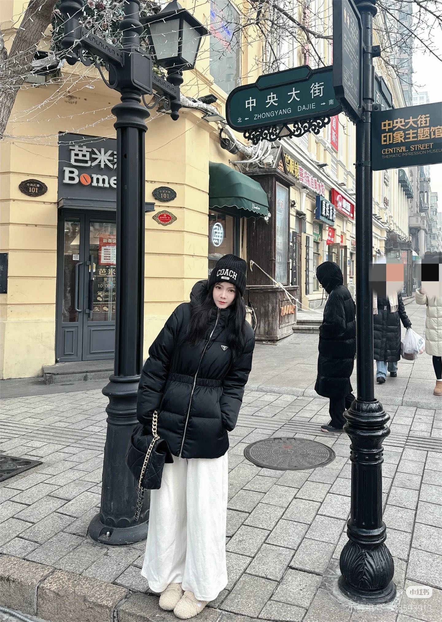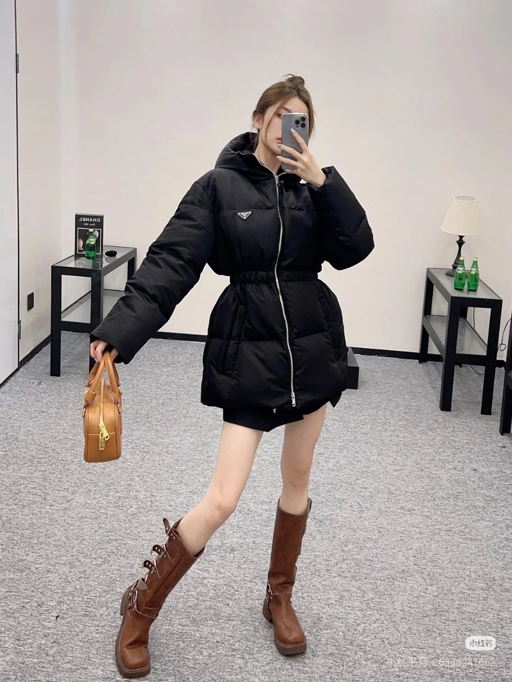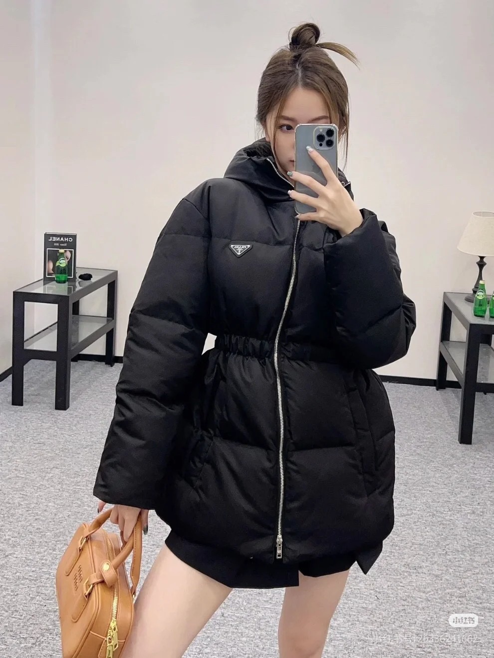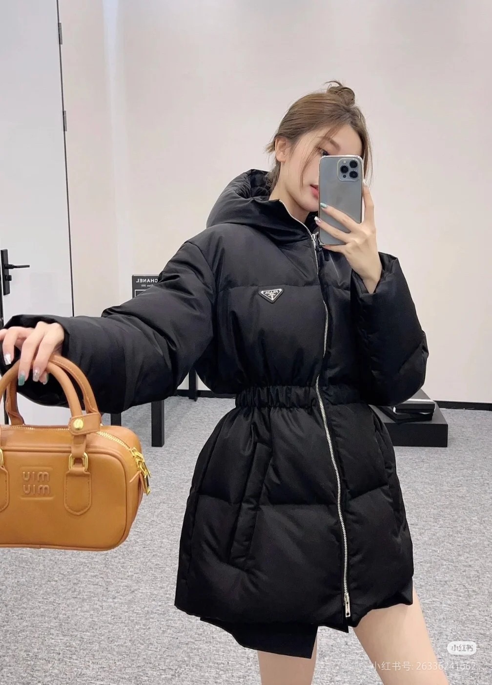 Prada/普拉达 女士三角标收腰中长款羽绒服上身效果#