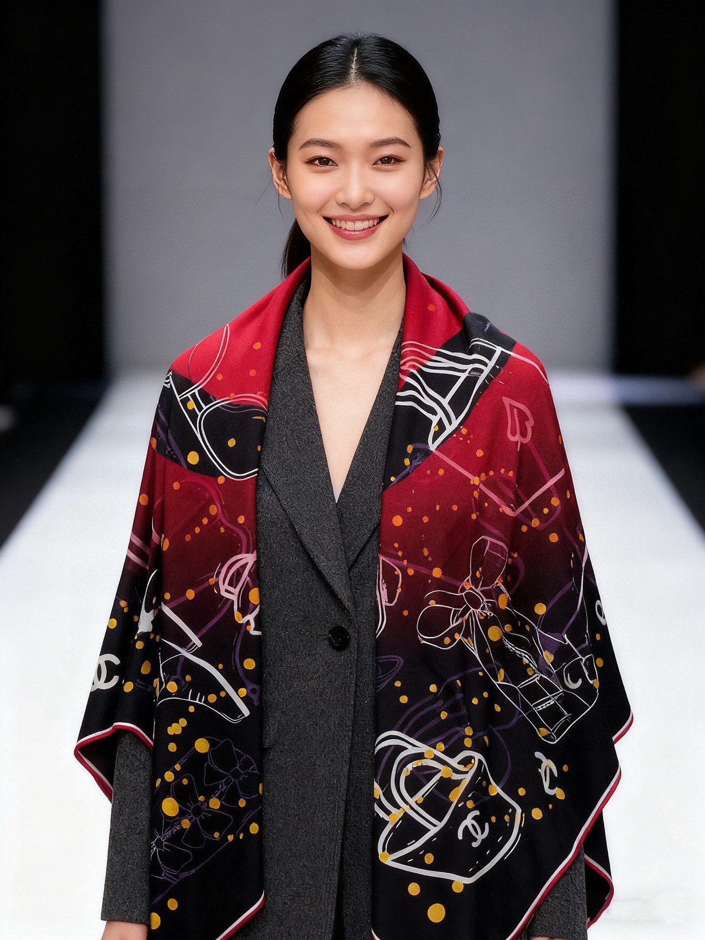 P230 2025秋冬高级成衣系列~Chanel 【140双面同色丝绒披肩】 此系列谱写一曲自由轻灵的赞歌 本系列作品创新演绎品牌的风格符号 尽显无拘无束的自信魅力 优雅浪漫的风格设计 成份:30%桑蚕丝70%羊绒 尺寸:135*135cm