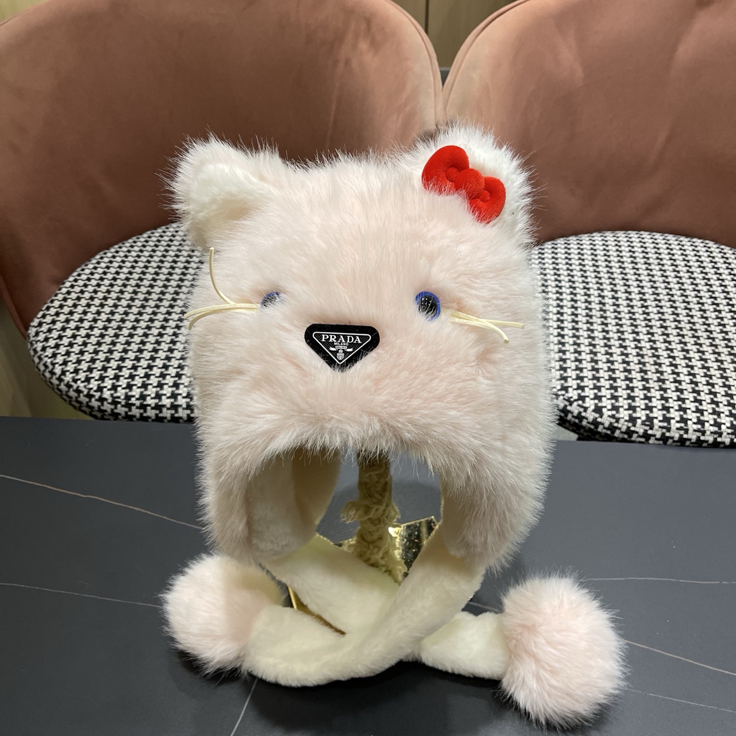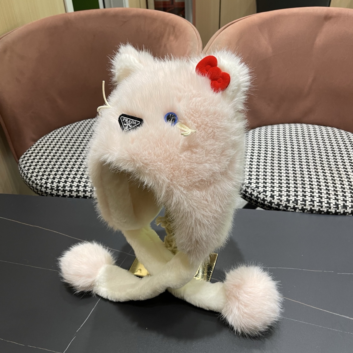 P125 普拉达PRADA可爱猫咪蝴蝶结毛绒帽子女冬季耳朵会动加 绒加厚保暖包头帽雷锋帽
