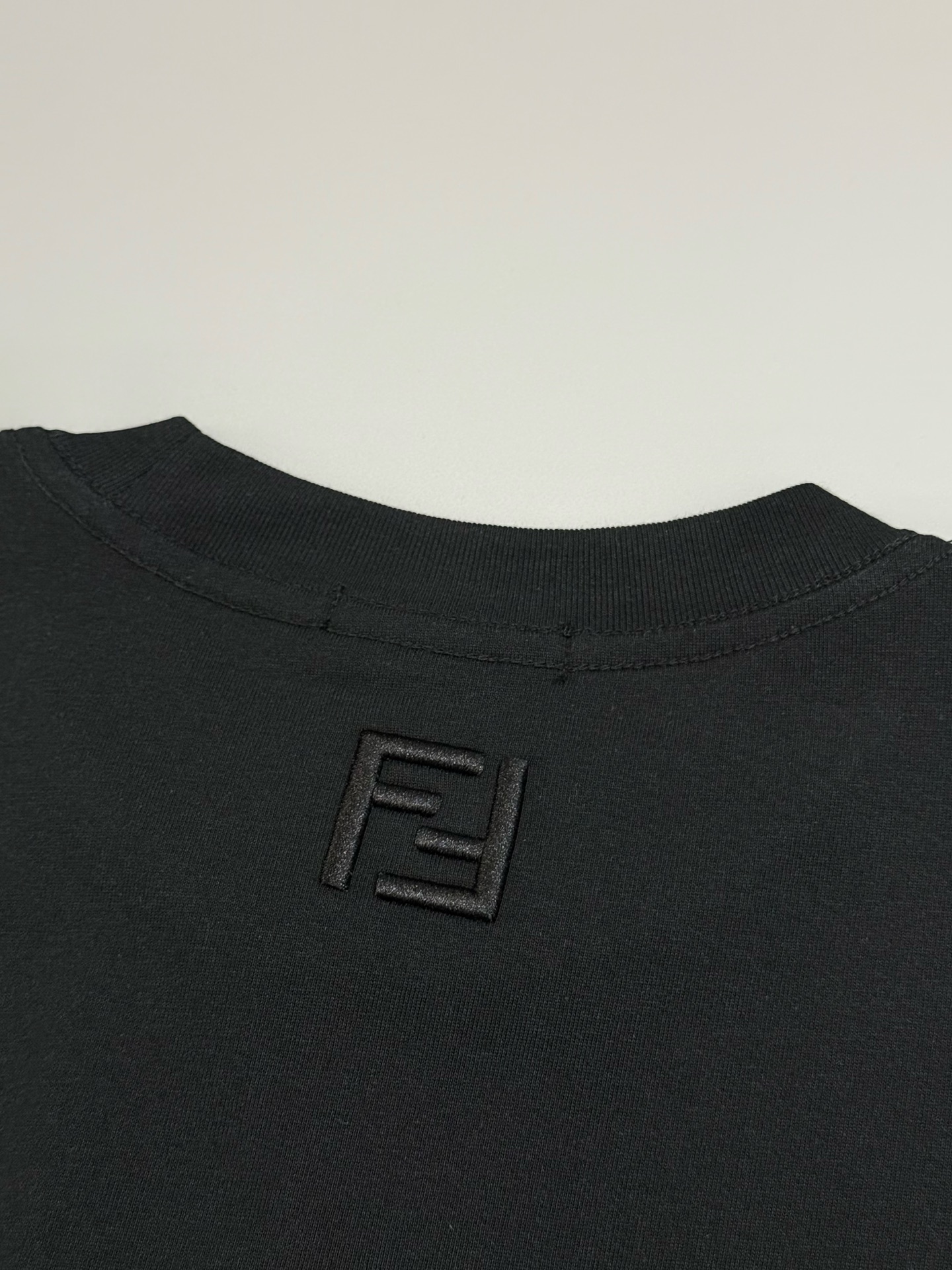 *胸部饰有撞色混合图案绣饰,图案中运用多种针法及设计,精美的刺绣和复杂的手工艺,精细的细节处理,造就了微感立体浮雕的刺绣效果。衣领背面饰有同色F标志绣饰。