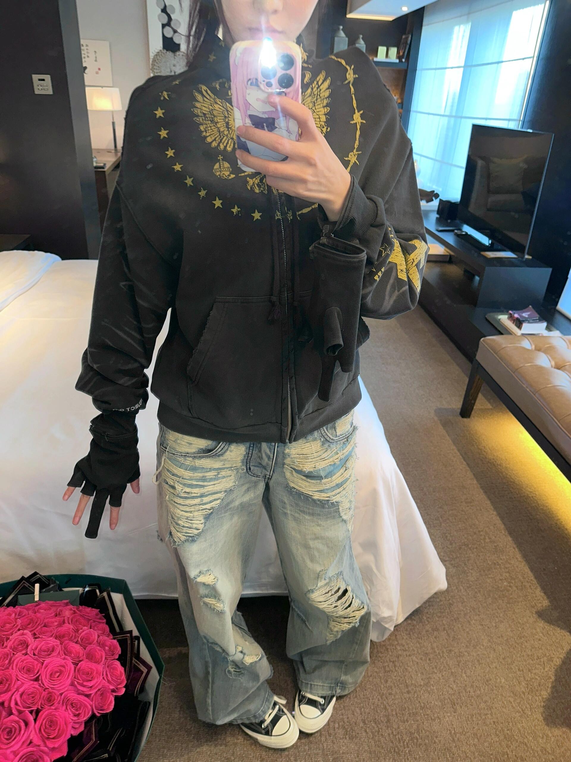🧸Grailz Projec双头鸟连肩二合一手套拉链开衫连帽卫衣男潮牌外套P183 款号:8630 码数:1码 2码 3码 颜色:黑色 红色 高版本440g面料 区别市面塑料涤纶以次充好 经多次洗水做旧 每件都是人工手绘工艺 定制双拉链 非常重工复杂款 耗时耗人工 成本自然高 火爆小红薯的一款连帽卫衣外套 Yb同款版型 一刀未改 男女胖瘦随意驾驭