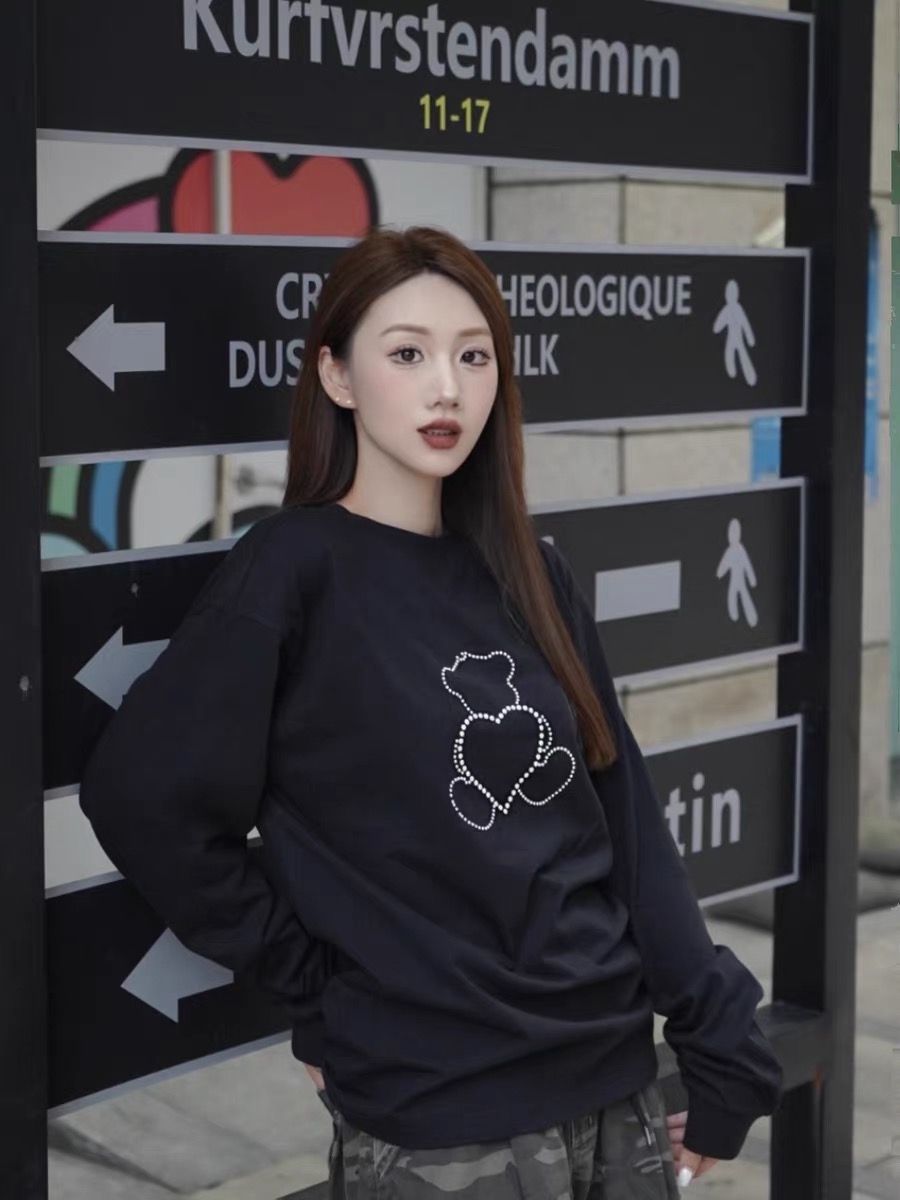 D78#💰 108 WELLDONE24SS官网同款可爱珍珠小熊情侣长袖T恤 对标原版面料、版型、细节 成衣经高温洗水定型 穿洗不变形 珍珠加固处理不易脱落 颜色:黑色、白色 码数:S、M、L
