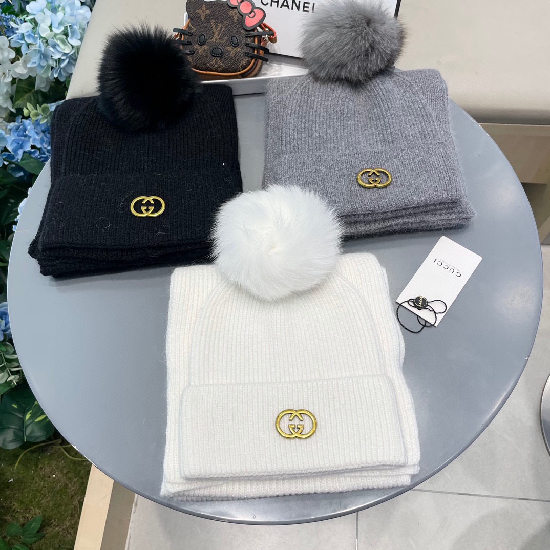 P170 古奇GUCCI经典套装帽子配狐狸毛球!帽子➕围巾!羊绒兔绒品质!暖暖哒超级舒服~这个冬天你就差这么一套套装帽子啦~又保暖又时尚!男女通用款!可以做情侣款!防伪标签吊卡齐全!多多款式,欢迎选择!!