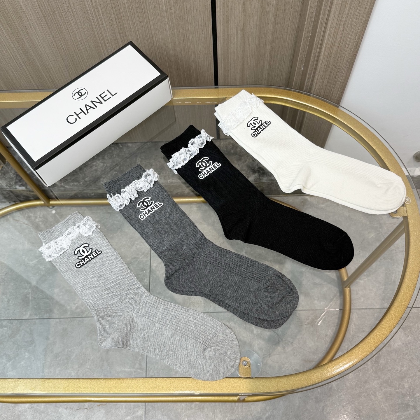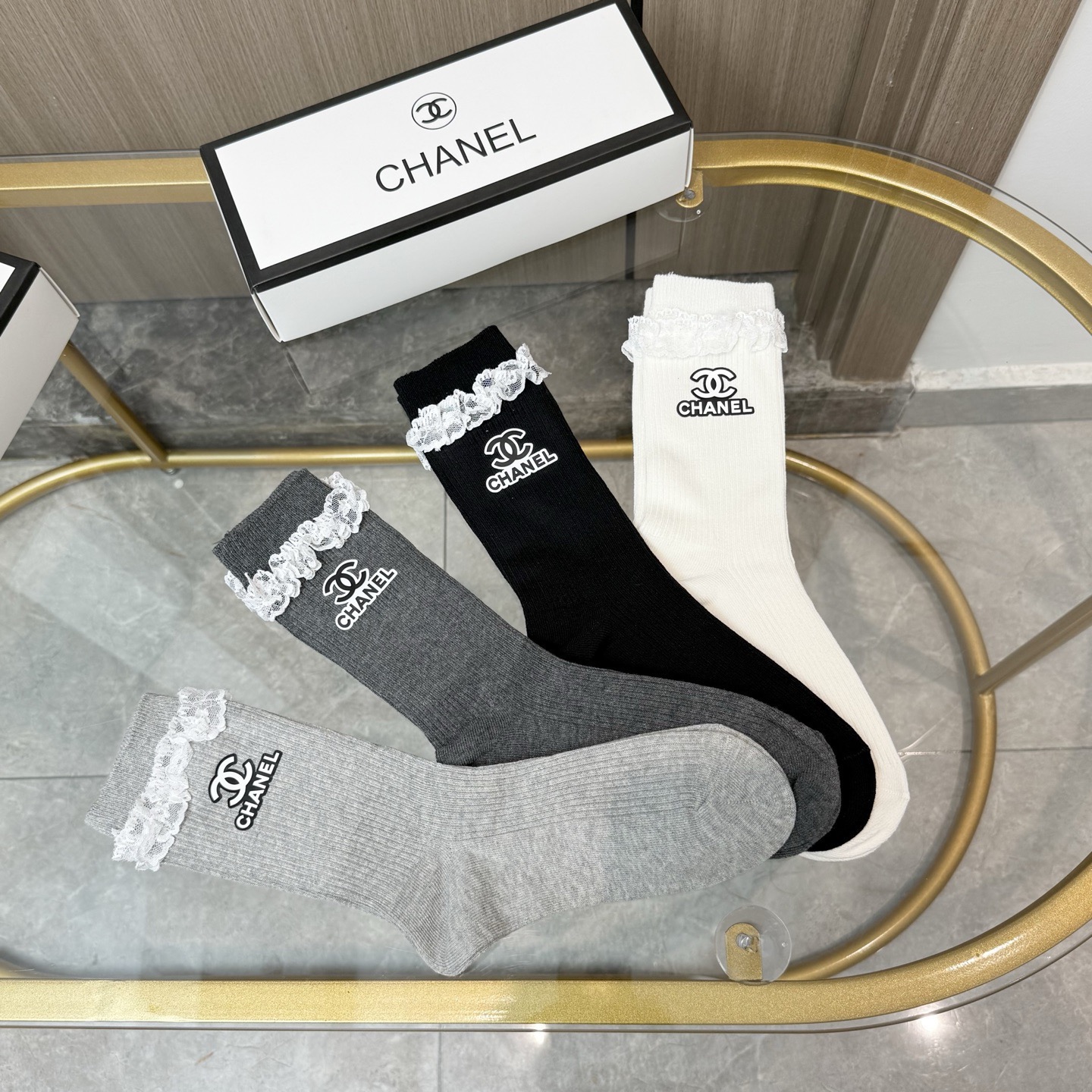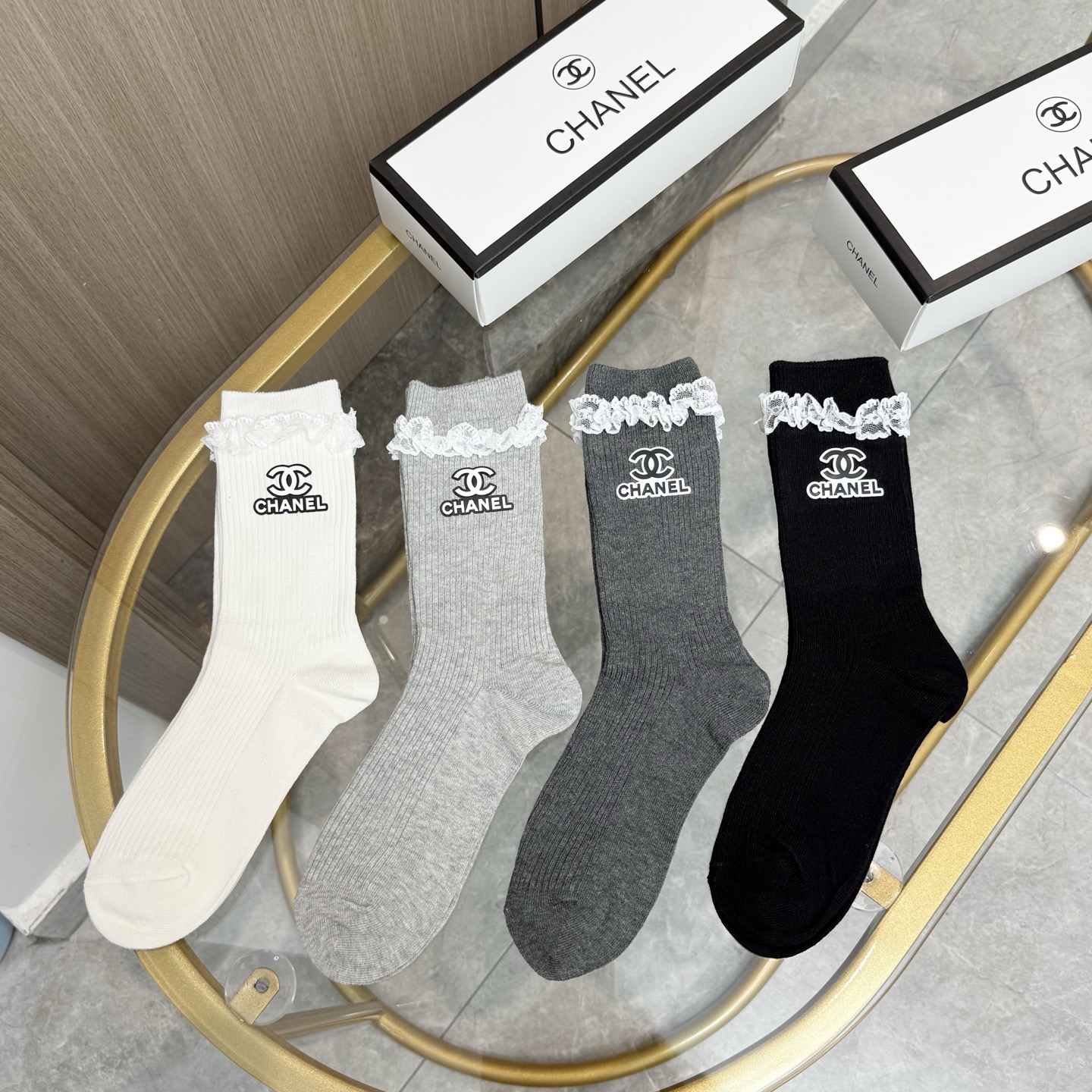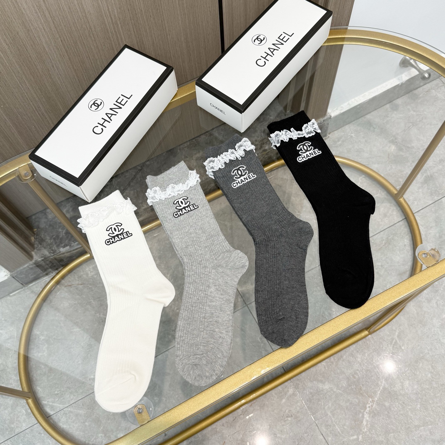 P75 配包装【一盒四双】CHANEL 香奈儿高版本 ~好看到爆炸 CHANEL 袜子🔥烫印中筒袜,超精致🔥🔥潮人必不能少的 CHANEL 专柜代购品质 中筒袜子 ,搭配起来超高逼格 时髦度爆表啊啊啊啊~~推荐推荐推荐~~必入时髦小单品!!!