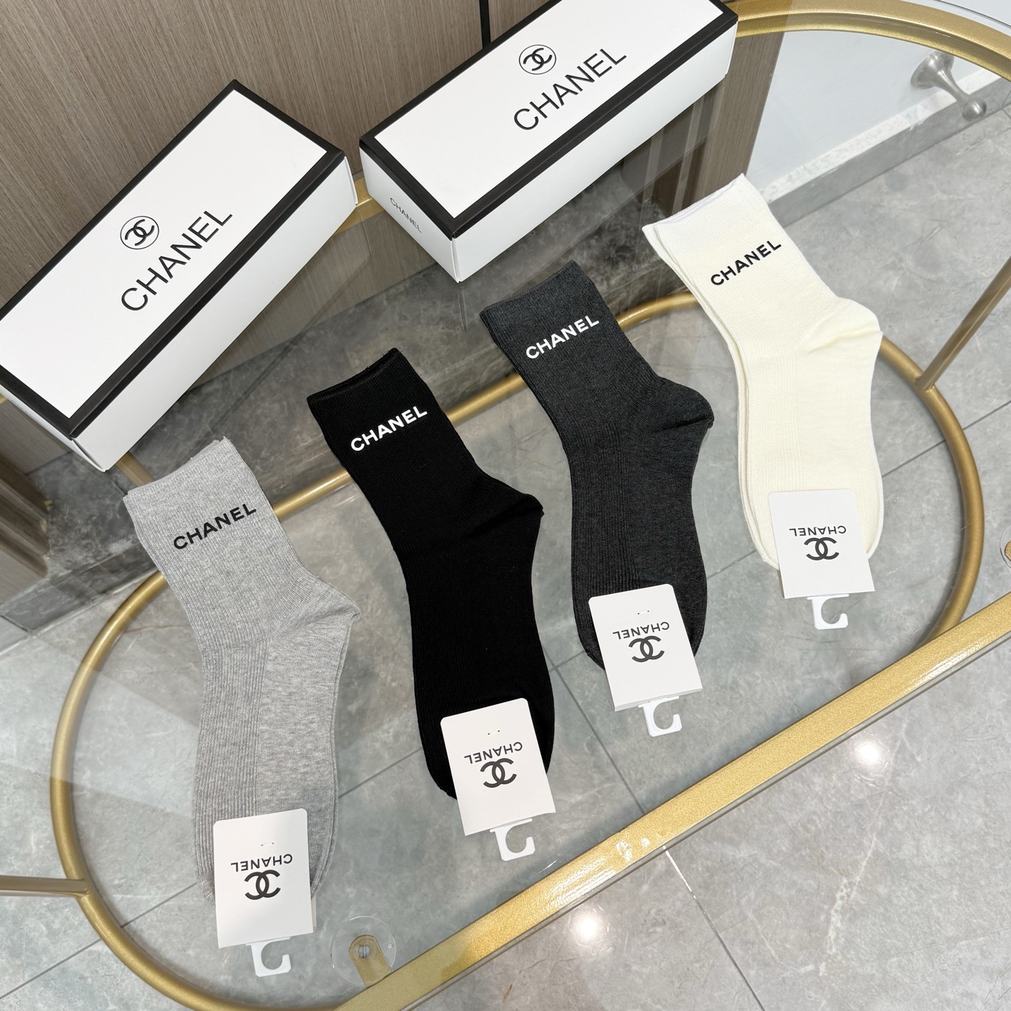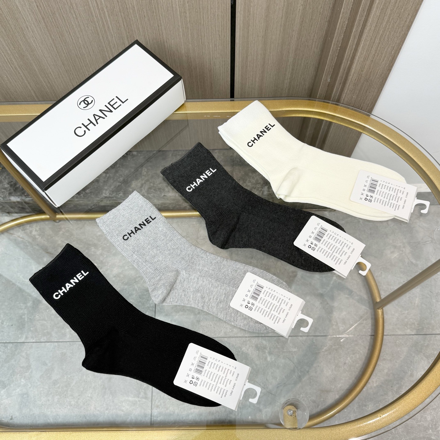 P65 配包装【一盒四双】CHANEL 香奈儿高版本 ~好看到爆炸 CHANEL 袜子🔥双针烫印中筒袜,超精致🔥🔥潮人必不能少的 CHANEL 专柜代购品质 中筒袜子 ,搭配起来超高逼格 时髦度爆表啊啊啊啊~~推荐推荐推荐~~必入时髦小单品!!!