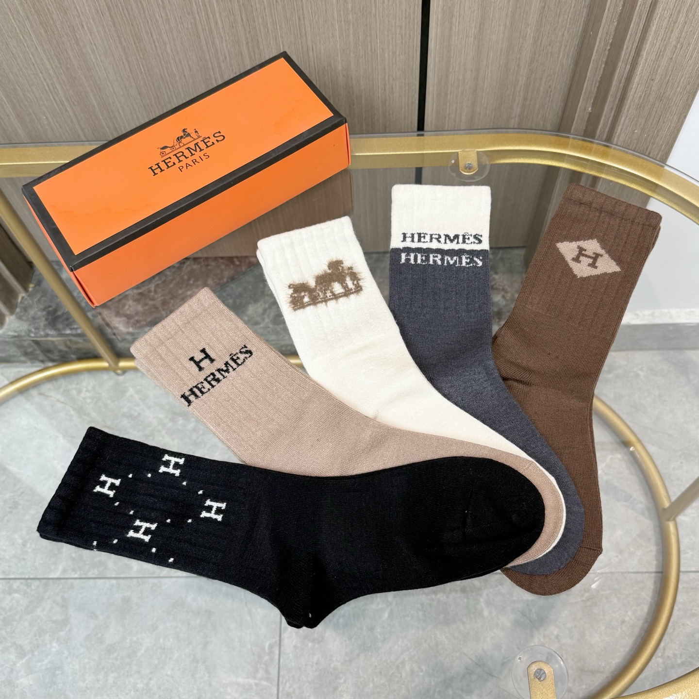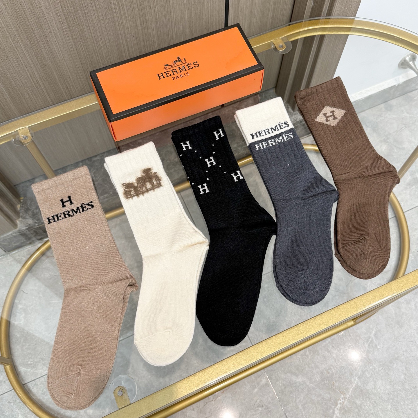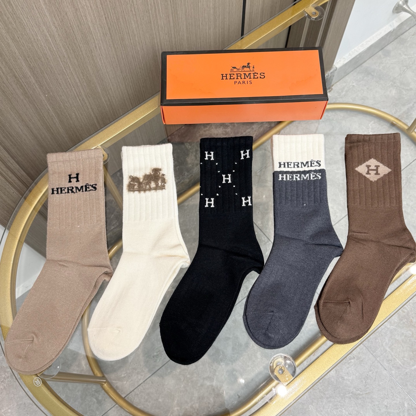 P60 配包装 【一盒五双】HERMER · 爱马仕经典中筒羊绒袜子❗️羊绒面料,专柜同步上新,袜身提花H品牌字母全称,罗口处提花H标志,特别吸睛,纯棉材质,上脚超柔软舒适,超火爆小单品,大牌出街,潮人必备🔥超好搭❗️