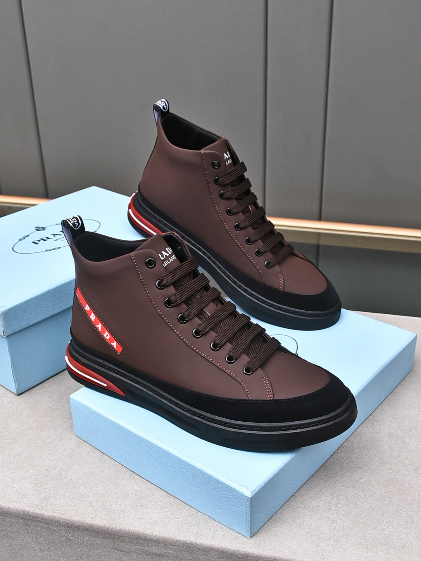 PP300【高帮普拉达】2023新款休闲男鞋,全新四季款设计,完美做工,打造装柜品质,鞋面:进口小牛皮接拼头层磨砂,全羊皮内里;柔软舒适,橡胶大底超轻 耐磨、简约、百搭风时装男鞋,码数38–44(45定做)