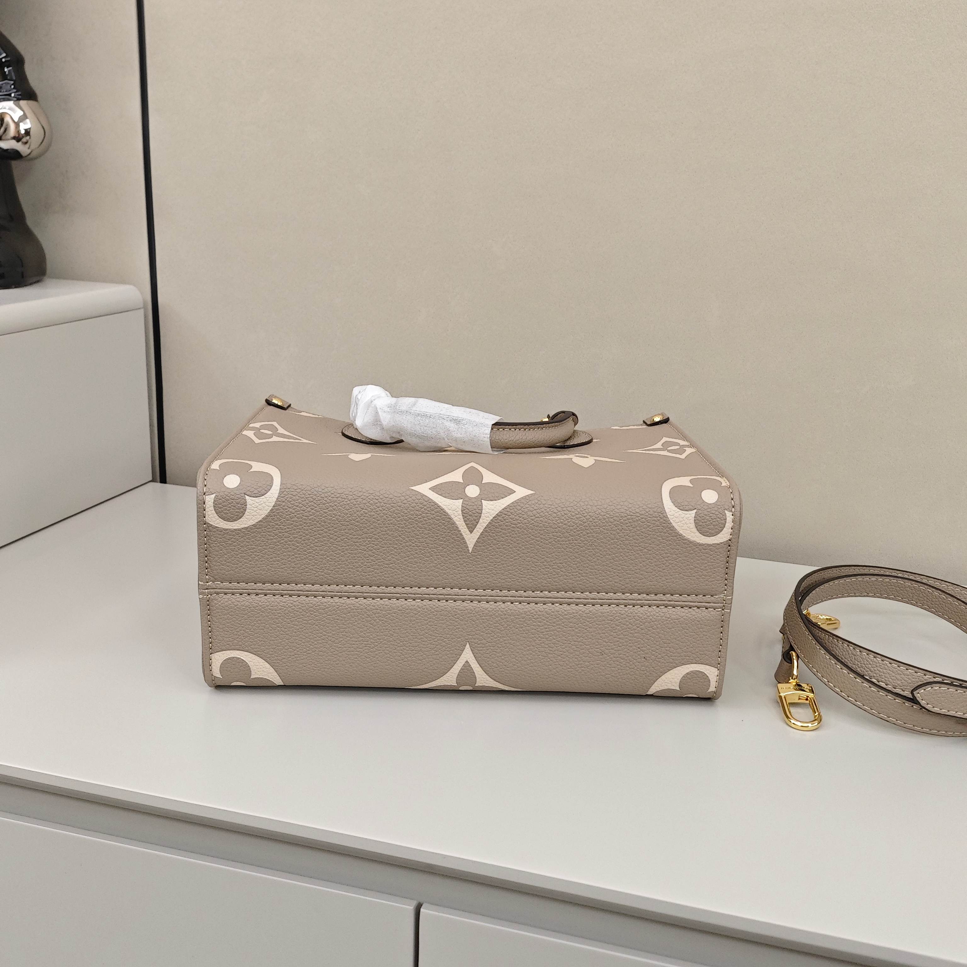 Lv onthego托特包💰280 尺寸:25×19×11.5cm 简介:开放式开合,内置拉链口袋,内部空间宽敞,可放下手机充电宝平板ipad等日常随身物品,搭配可拆卸长肩带,可手提/可斜挎背。