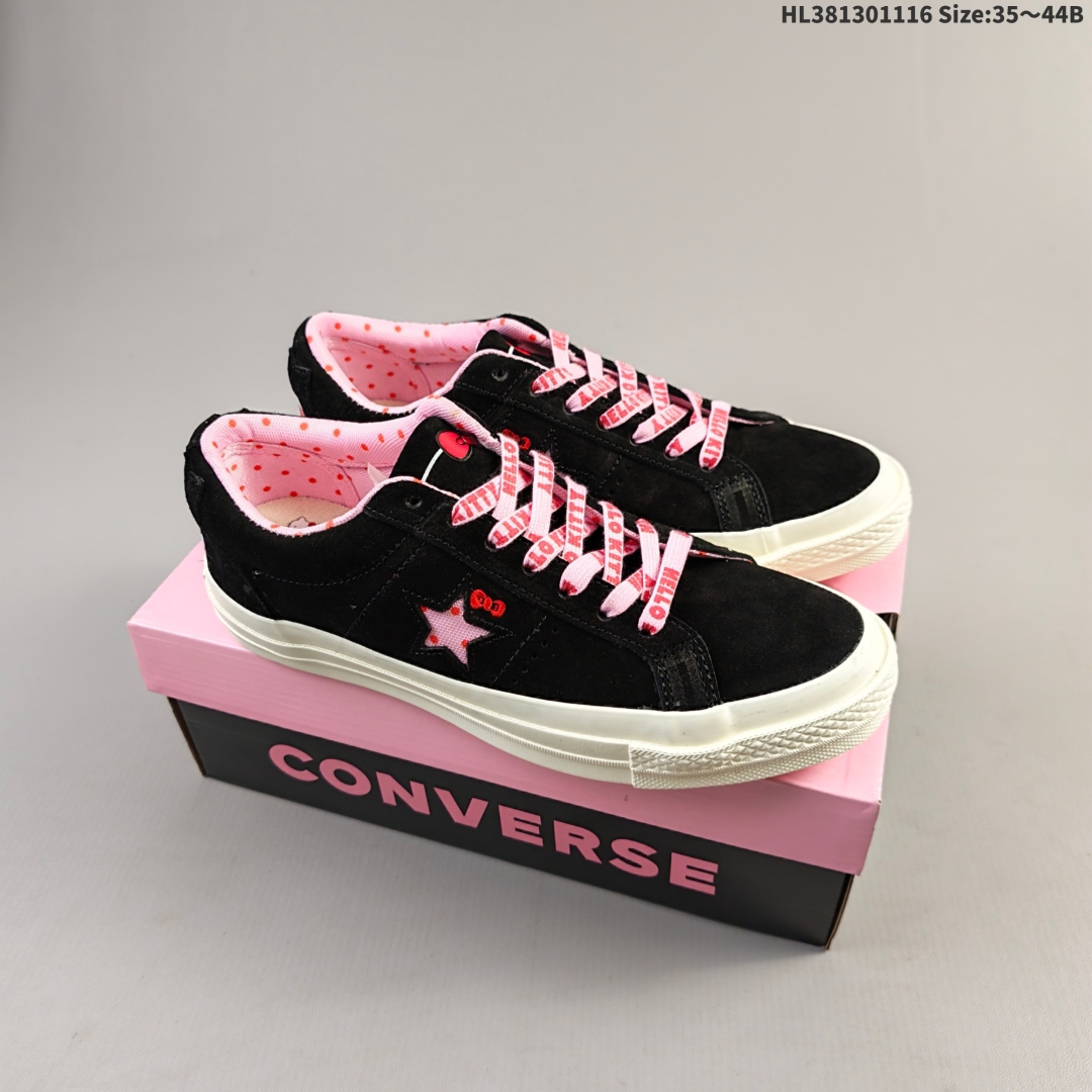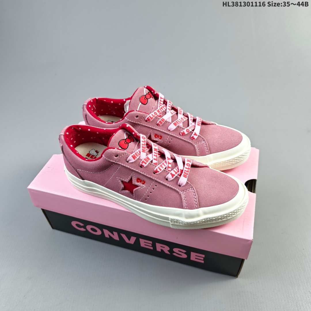 集合💰130 男女鞋真标硫化工艺#双层围条夹布防开胶工艺#OrthoLite欧索莱缓冲环保去臭鞋垫组合聚氨酯硅蓝PU减震❗萌到犯规,携手日本知名卡通 IP凯蒂猫《Hello Kitty》 x Converse One Star Suede Low"Prism Pink"一星古着系列经典低帮复古休闲百搭硫化板鞋“联名浅粉红凯蒂猫”362941C 尺码:35 36 36.5 37 37.5 38 39 39.5 40 41 41.5 42 42.5 43 44 主要以 Hello Kitty 形象搭配标志性粉色,鞋头处的小蝴蝶结、星星两侧的猫胡须这样的小细节更是可爱到犯规。Hello Kitty不注视你,反而像猫星人般好奇的凝望着街头上的人。HL381301116 Size:35~44B
