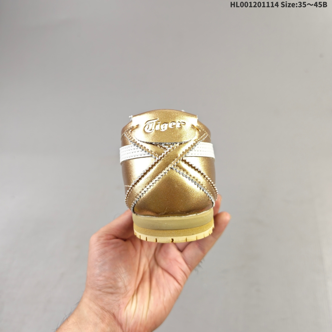 💰120 真标带半码 镜面❗️ Onitsuka Tiger Mexico 66 SD 阿斯克斯 鬼冢虎 低帮 金色镜面 男女同款 金属色彩舒适百搭防滑耐磨减震支撑低邦运动休闲鞋 Mexico 66运动鞋展现了60年代的复古外观,并带有现代风格,色彩和细节,使之焕然一新,凭借其传统外观和标志性设计效果,Mexico 66款式为任何休闲装带来永恒的时尚气息;凭借其传统外观和标志性的设计效果,Mexico 66型号为任何休闲装增添了永恒的风格。鬼冢虎在全球范围内收到热烈追捧,旗下的Mexicod 66系列,既舒适又时尚,让人无法抗拒。 货号:1183C468-200 尺码:35 36 37 37.5 38 39 39.5 40 40.5 41.5 42 42.5 43.5 44 44.5 45HL001201114 Size:35~45B