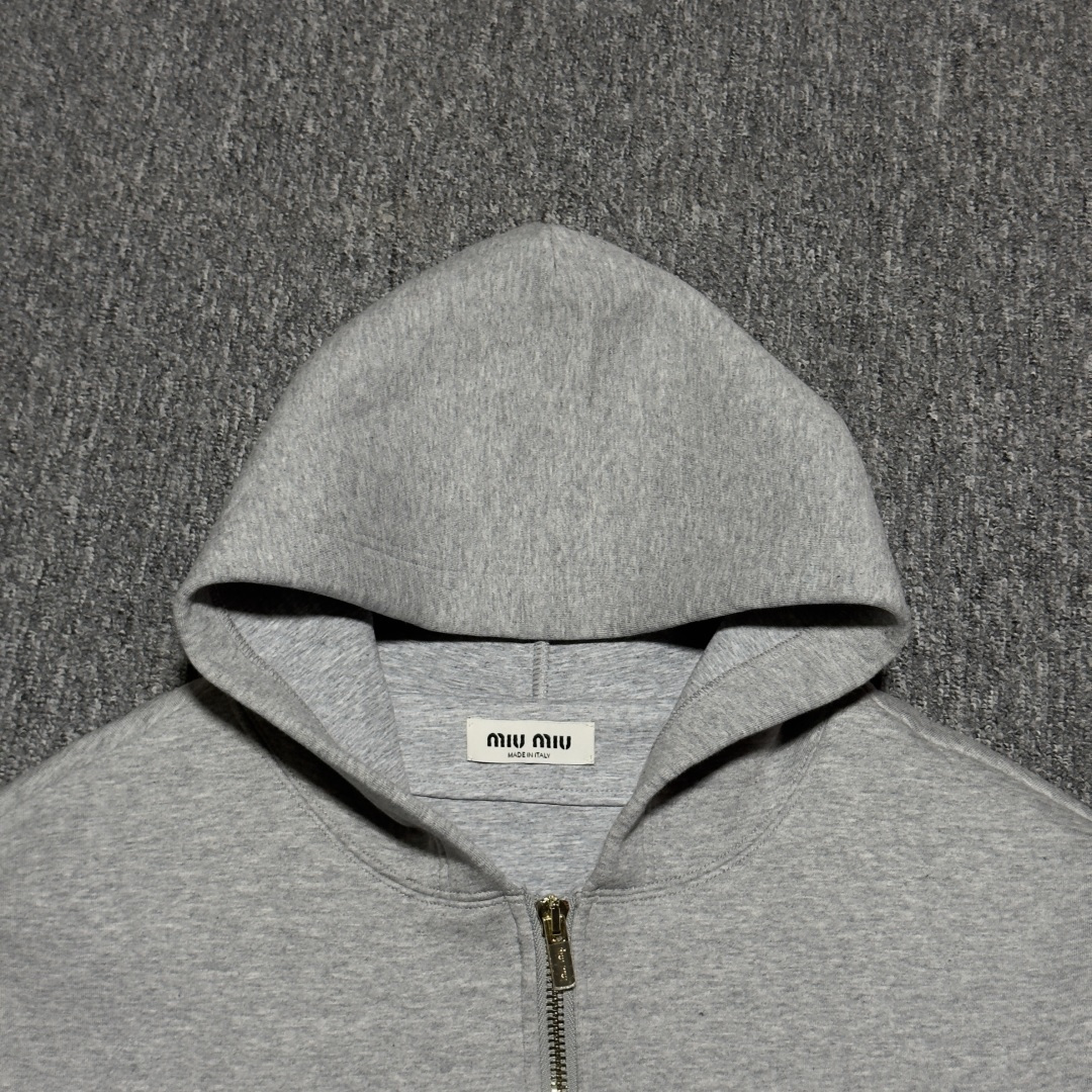 💰450 S# MiuMiu 缪缪 花灰拉链连帽外套 真正原版购回开发打版 高端零售专供 品质保证 100%放心出街 尺码:S M L XL 编号:50PGTU82 原版价格参考:1.7W Miumiu这款立挺外套热度高的可怕 搭配点拉满 奈何就是原版价格经不起考验 现在找我零头拿下 细节报备完整 放心冲 开发周期:6个月 原版去年10月份专柜购入 到手就开始研发面料特性 主面料380克重定制花灰纯棉,复合280克反面内里,中间使用100克布帛衔接,整件克重达到760, 此款难点毋庸置疑就在于花灰面料色泽 以及成型之后的成衣立挺感 这两者细节息息相关 耗费了我近两个月的跟厂打版 难度非常大 为了做这款衣服自购一台特种机,市场其他所有版本miumiu缝线都不整齐或者使用激光烧花,激光烧花工艺会导致面料边发黄发硬 此件面料采用三层工艺,拉链采用瑞士牙riri拉链,非常昂贵,内里领口,侧面,下摆全部手工走线 全衣90%部分都是采用高密连环锁针工艺,高克重面料需要紧密针车才能更好固定 市场版本这三个地方全是简化工艺,整件衣服非常重工,出货非常难 独家原版定制三标辅料