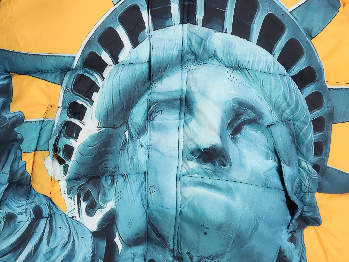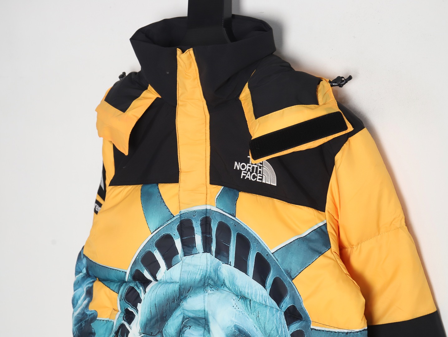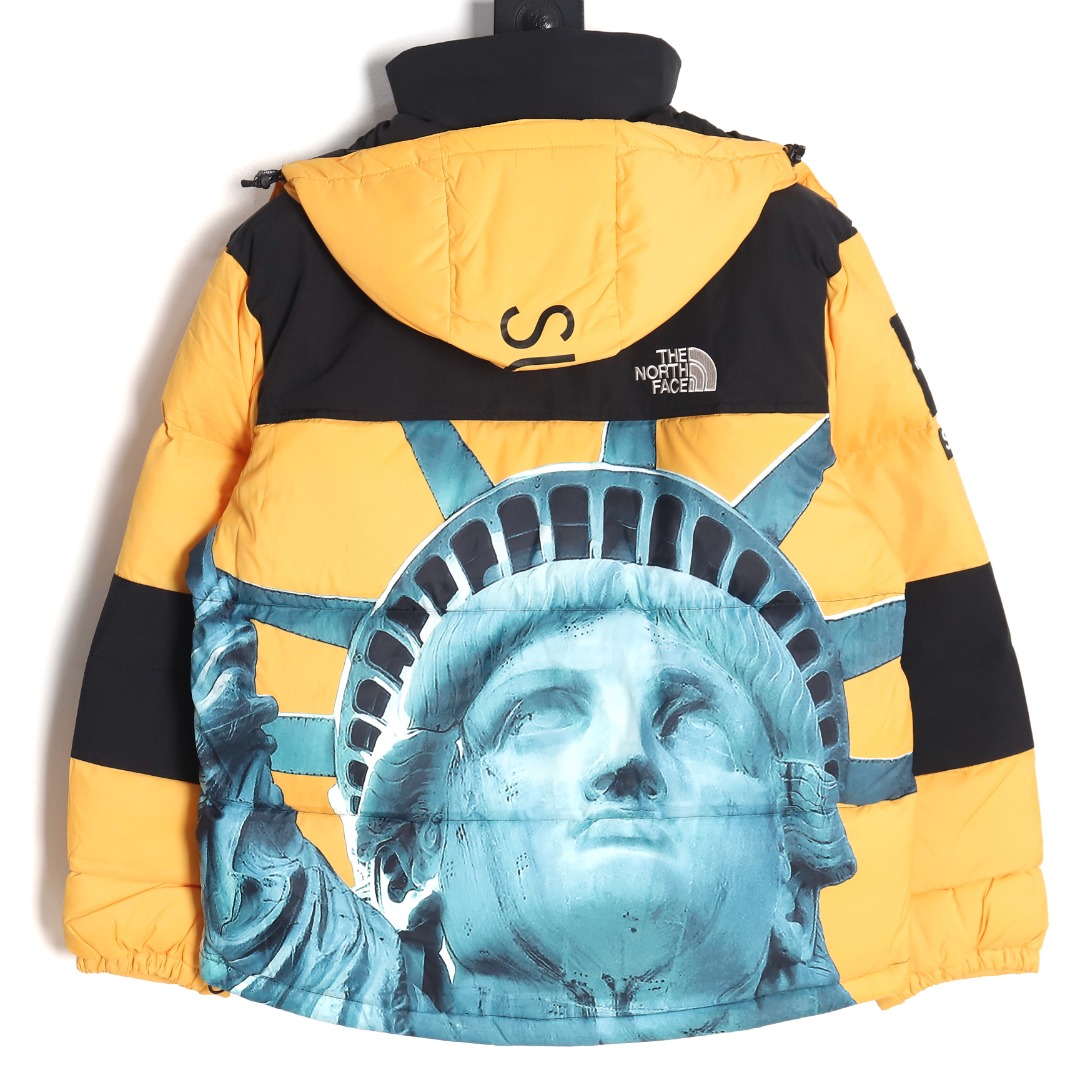 The North Face x Supreme 北面TNF SUP 联名自由女神羽绒服 这两家联名的款式,无一例外!全是炸款!无论是潮流属性还是户外功能,全方面满足你的只有这两个品牌的联名,这点我就不做过多阐述了,你们都懂!看似中规中矩!实则上身无敌!因为你要了解 羽绒服表层是很薄很薄的面料,几乎透明 必须要做成 成衣后,内里胆布“”打底“”两层面料叠加之后 才可以衬托出最完美的效果 裁剪的话,因为这款印花也是整体对位的,所以需要激光定位裁剪领标作为新款,也是全新升级,所以全套开模定制!领标作为新款,也是全新升级,所以全套开模定制!关于充绒这款用:国标90白鸭绒!蓬松度,保暖性都做到极致!今年魔术贴采用日本外贸公司面料100%定制而成防泼水面料处理 面料手感完全一致 依旧采用流水线车工制作印花还是老的配方老的味道激光裁布精准对位已是炉火纯青刺绣使用田岛刺绣机刺绣12针进口机器刺绣前幅后幅均为8734针进口单股纯白珠光线让图案立体内里羽绒内胆900密度双层胆布附带防跑绒涂层保持羽绒版型同时保证干洗后羽绒不走位 辅料全部正品YKK拉链 G1 尺码:S-XL