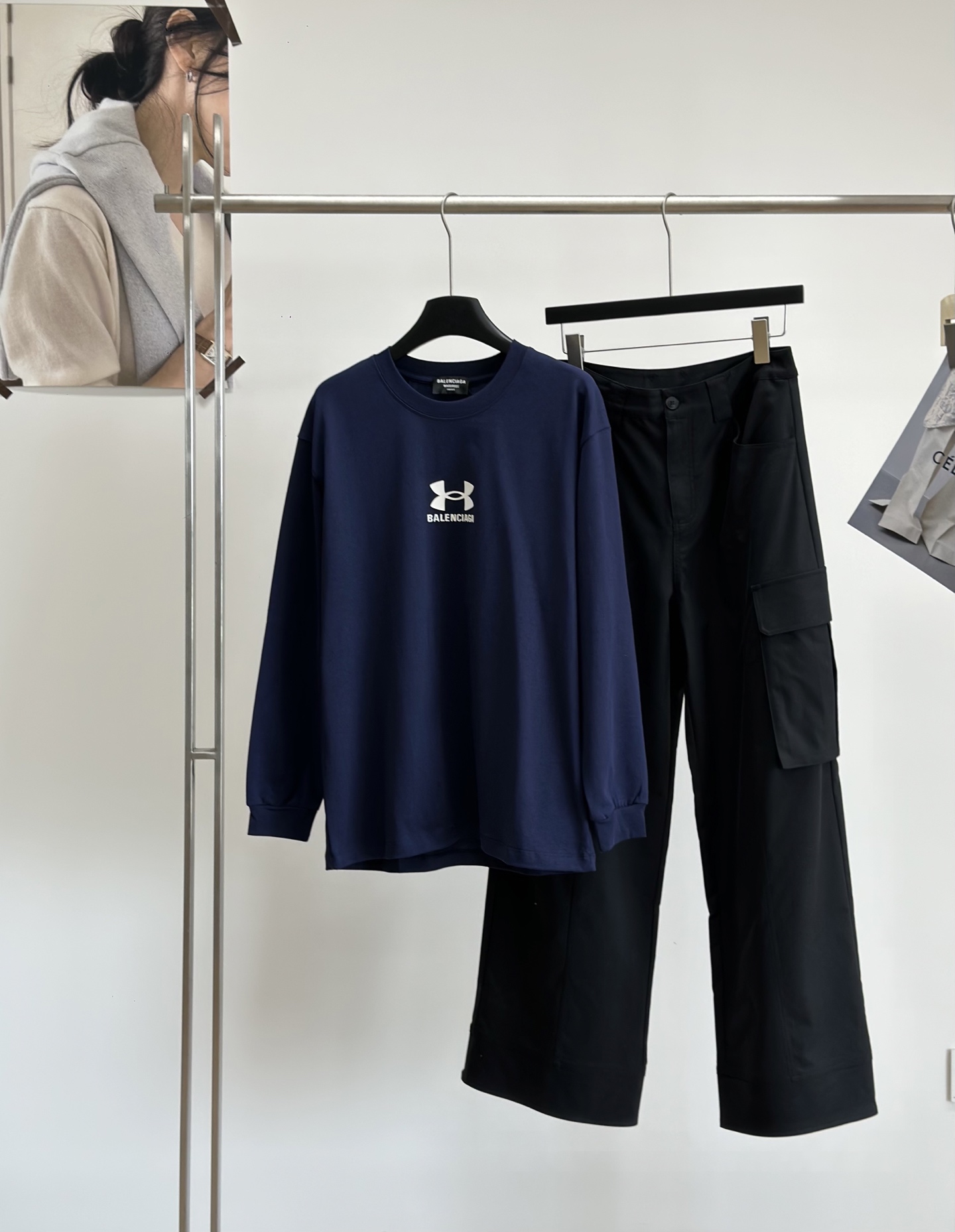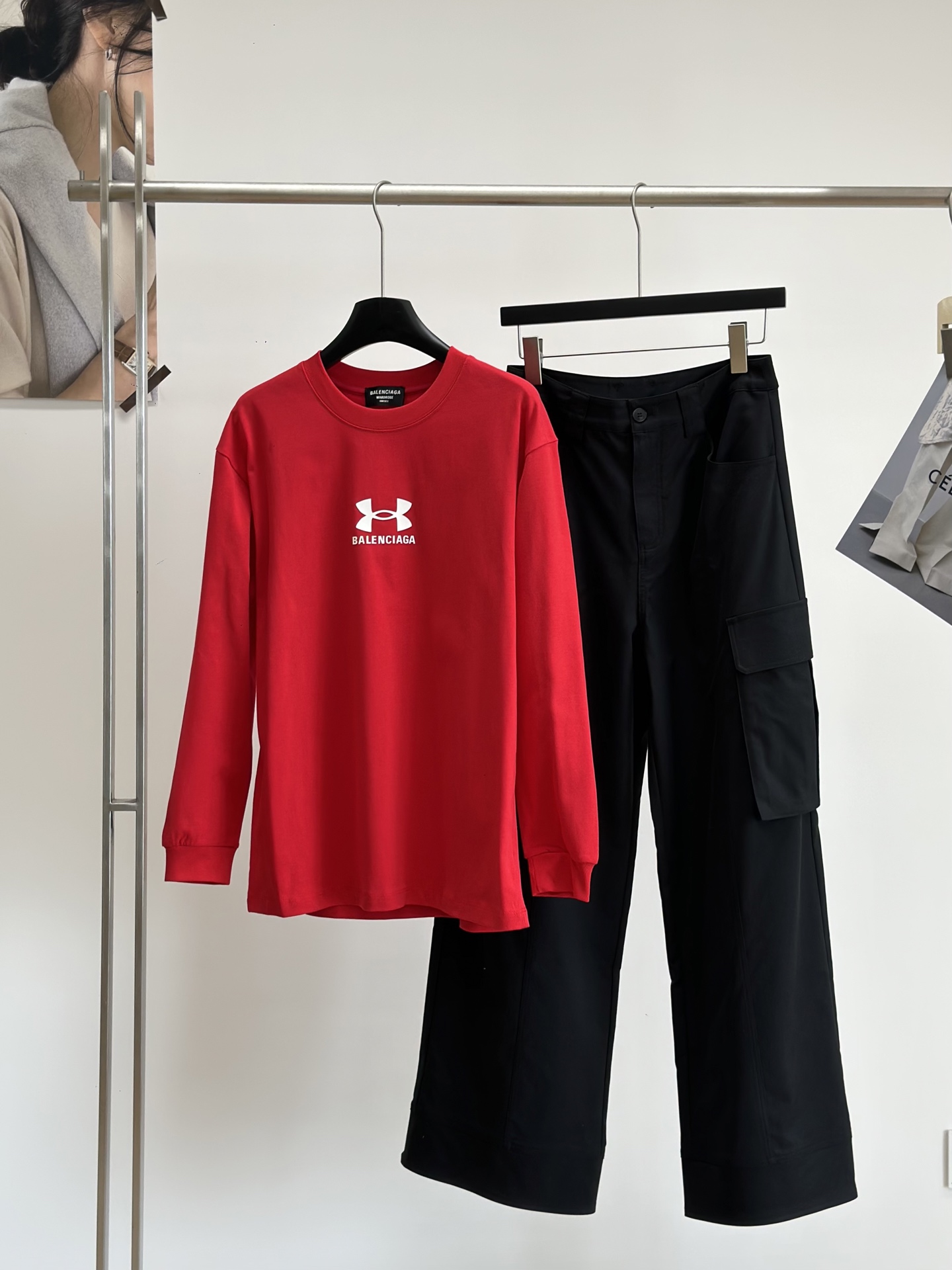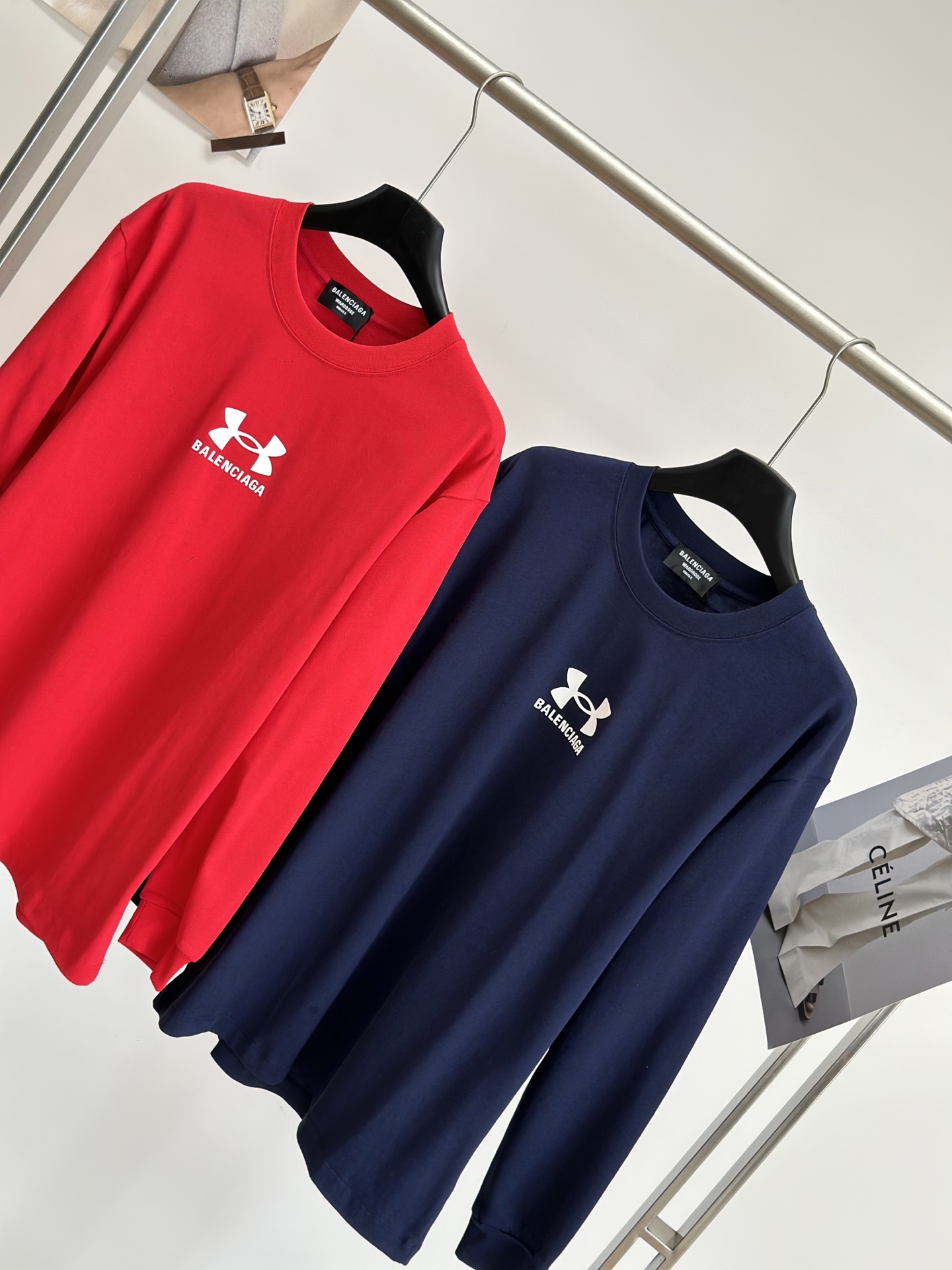 【安德玛联名长袖T恤】💰P120 专柜最新款! 官网上新!! 专柜同步🔥高品质🔥高版本 2025最新款官网同步 ⚠️⚠️1:1复刻级别 随意对比 高版本 【新款上架】 全新秋装🍂 BALENCIAGA巴黎世家X安德玛 立体凸胶 双纱300克长袖 2025秋冬最新款圆领时尚长袖T恤 官网同步,专柜纯棉面料! 贴肤舒适,耐看又好穿, 经典简约标志性logo设计 手感非常舒服 最新砖柜同步 落肩版型 时尚又个性 超级百搭好看的一款 男女都非常合适 人手必备款 吊牌 领标 水洗麦 三标齐全 超级亮眼 时尚感爆棚❤️❤️ 手感非常舒服 质感超强 时尚又个性 超级百搭好 颜色:红色 藏青 尺码:XS- S- M- L (宽松版型 男女都可❤️❤️) XS肩宽48胸围102衣长68袖长56 S肩宽51胸围108衣长71袖长57 M肩宽53胸围114衣长74袖长58 L肩宽56胸围120衣长78袖长60