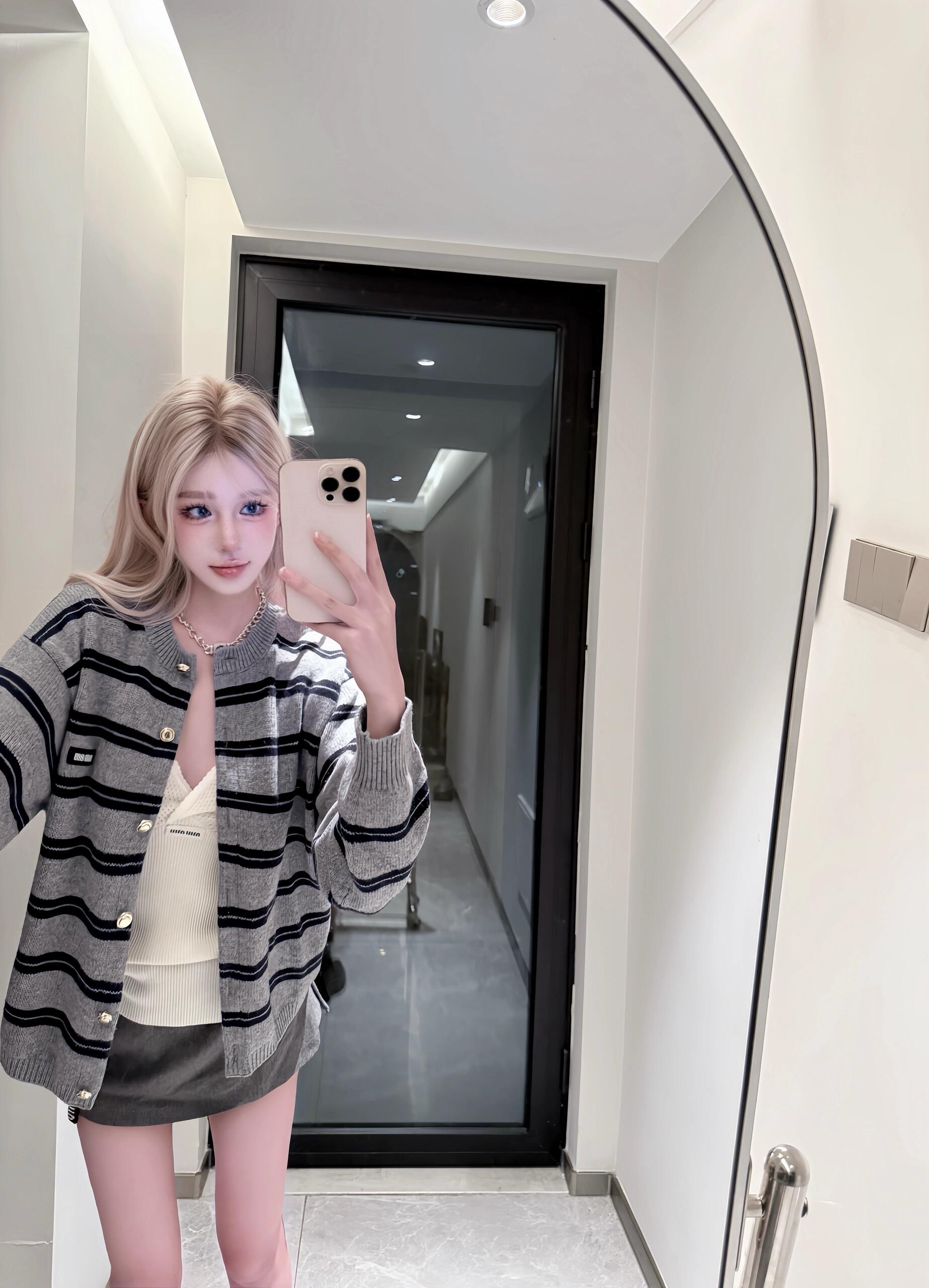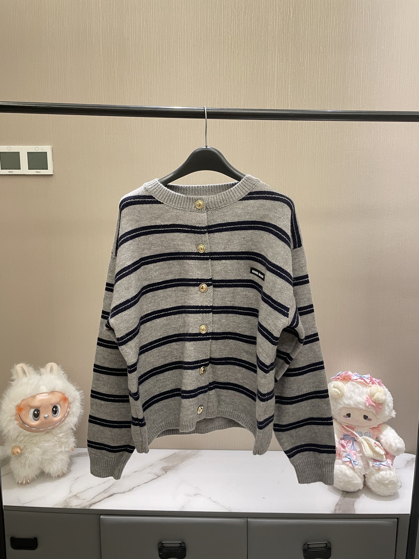 💰145 miumiu黑灰条纹开衫 单穿或者里面搭配个小吊带当小开衫都可 叠穿也是得ok 看似基础却能通过简单搭配穿出多种风格 灰色与黑色配色复古开衫没人不爱吧 自带学院风fan 经典不过时的拼色条纹元素 胸前字母logo点缀 溢出屏幕的青春活力少女感 尺码:SM S M 衣长 58 59 胸围 112 114 肩宽 53 54