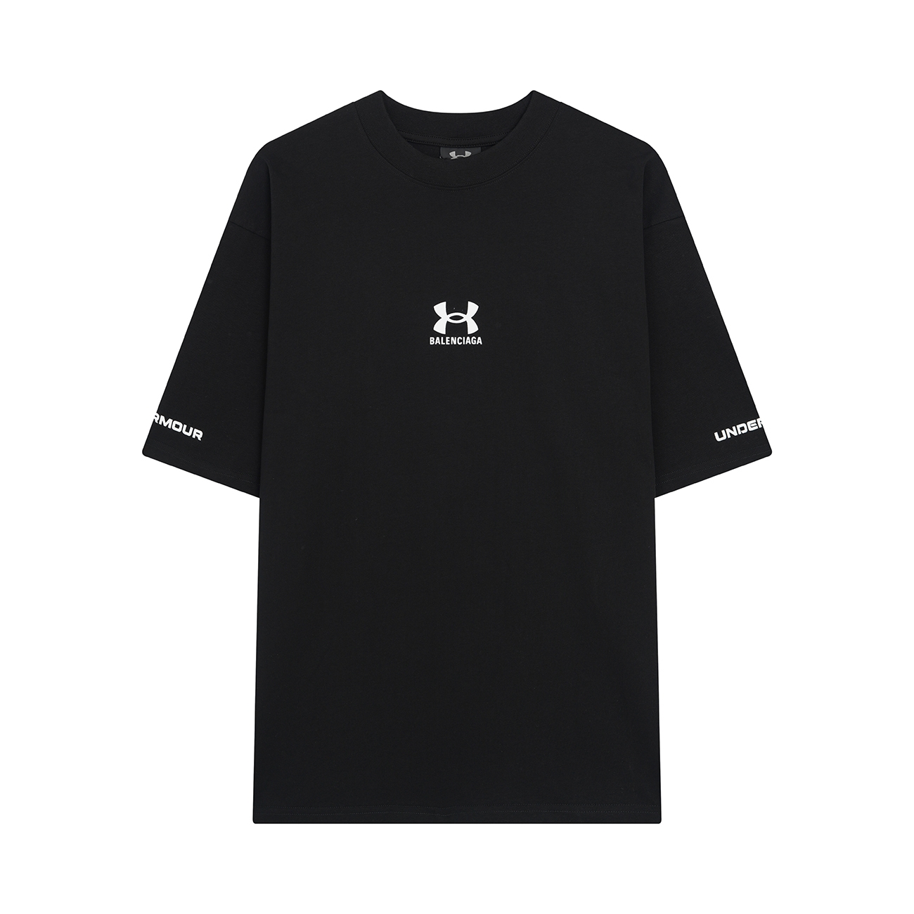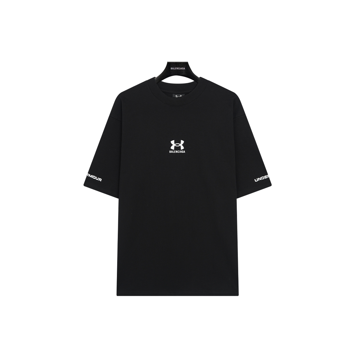 巴黎世家Balenciag 安德玛侧标印花联名短袖💰P80 进口椭圆机胶浆印花 有在还原正品细节真的是用尽心机 面料采用32S双纱精梳棉 厚感度十足 螺纹 袖口 下摆 大货三标齐+码数贴+带Logo防尘纸 尺码:Xs-L 颜色:黑色