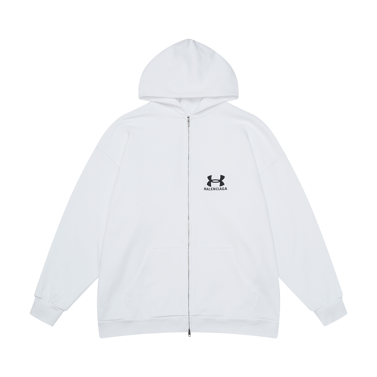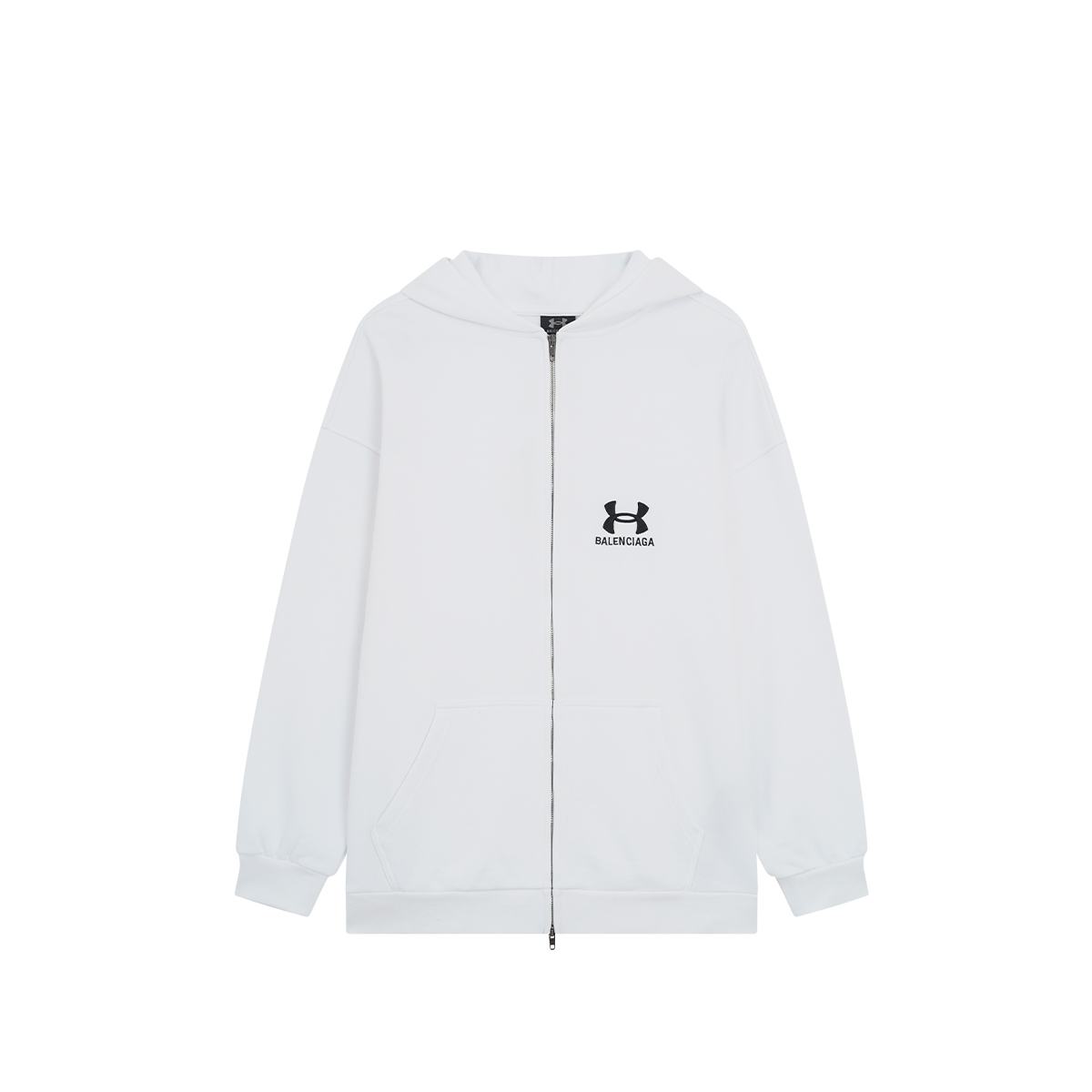 巴黎世家Balenciaga 安德玛联名刺绣拉链卫衣💰P165 采用双股全棉420g面料 刺绣为进口田岛万针刺绣工艺 厚感度十足 还原正品绣花饱满立体 内插袋使用本布 区别市场滤布面料 大货三标齐+码数贴+带Logo防尘纸 尺码:Xs-L 颜色:白色