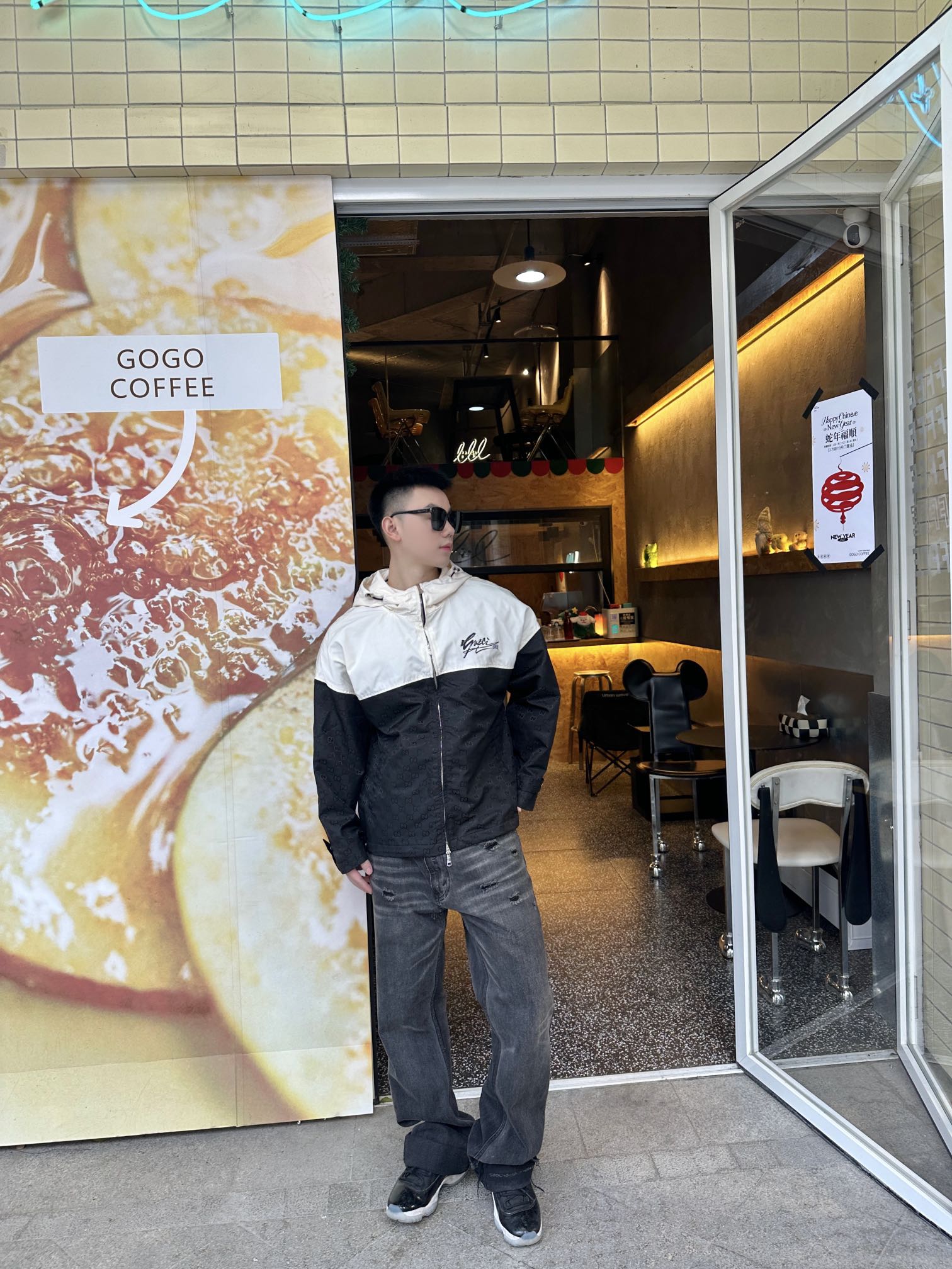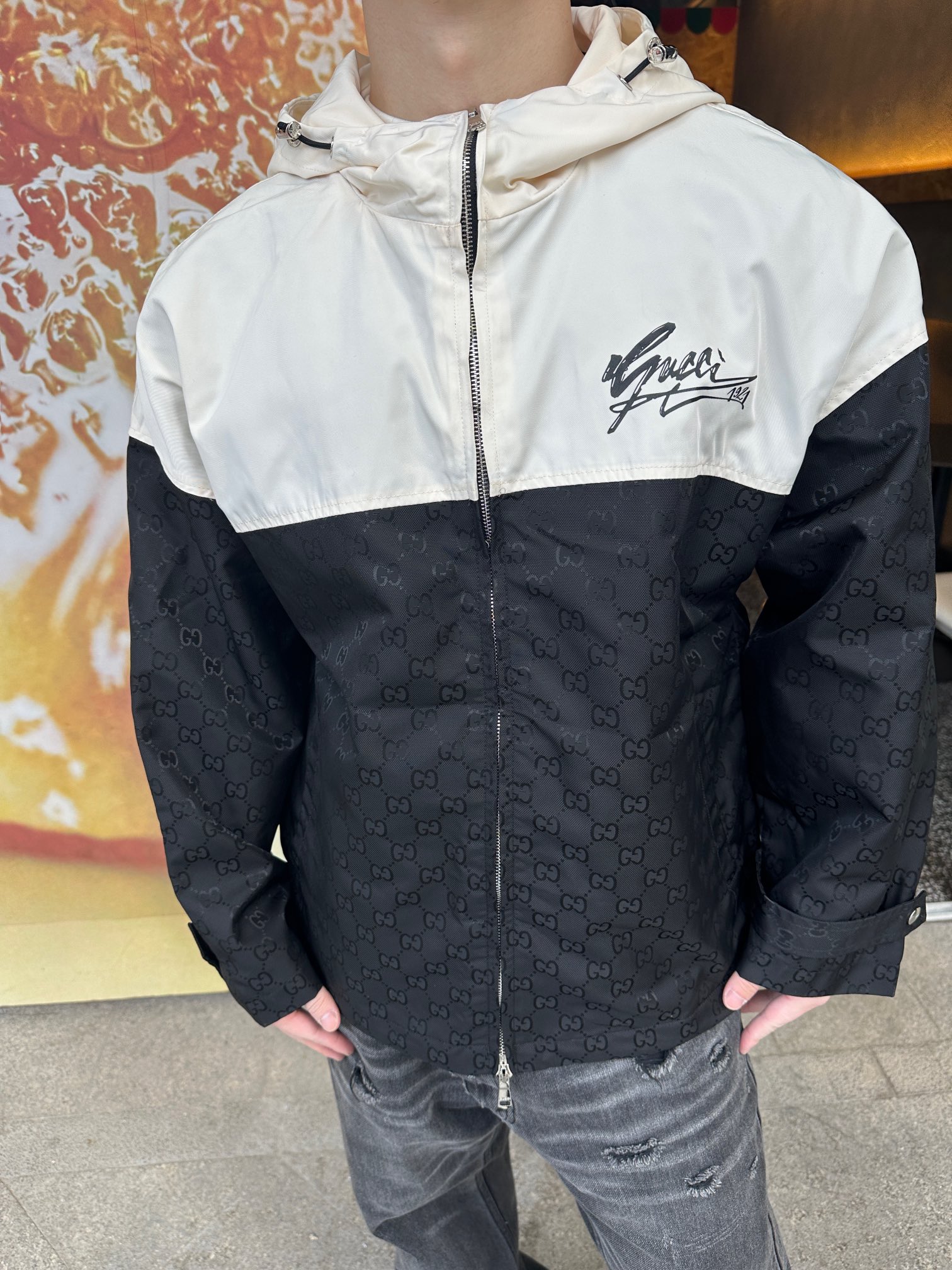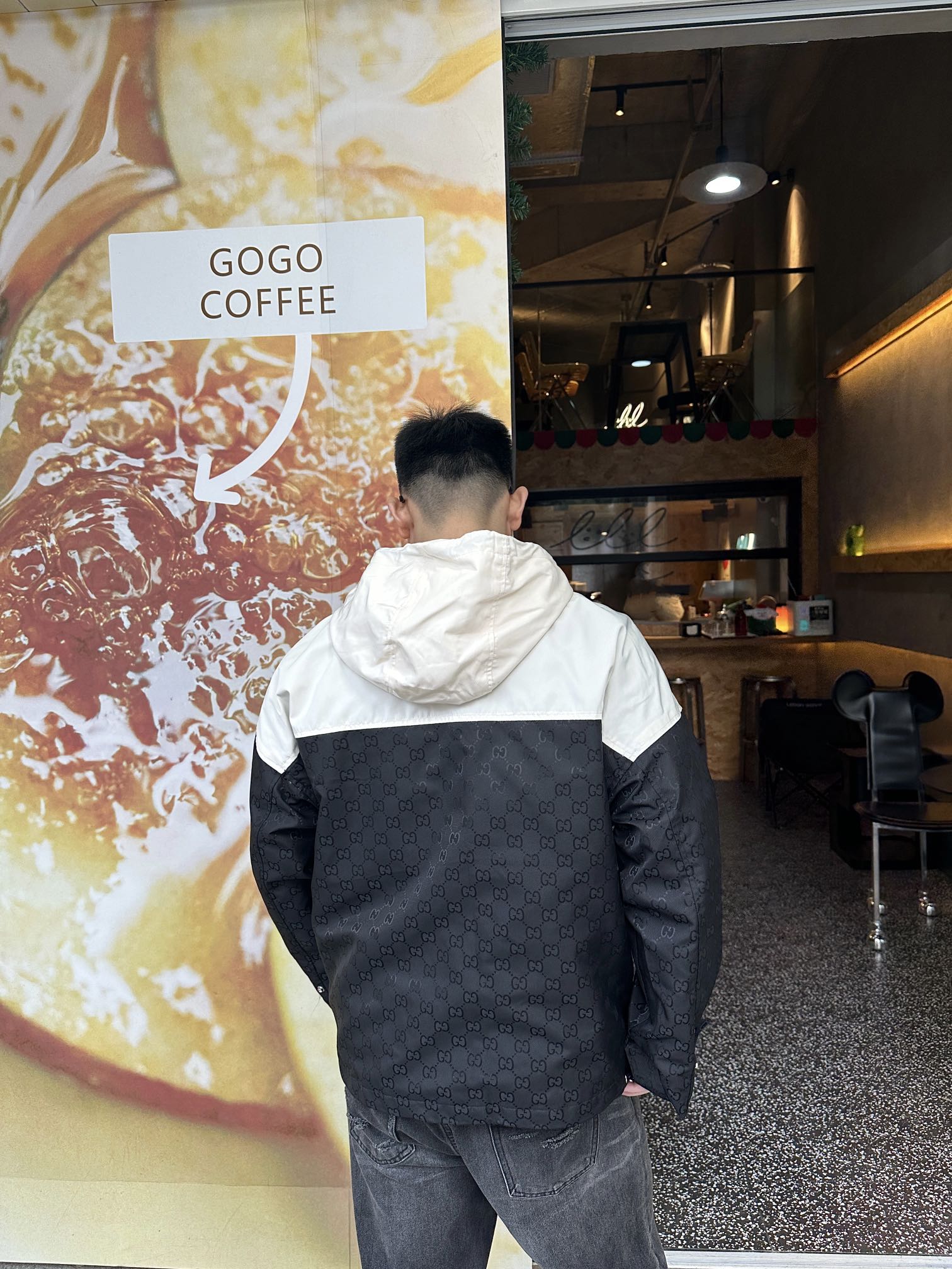 GUCCI/古驰 拼接印花LOGO连帽风衣外套 上身效果#