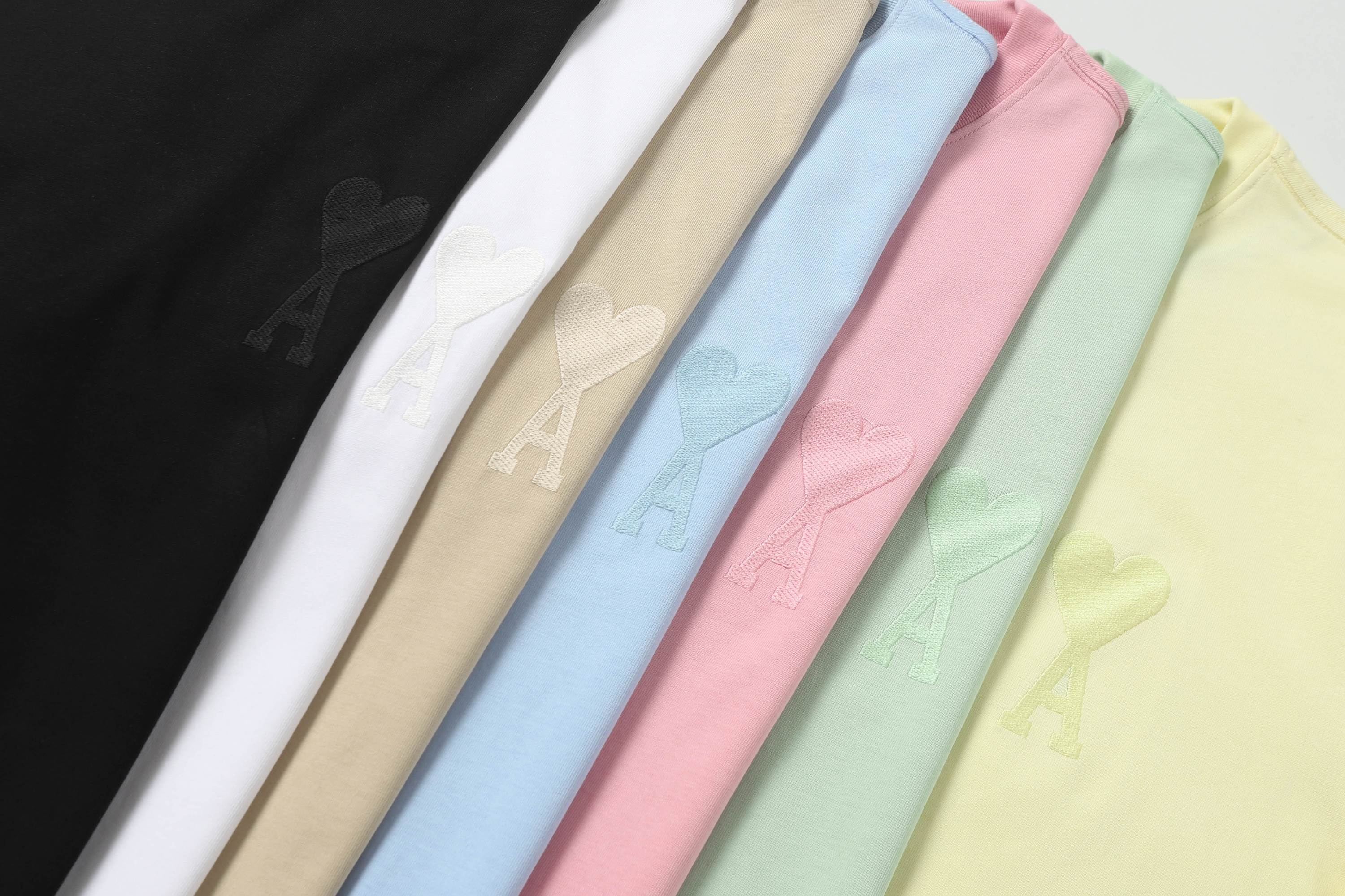 P62 款号:601 AMI春夏短袖系列~ 重磅厚实高克重 100%双纱棉270克重 细节到位 质量过关 支持对比 S-XL 四个码数 颜色:粉色,黄色,天空蓝,苹果绿,黑色,白色,卡其色