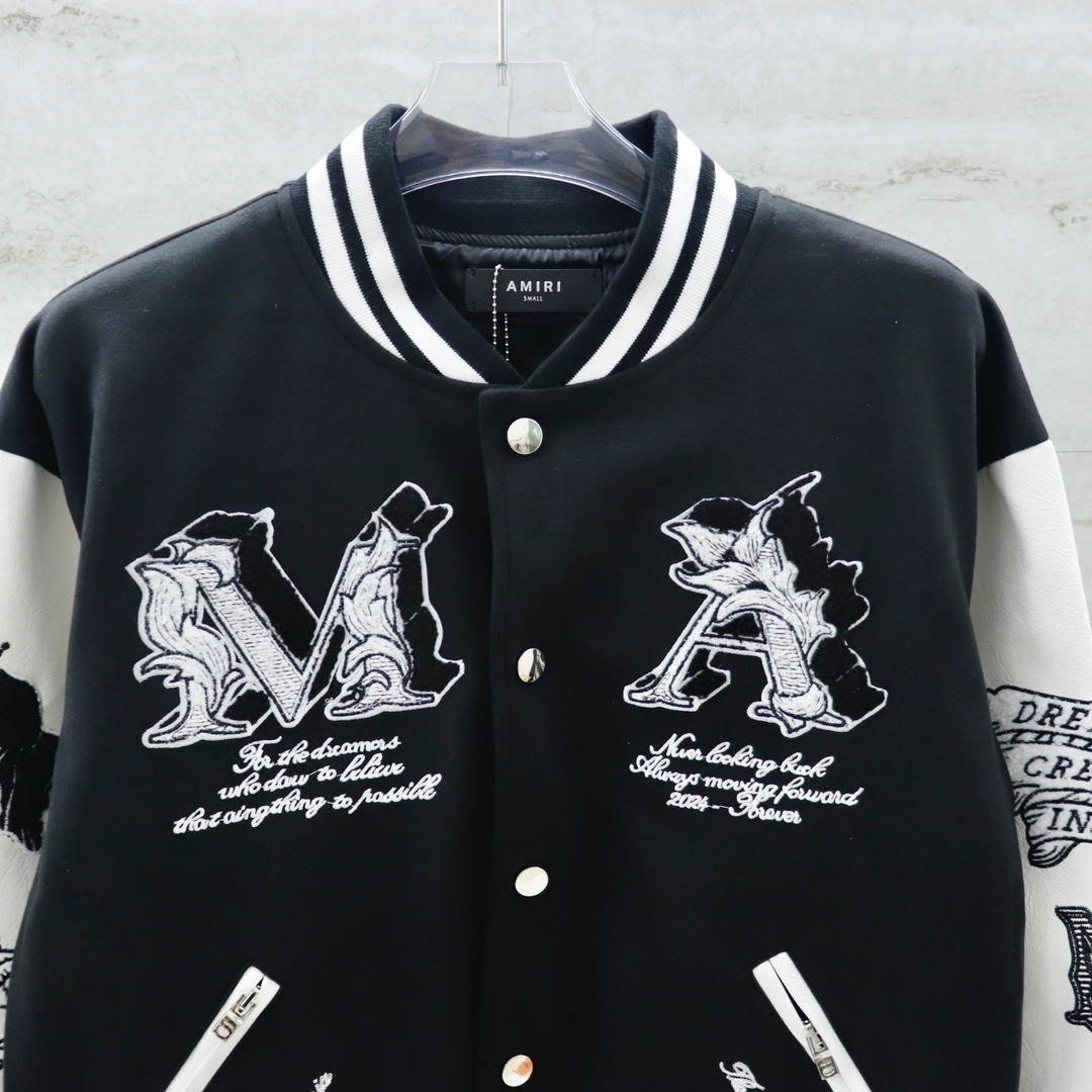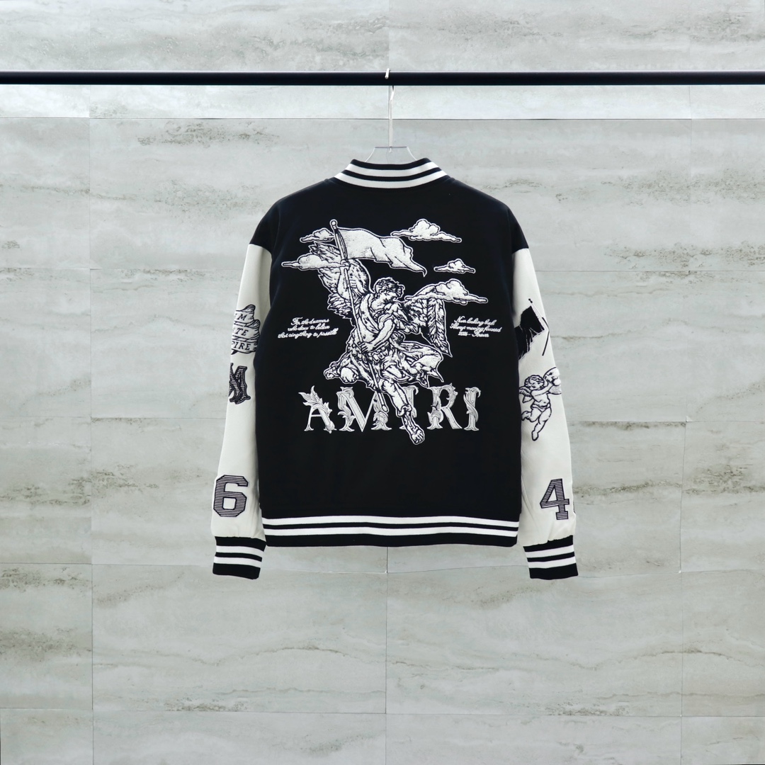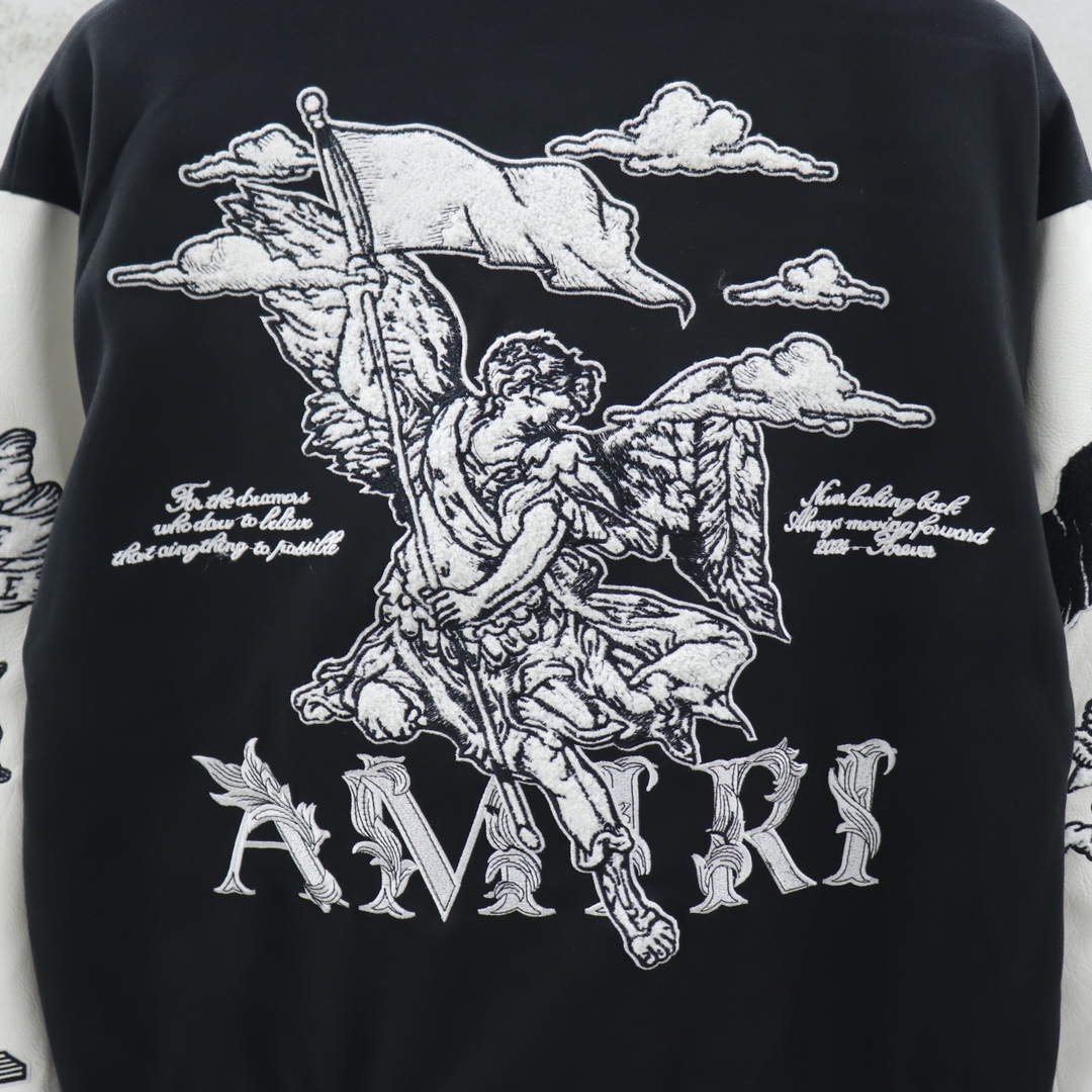 💰195 AMIRI 新款2024ss美式潮牌丘比特天使😇刺绣字母毛巾绒绣花棒球服皮袖棒球服外套🧥 辅料齐全高版本毛呢面料 颜色:黑色 码数:M -XXL