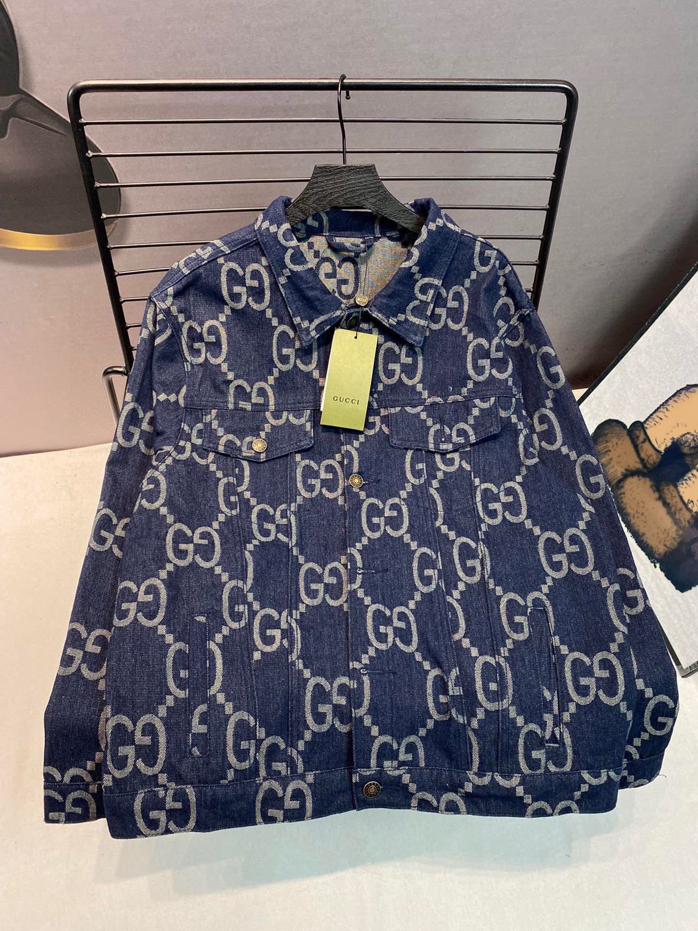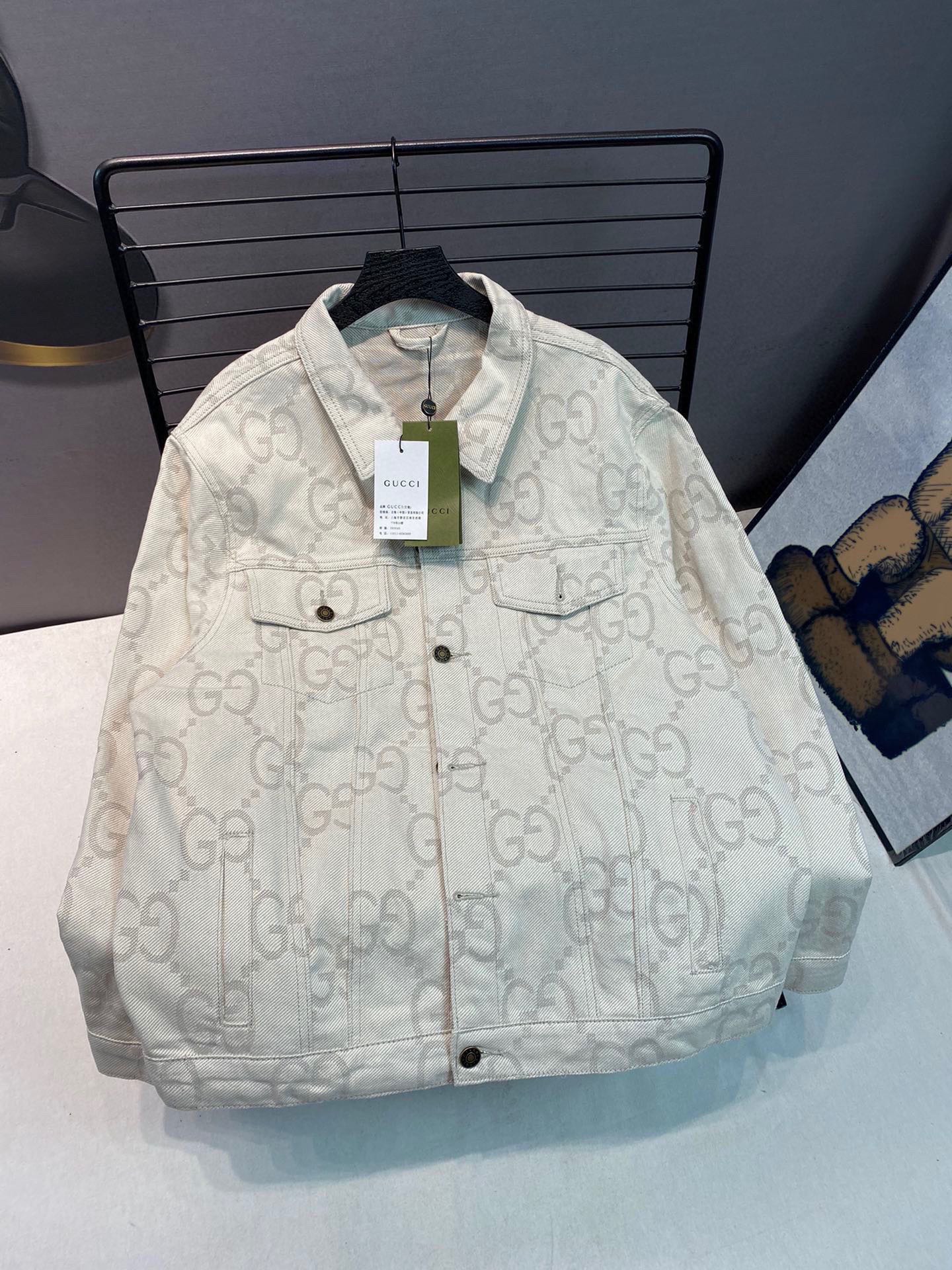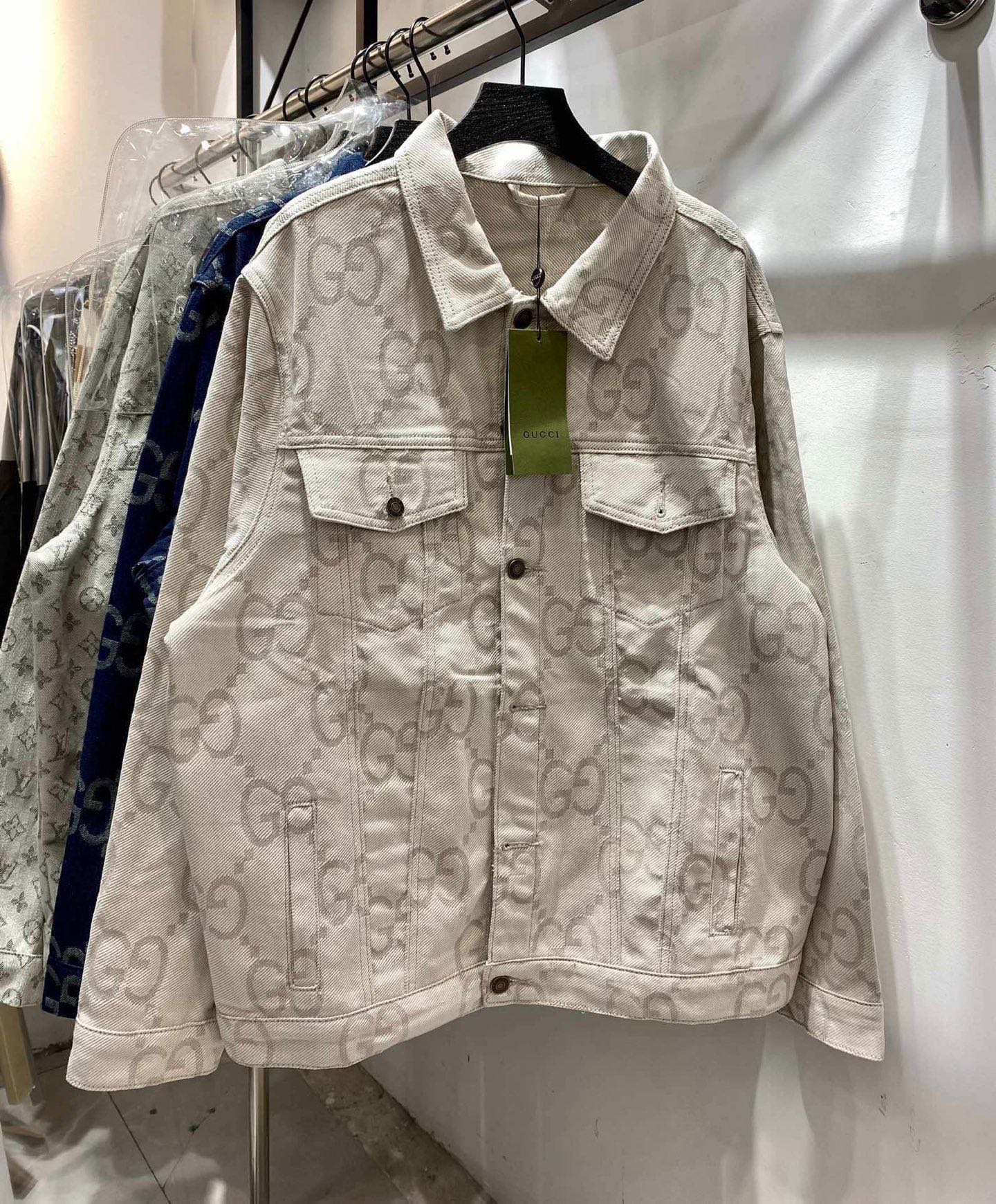 P165💰 款号:zmr22# GUCCI古驰双G提花牛仔夹克外套 整体衣服设计感十足 经典满印双G字母logo无论是看起来还是穿起来都是很高级 完全百搭任何人 满印提花工艺 花纹质感非常好 不会显得有种暴发户满屏logo风 吧亚洲人的肤色衬托的很自然白 给人一种高贵斯文的感觉 重工打造 强烈推荐 火速自留啦✔️ 颜色:象牙白 复古蓝 尺码:S-XL S 肩宽49 袖长54 胸围114 衣长68 M 肩宽50 袖长55 胸围118 衣长70 L. 肩宽51 袖长56 胸围122 衣长72 XL 肩宽52 袖长57 胸围126 衣长74