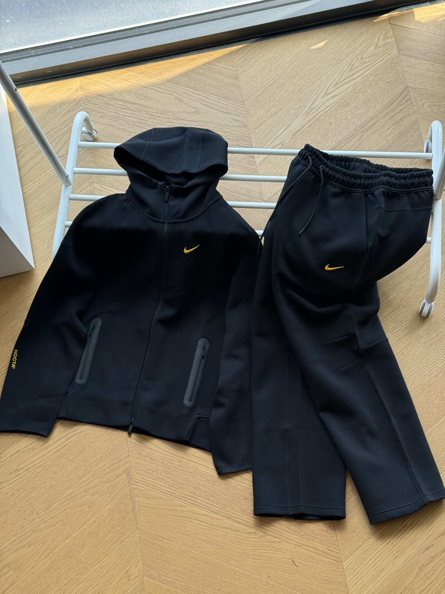 上衣供💰220 【顶级版本】 🇷🇺Nike x Drake 联名款 NOCTA系列 Tech Fleece Logo印花运动拉链连帽开衫外套卫衣🇷🇺男女同款 黑色 蓝色 S~xl 🌘全网最顶最正版本,原版同克重空气棉面料,耗时3个月打造,区别通货,整衣四针六线,原版1:1复刻,全套原版三标齐全 上衣尺码表: S:胸围115衣长69 袖长77 M:胸围119 衣长71 袖长78.5 L:胸围123 衣长73 袖长80 xl:胸围127 衣长75 袖长81.5