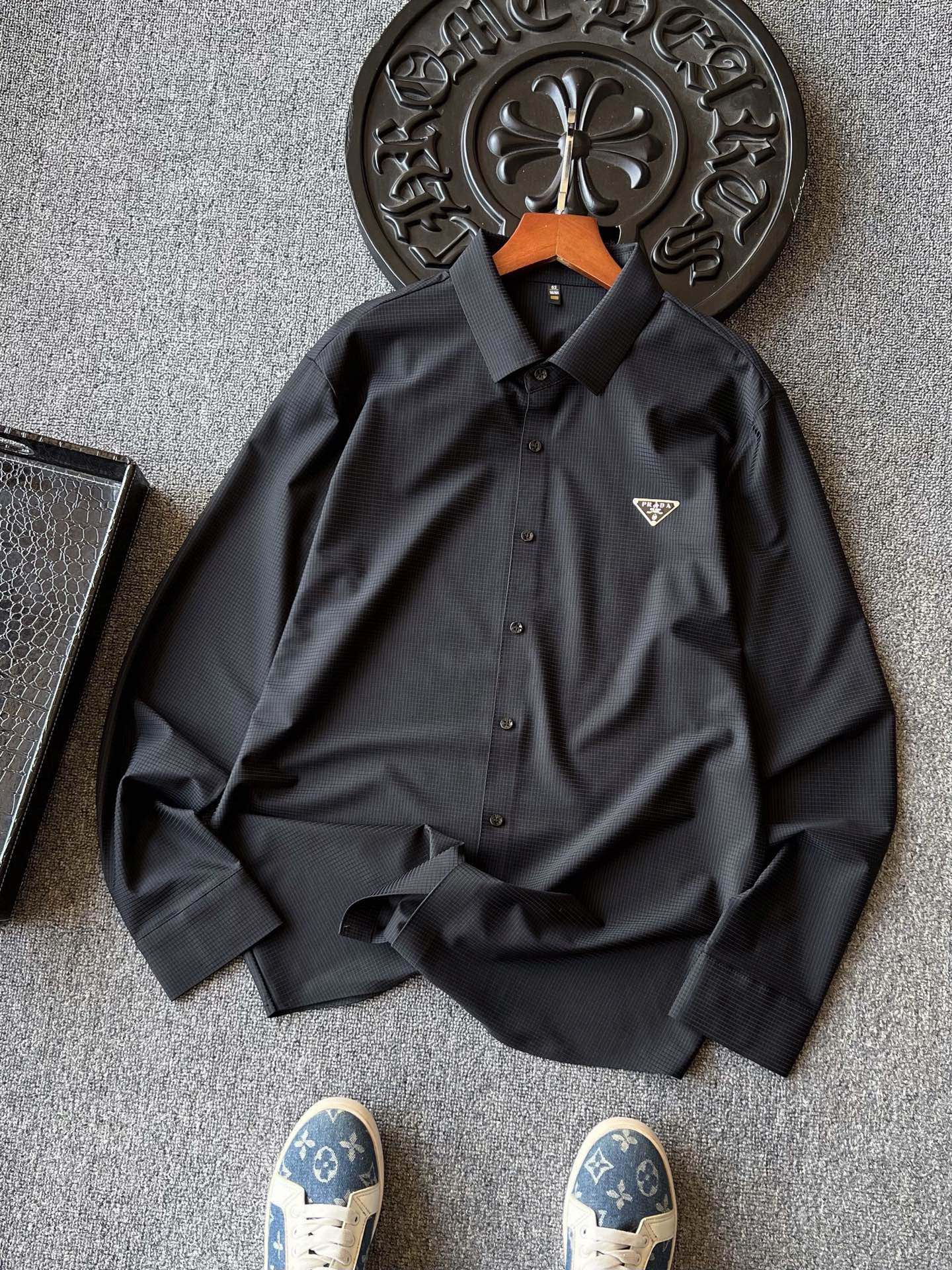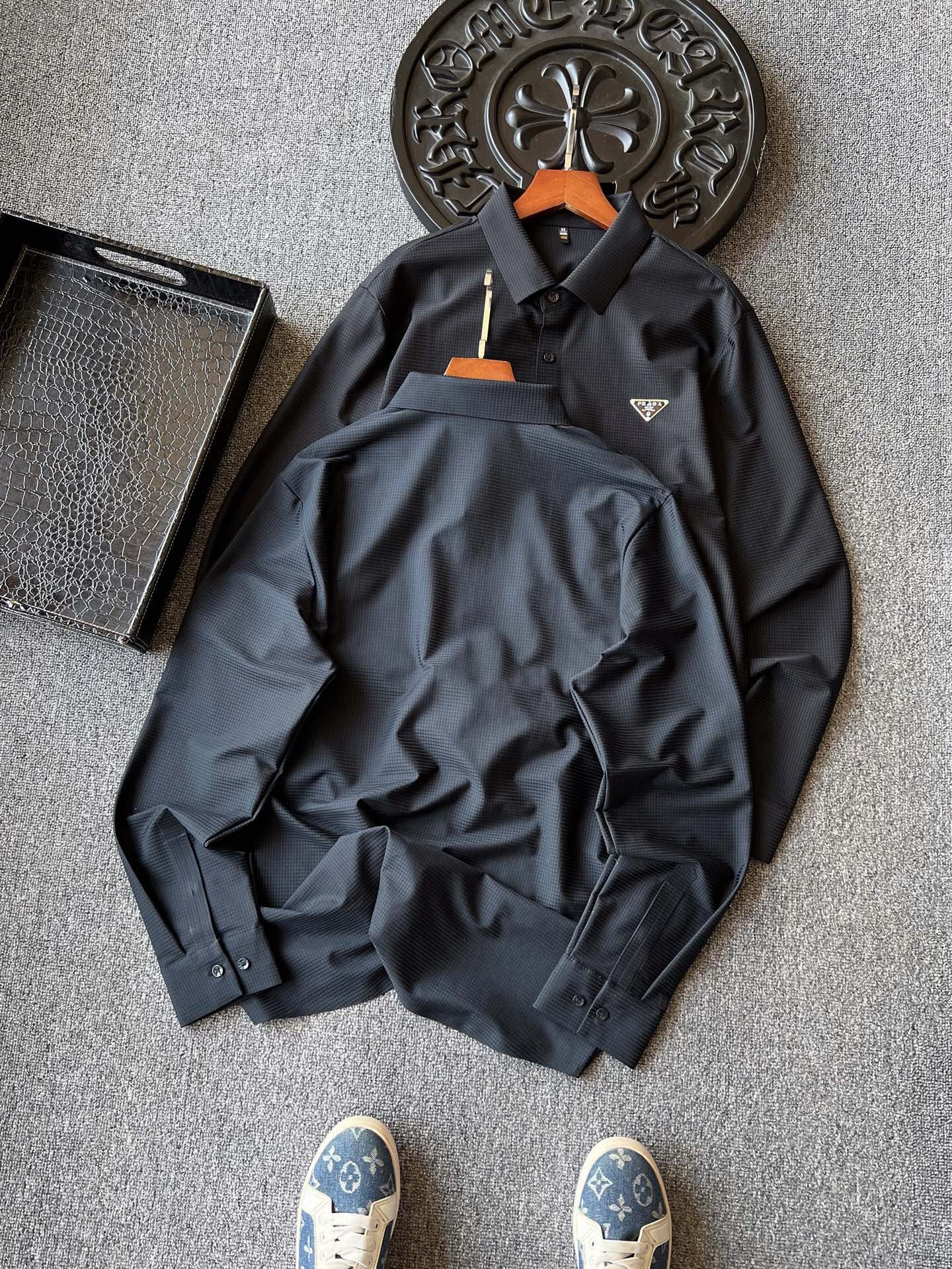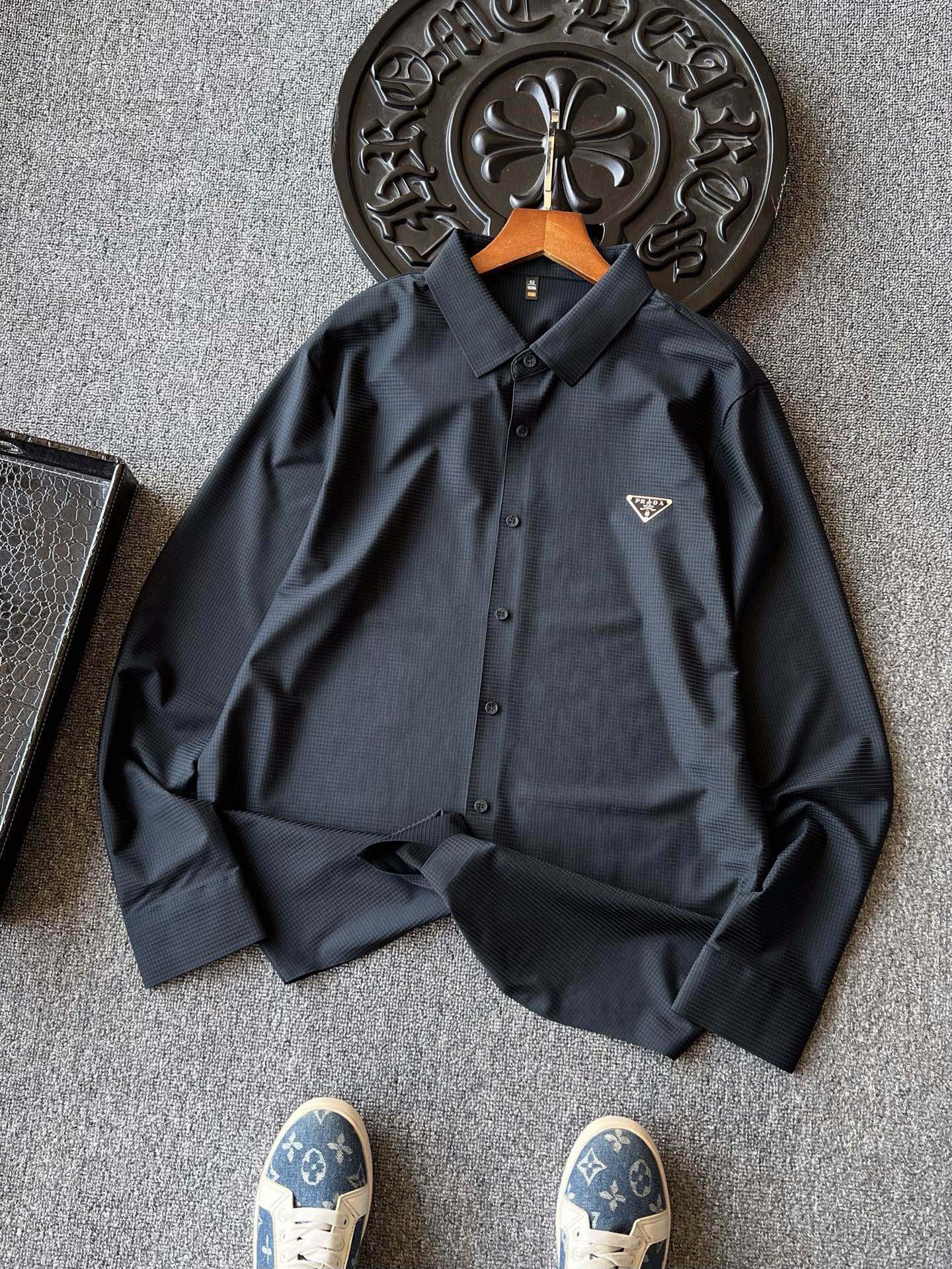 💰140 顶级高奢衬衫! 💥人气爆款!Prada/普拉达专柜新品小仆人公文包系列无痕长袖衬衫!恒隆在售万元级,款号:2080 普拉达家今年最新优选液氨锦棉面料!拿到手摸起来特别细腻,触感顺滑亲肤,具有很好的肌肤反馈感,表层带有暗纹肌理,视觉效果彰显精致高级感!贴身肌肤如SPA般滋养舒服! 细节细节再细节!Prada家商场新品无缝锦棉长袖衬衫!主打都市商务轻奢风格!胸前采用进口TPU材质做了浮雕Prada小仆人公文包倒三角标识!从领口门襟到双袖下摆全部做了无缝锁边热封压胶处理!一线大厂出品,天花板级做工! 全球首发新品!国内外专柜热销爆款长袖衬衫!高级蓝灰/黑灰双色,自穿精致生活,送人价值感高!无压力驾驭任何大型商务场合以及高端私人会所!强烈推荐入手! 尺码:M-3XL