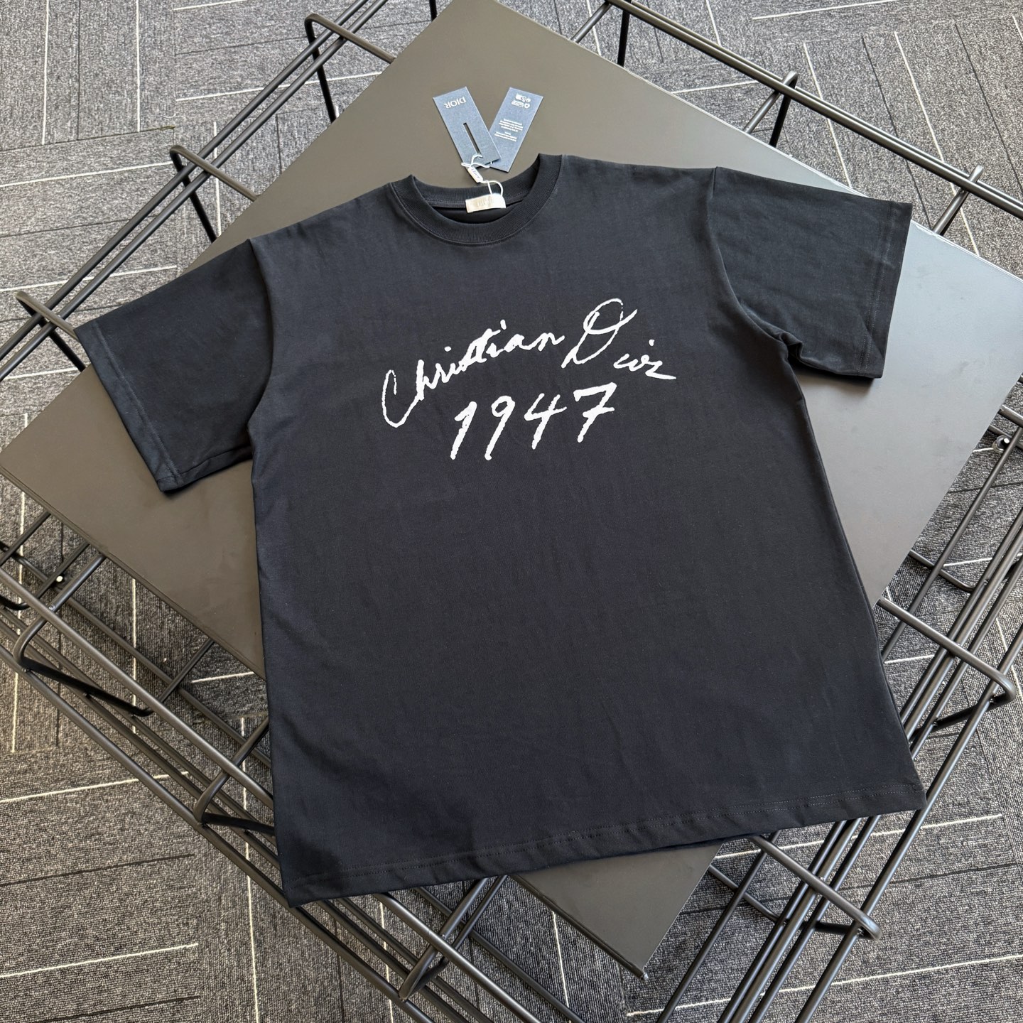 批80 款号D006 Dior 迪奥1947签字款立体植绒字母短袖T恤 市面高版‼️ 定制280克全棉双纱硬挺面料 布面干净 布纹清晰 手感非常细腻扎实 更加力挺 舒适透气不易变形不易褶皱 1×1索罗娜螺纹 面料螺纹同缸定染无色差 不易变形 全套定制商标、吊牌、洗水唛 市面最高版 Os落肩宽松版型 春夏最新柜柜同步 时尚个性 男女同款 超级百搭 尺码:S M L XL 颜色:白色 黑色