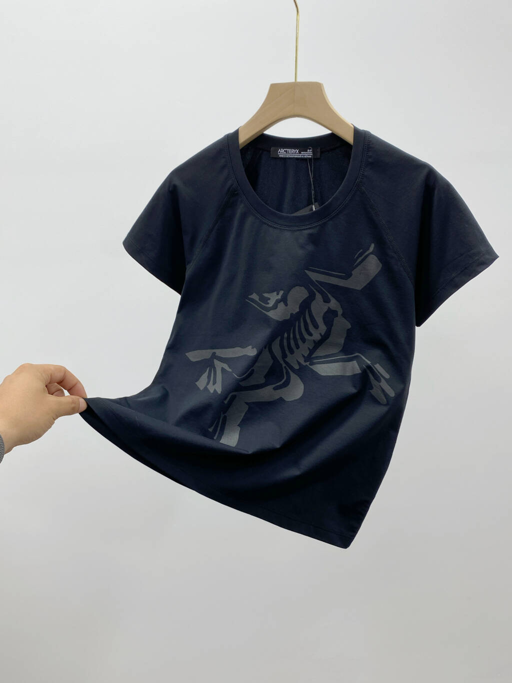 P100💰 ARC'TERYZ / 始祖鸟 三色Bird cotton 女士短袖大鸟标LOGO圆领针织上衣T恤 面料成分:50%聚酯纤维 50%弹力聚酯纤维 产品特点:采用轻量化科技感速干面料,具有冷感、超弹、快干、抑菌和抗紫外线等优点,轻薄又肉感十足挺括有型,经过棉感处理,手感舒柔细软仿佛棉质,抗皱易洗,吸湿排汗,清爽透气,运动出汗后,贴肌肤凉而不冰,享受舒适体感~ 微宽松合身版型,优化身材比例,上身干净利落 精致小U领,凸显脖颈修长,领深适度防走光,展现迷人锁骨~ 插肩袖设计,自然遮住肩部与上臂的肉肉,显瘦力max!!! 袖身拼接处采用四针六线麻丝工艺,稳固衣型,久洗不变形,腋下走线加宽,为活动增添余量。 领口、袖口和下摆都采用双针锁边,平顺整齐,耐用不易脱线! 柔和的低饱和度色系,满足不同风格的时髦精,轻松打造出夏日活力减龄感~ 颜色 : 白色 黑色 雾灰 尺码 : S-XL 尺码 胸围 衣长 袖长 S 81 56.5 23.5 M 85 58.5 24.5 L 89 60.5 25.5 XL 93 62.5 26.5 建议体重 S码 80斤-100斤 M码 100斤-120斤 L码 120斤-140斤 XL码 140斤-160斤