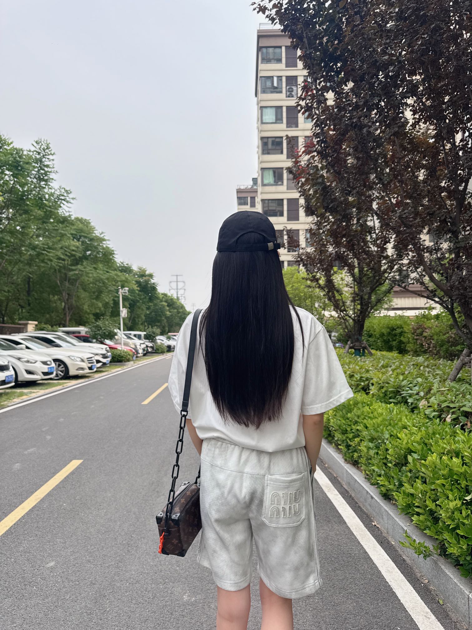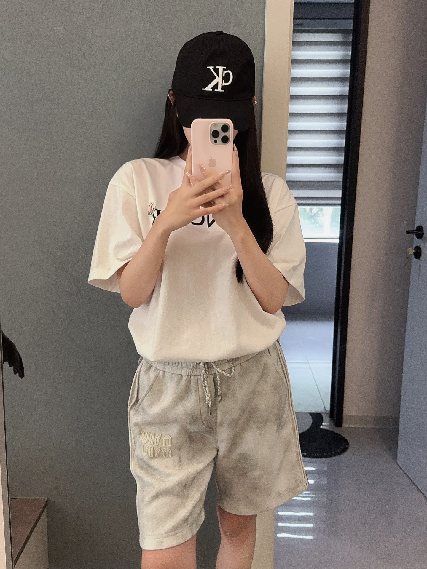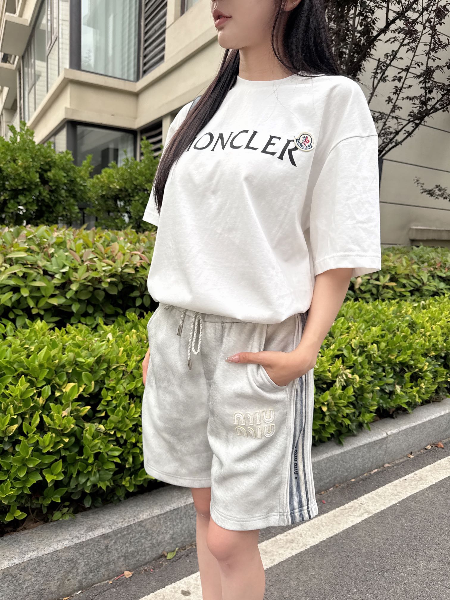 Miumiu/缪缪 水洗刺绣徽标短裤 上身效果#