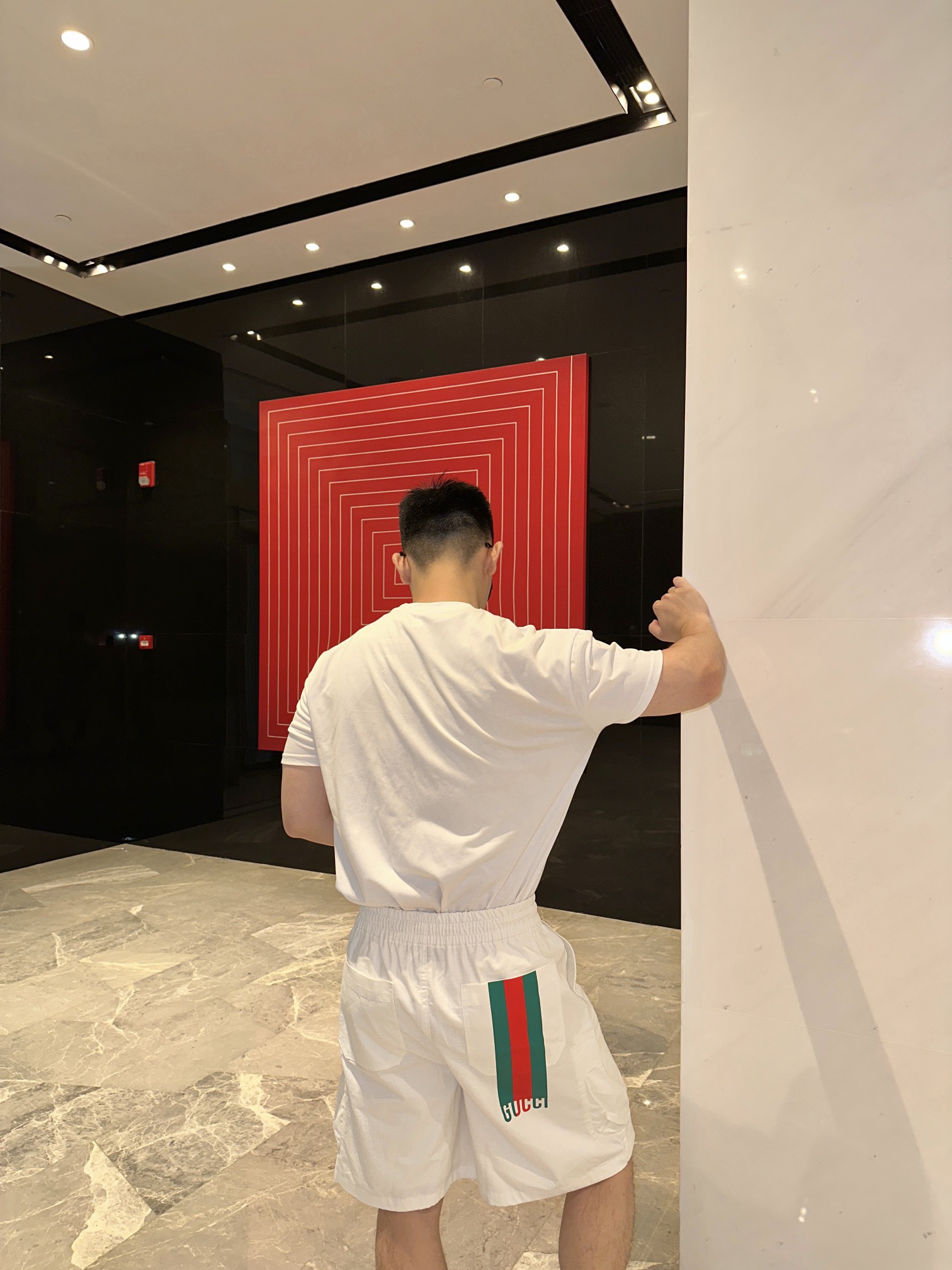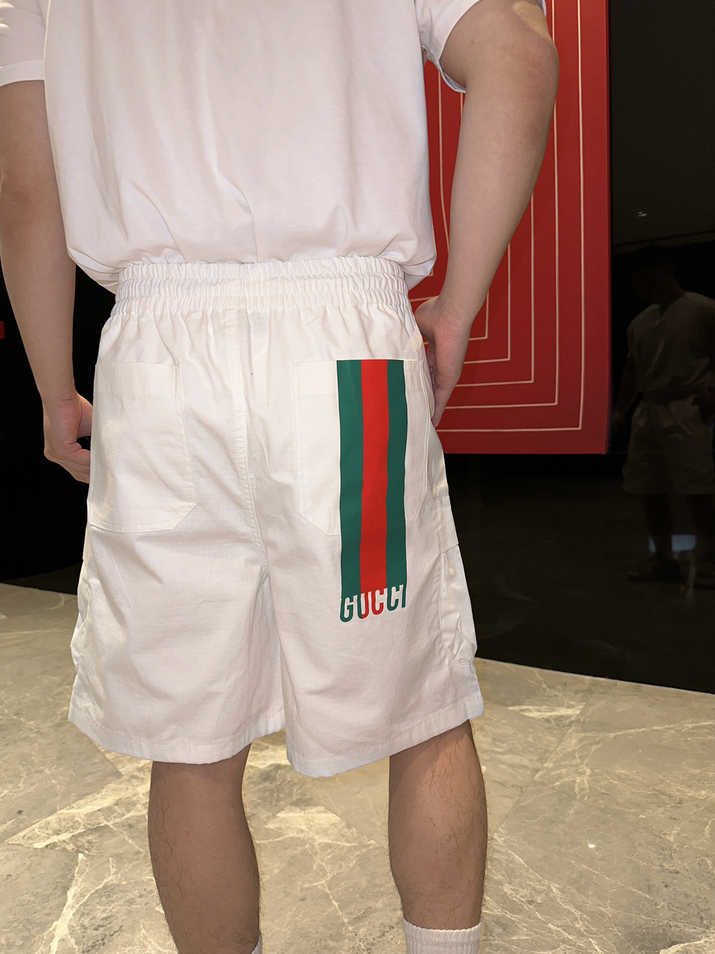 GUCCI/古驰 背后红绿字母印花白色休闲运动短裤 上身效果#