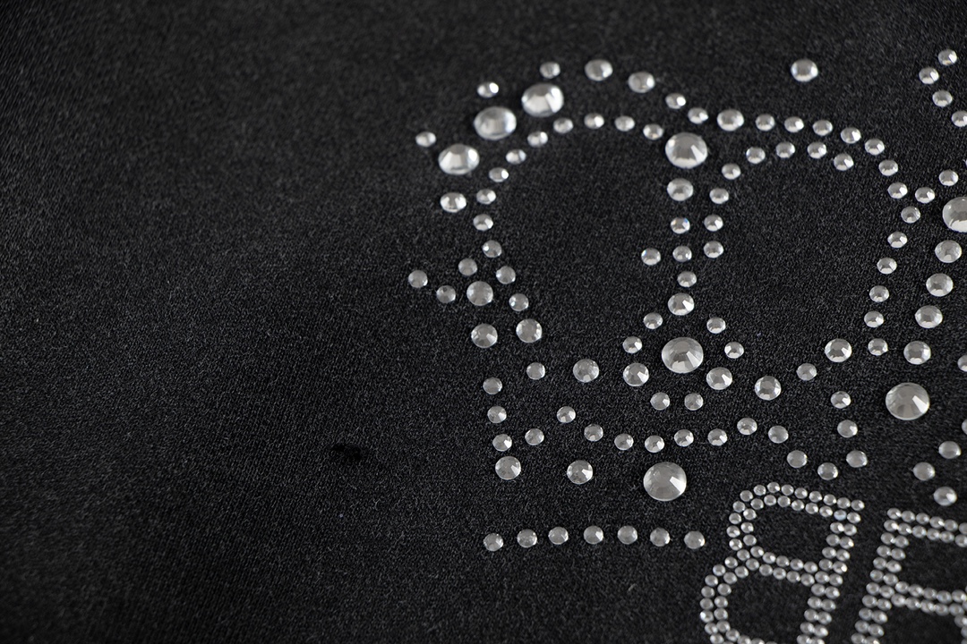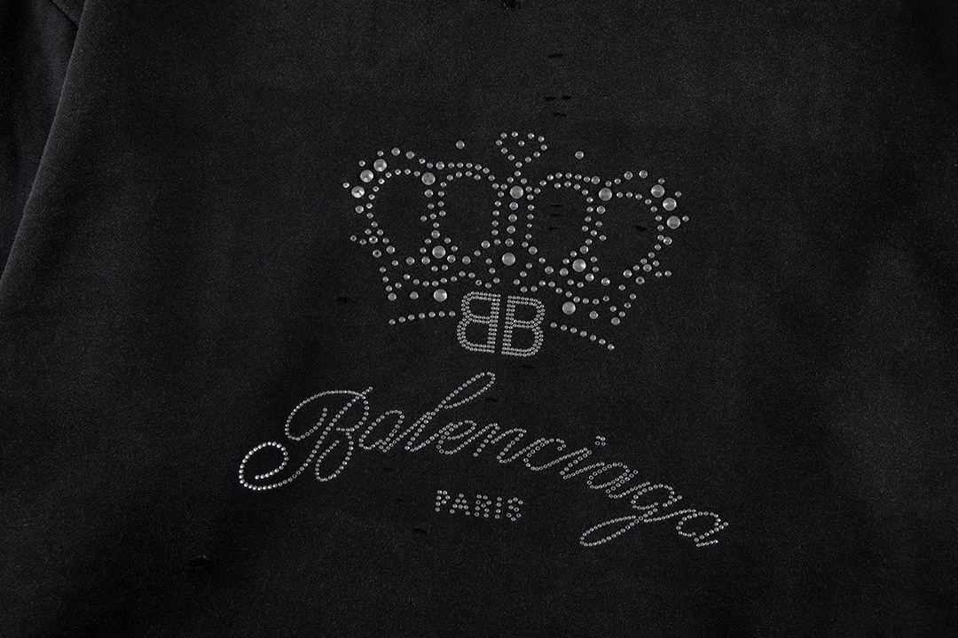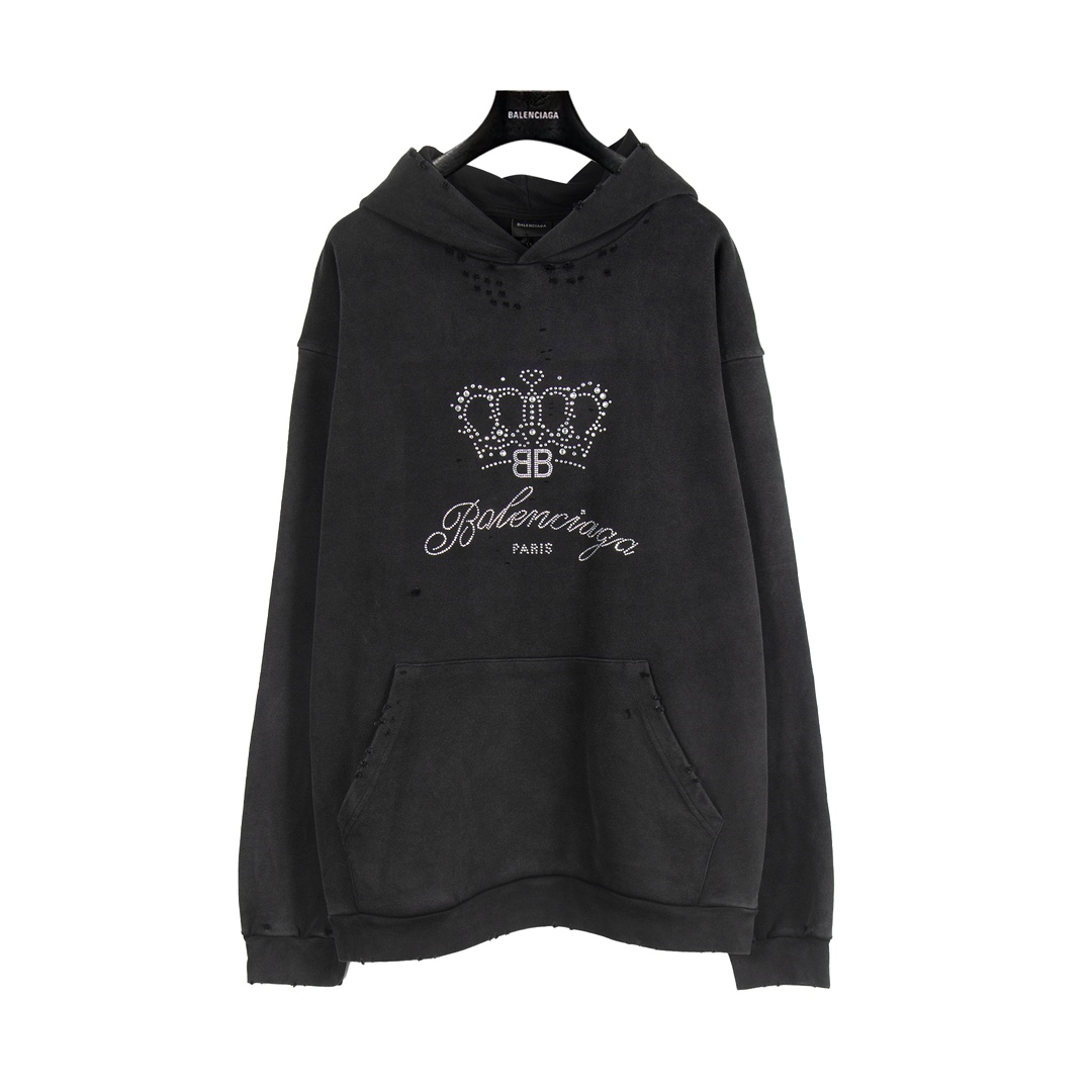 巴黎世家Balenciagg 新款皇冠烫钻洗水连帽卫衣💰P150 24年主麦上身 前后选用进口奥钻 精密排序后采用重工高温热压至衣身做工完美无瑕 颜色一致无色差 整体走线平直细腻 还原ZP 成衣烫钻 下摆 肩部 领口螺纹 点对点的小割破 小磨破 还有的都有 面料采用420克纯棉大卫衣 大货三标齐+码数贴+带Logo防尘纸 尺码:Xs-L 颜色:黑色