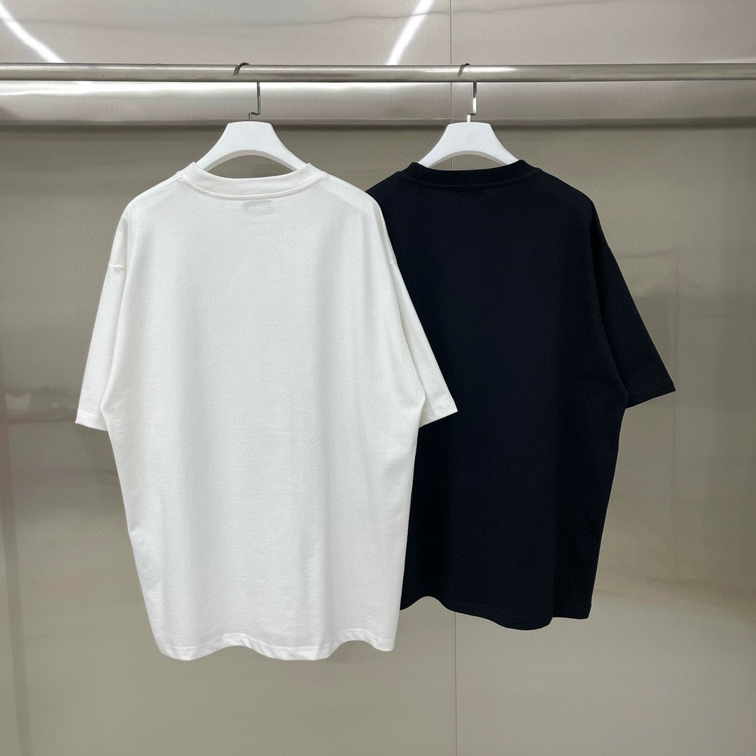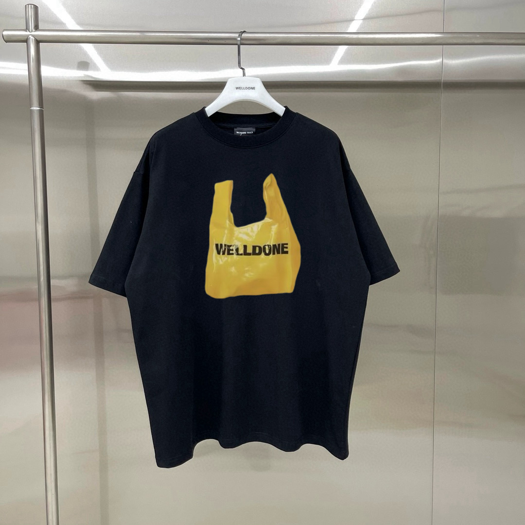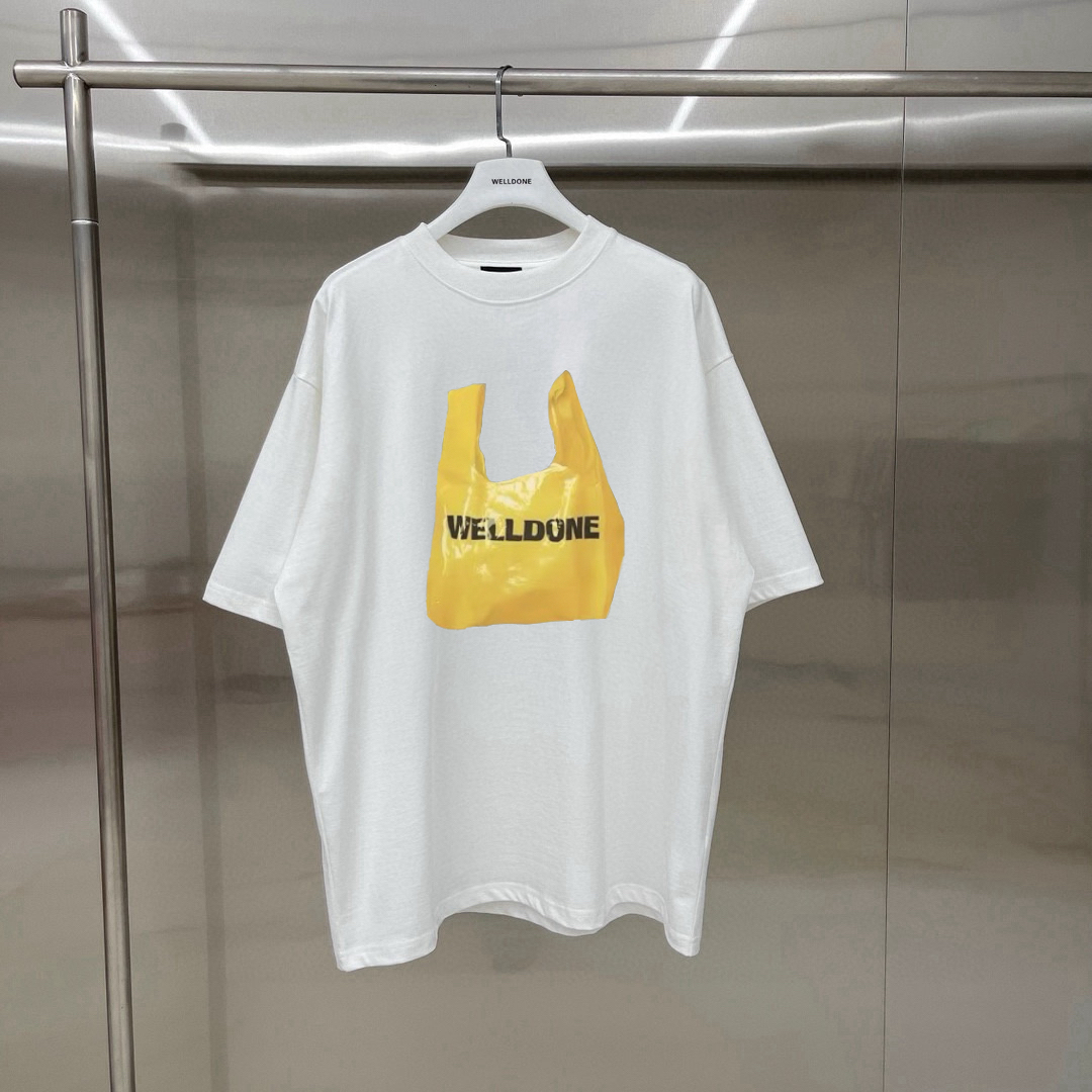 新款💰75 款号: W247# WE11DONE 购物袋印花 宽松圆领短袖T恤男女情侣款 面料:280g双纱精梳紧密赛络纺重磅纯棉 工艺:走线均是全身三线缝制,后领织带包边延伸到肩部加固,细节井口与肩膀处的衔接处打了倒针,更加无缝衔接。印花采用高端工艺不易开裂,区别市面普通版本 辅料:吊牌洗水主唛,全套定制的YUAN版辅料 颜色:白色、黑色 尺码:S-L 肩宽 胸围 衣长 S 码 52 112 71 M码 54 118 73 L 码 56 124 75