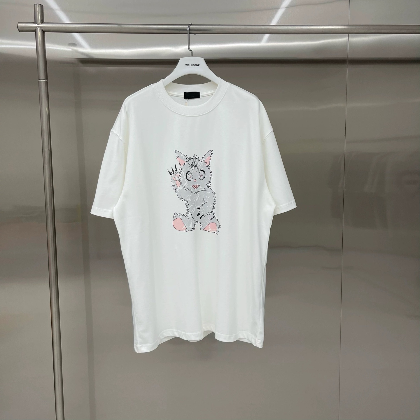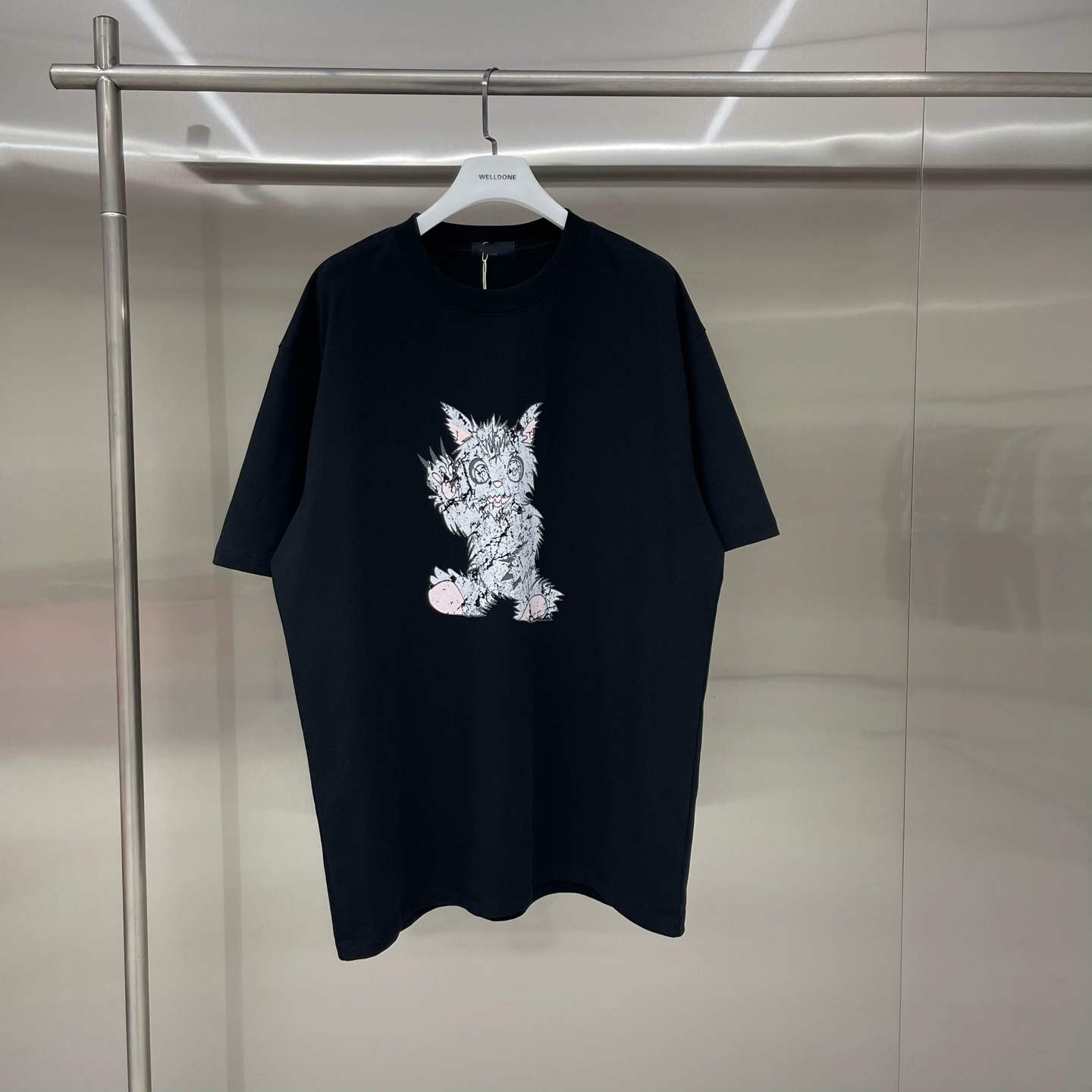 新款💰75 款号: W246# WE11DONE 怪兽涂鸦 宽松圆领短袖T恤男女情侣款 面料:280g双纱精梳紧密赛络纺重磅纯棉 工艺:走线均是全身三线缝制,后领织带包边延伸到肩部加固,细节井口与肩膀处的衔接处打了倒针,更加无缝衔接。印花采用高端工艺不易开裂,区别市面普通版本 辅料:吊牌洗水主唛,全套定制的YUAN版辅料 颜色:白色、黑色 尺码:S-L 肩宽 胸围 衣长 S 码 52 112 71 M码 54 118 73 L 码 56 124 75