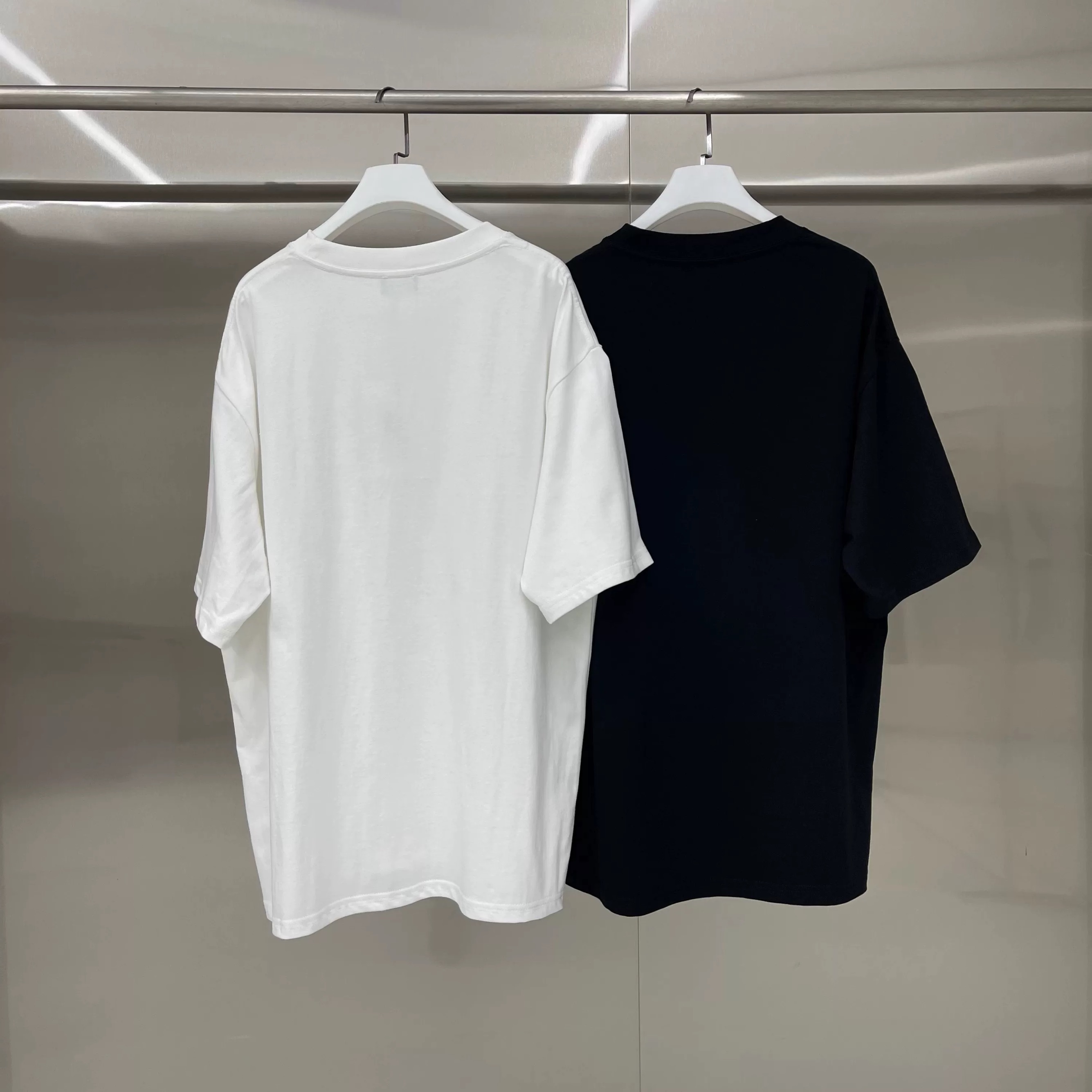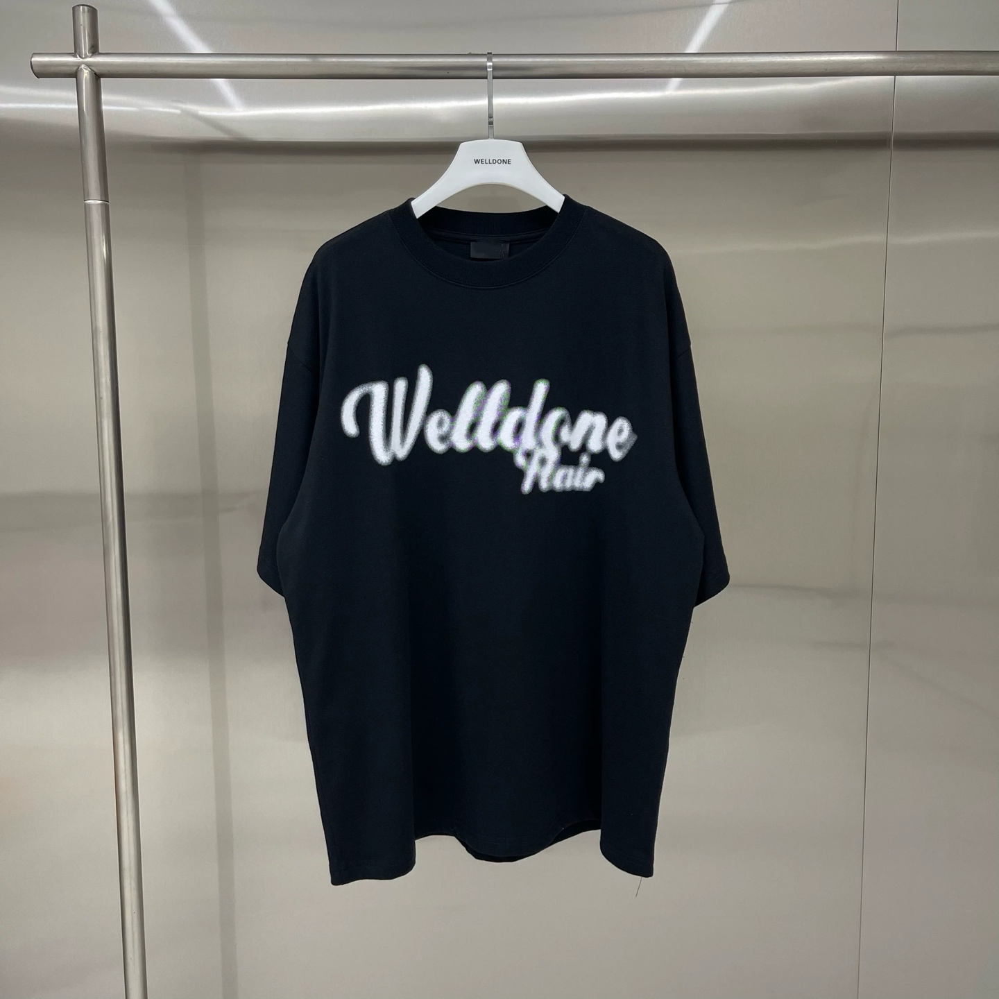 新款💰75 款号: W240# WE11DONE 模糊字母印花 宽松圆领短袖T恤男女情侣款 面料:280g双纱精梳紧密赛络纺重磅纯棉 工艺:走线均是全身三线缝制,后领织带包边延伸到肩部加固,细节井口与肩膀处的衔接处打了倒针,更加无缝衔接。印花采用高端工艺不易开裂,区别市面普通版本 辅料:吊牌洗水主唛,全套定制的YUAN版辅料 颜色:白色、黑色 尺码:S-L 肩宽 胸围 衣长 S 码 52 112 71 M码 54 118 73 L 码 56 124 75