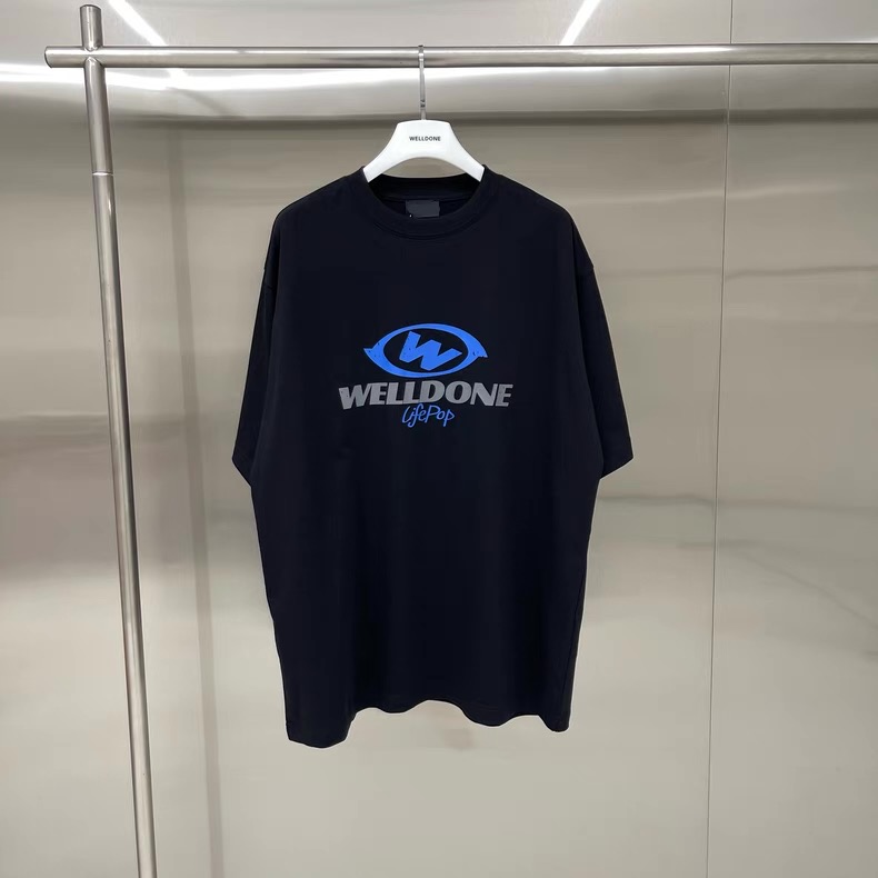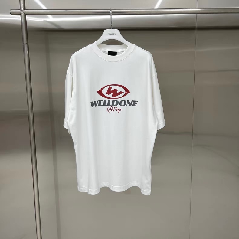 新款💰75 款号: W238# WE11DONE 美式字母 宽松圆领短袖T恤男女情侣款 面料:280g双纱精梳紧密赛络纺重磅纯棉 工艺:走线均是全身三线缝制,后领织带包边延伸到肩部加固,细节井口与肩膀处的衔接处打了倒针,更加无缝衔接。印花采用高端工艺不易开裂,区别市面普通版本 辅料:吊牌洗水主唛,全套定制的YUAN版辅料 颜色:白色、黑色 尺码:S-L 肩宽 胸围 衣长 S 码 52 112 71 M码 54 118 73 L 码 56 124 75