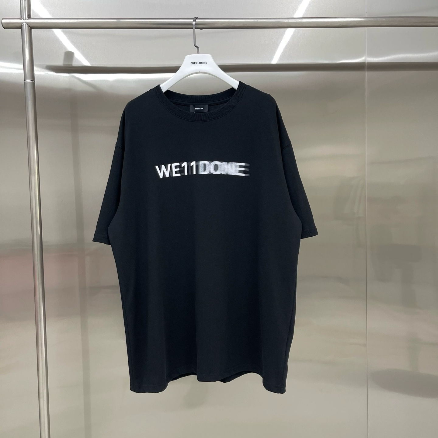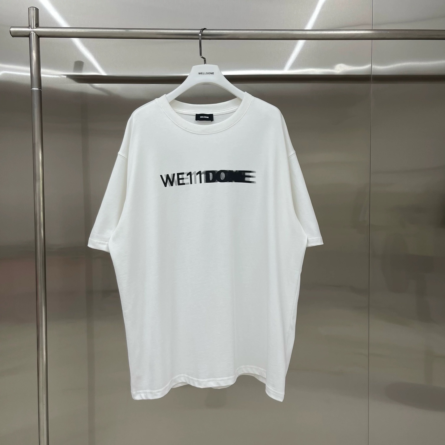 新款💰75 款号: W232# WE11DONE 幻影字母 宽松圆领短袖T恤男女情侣款 面料:280g双纱精梳紧密赛络纺重磅纯棉 工艺:走线均是全身三线缝制,后领织带包边延伸到肩部加固,细节井口与肩膀处的衔接处打了倒针,更加无缝衔接。印花采用高端工艺不易开裂,区别市面普通版本 辅料:吊牌洗水主唛,全套定制的YUAN版辅料 颜色:白色、黑色 尺码:S-L 肩宽 胸围 衣长 S 码 52 112 71 M码 54 118 73 L 码 56 124 75
