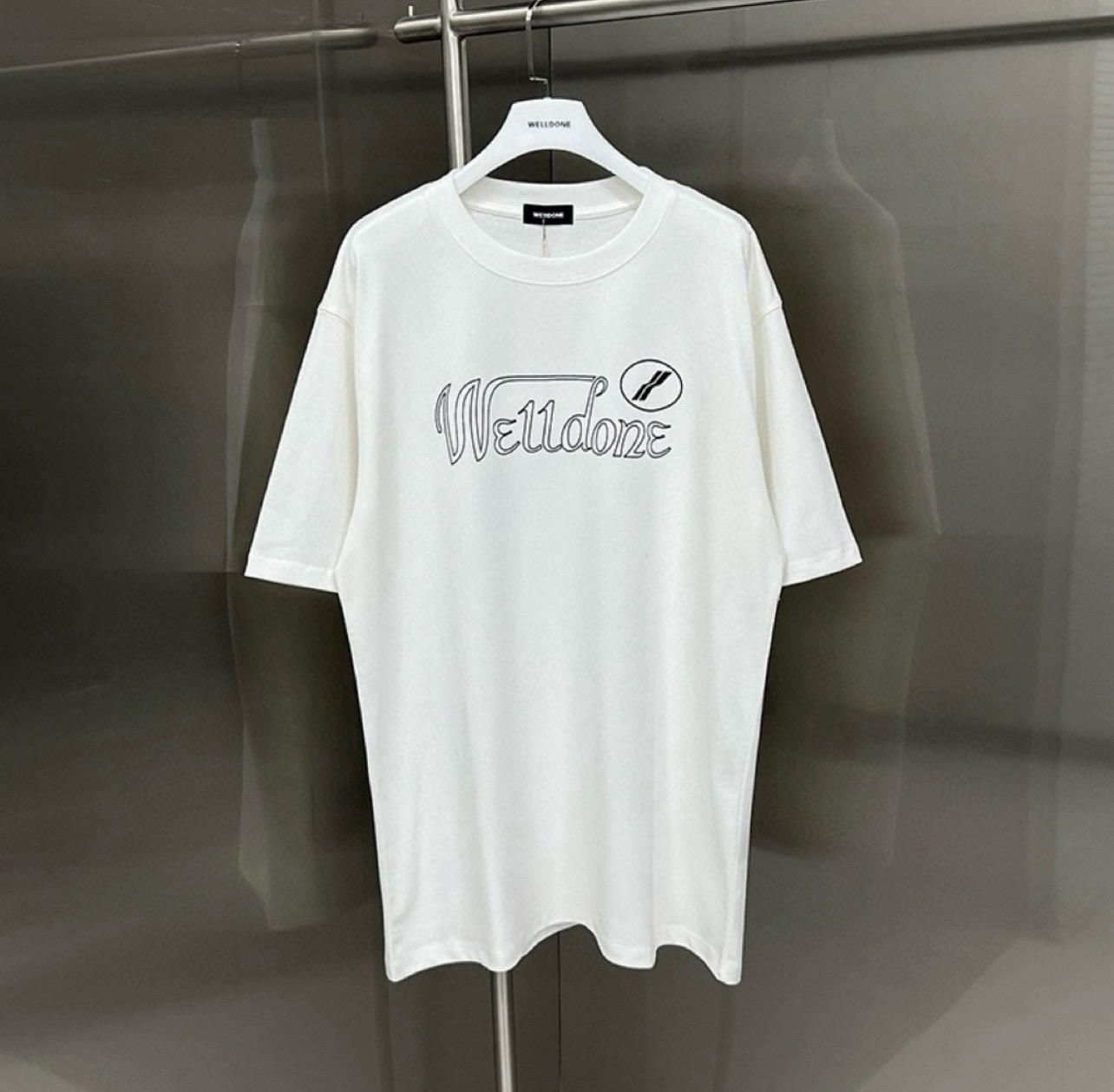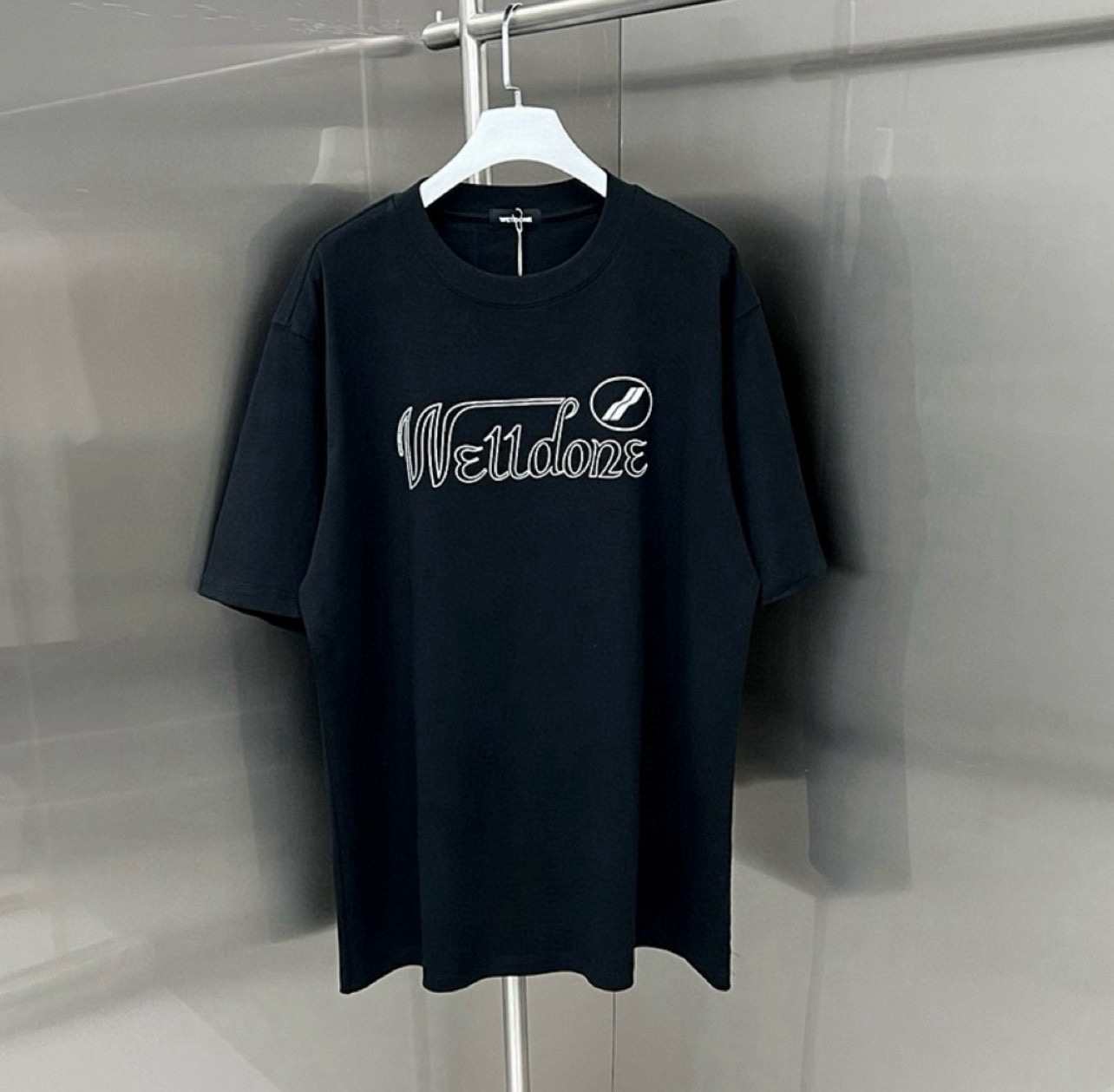 新款💰75 款号: W231# WE11DONE 经典字母印花 宽松圆领短袖T恤男女情侣款 面料:原版定制280克双纱纯棉紧密赛络纺纯棉 工艺:走线均是全身三线缝制,后领织带包边延伸到肩部加固,细节井口与肩膀处的衔接处打了倒针,更加无缝衔接。印花采用高端工艺不易开裂,区别市面普通版本 辅料:吊牌洗水主唛,全套定制的YUAN版辅料 颜色:白色、黑色 尺码:S-L 肩宽 胸围 衣长 S 码 54 110 76 M码 57 116 78 L 码 60 122 80