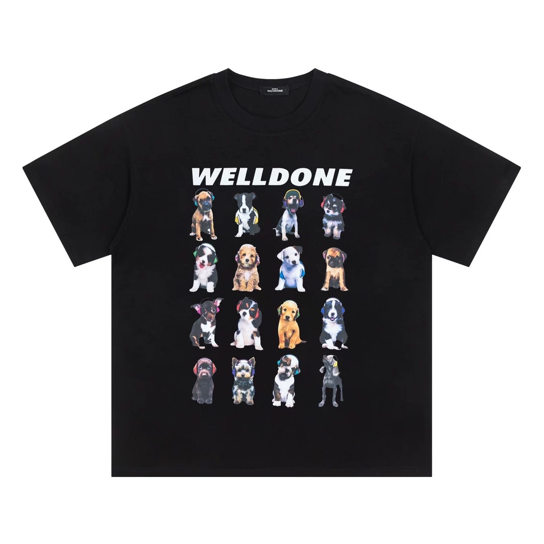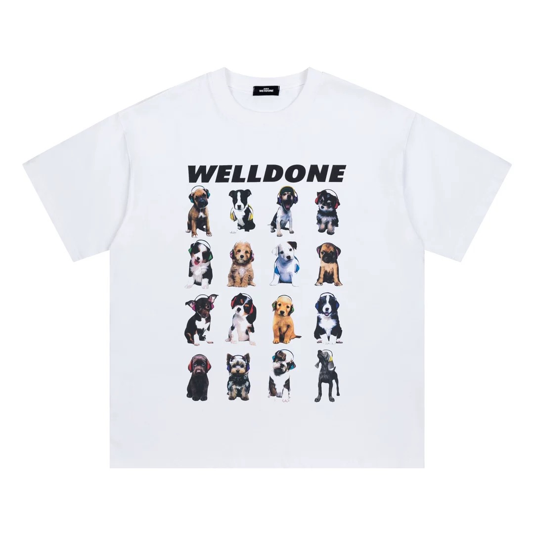 新款💰78 款号: W230# WE11DONE 宠物狗狗印花 宽松圆领短袖T恤男女情侣款 面料:300g双纱精梳紧密赛络纺重磅纯棉 工艺:原版一致OS宽松版型偏大,重磅质感精梳棉面料,不是软塌塌的面料穿不出来版型,走线均是全身三线缝制,后领织带包边延伸到肩部加固,细节井口与肩膀处的衔接处打了倒针,更加无缝衔接。印花采用高端工艺不易开裂,区别市面普通版本 辅料:吊牌洗水主唛,全套定制的YUAN版辅料 颜色:白色、黑色 尺码:S-L 肩宽 胸围 衣长 S 码 52 112 71 M码 54 118 73 L 码 56 124 75
