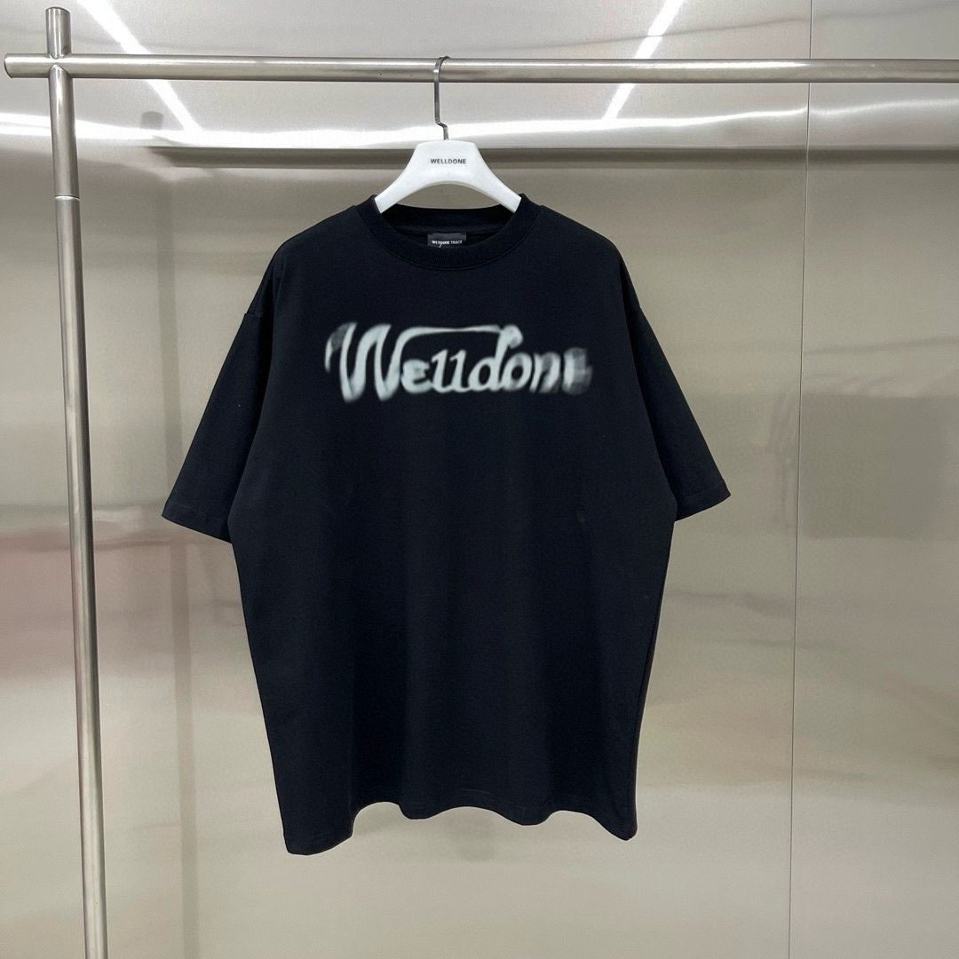 新款💰78 款号: W218# WE11DONE 模糊字母 宽松圆领短袖T恤男女情侣款 面料:280g双纱精梳紧密赛络纺重磅纯棉 工艺:走线均是全身三线缝制,后领织带包边延伸到肩部加固,细节井口与肩膀处的衔接处打了倒针,更加无缝衔接。印花采用高端工艺不易开裂,区别市面普通版本 辅料:吊牌洗水主唛,全套定制的YUAN版辅料 颜色:白色、黑色 尺码:S-L 肩宽 胸围 衣长 S 码 52 112 71 M码 54 118 73 L 码 56 124 75