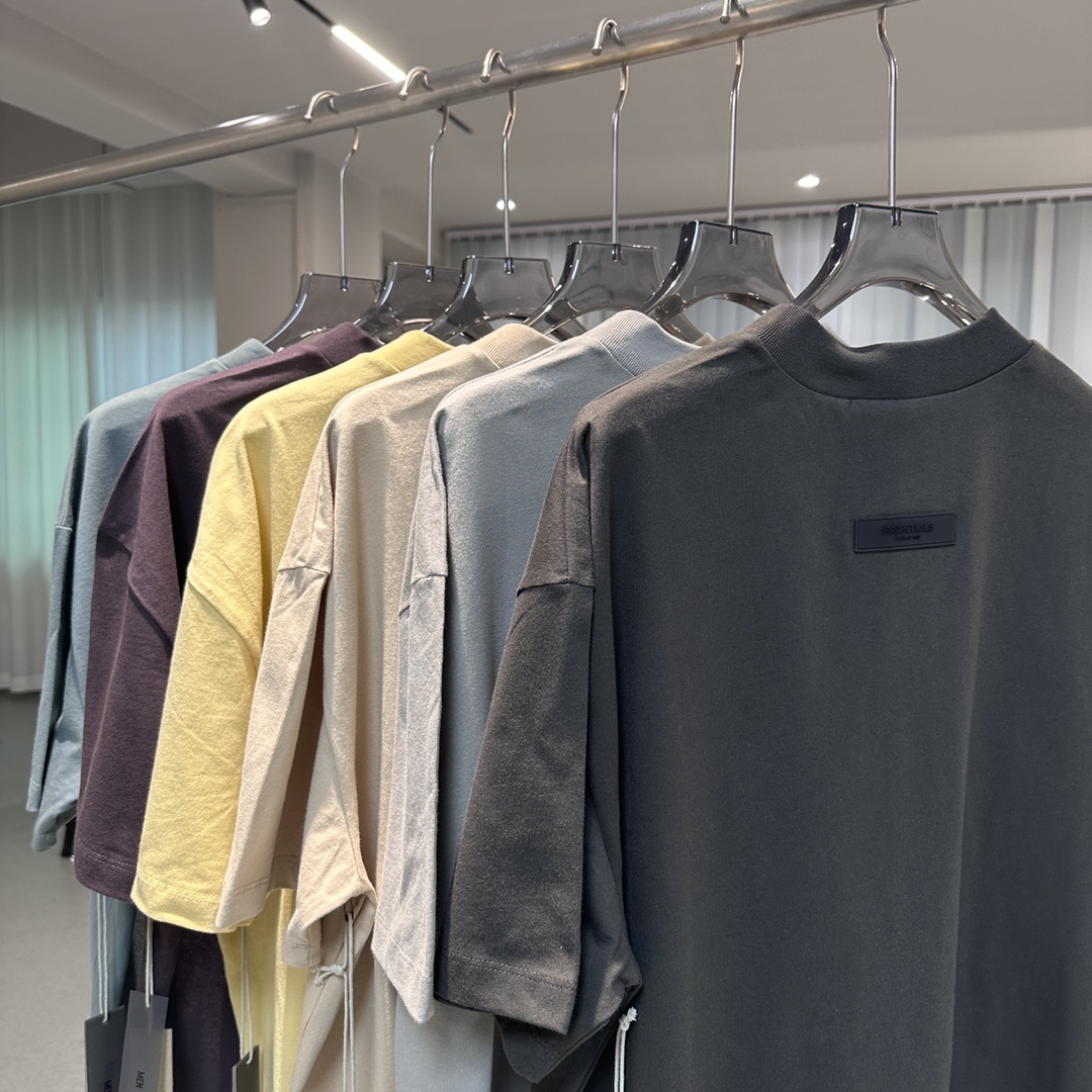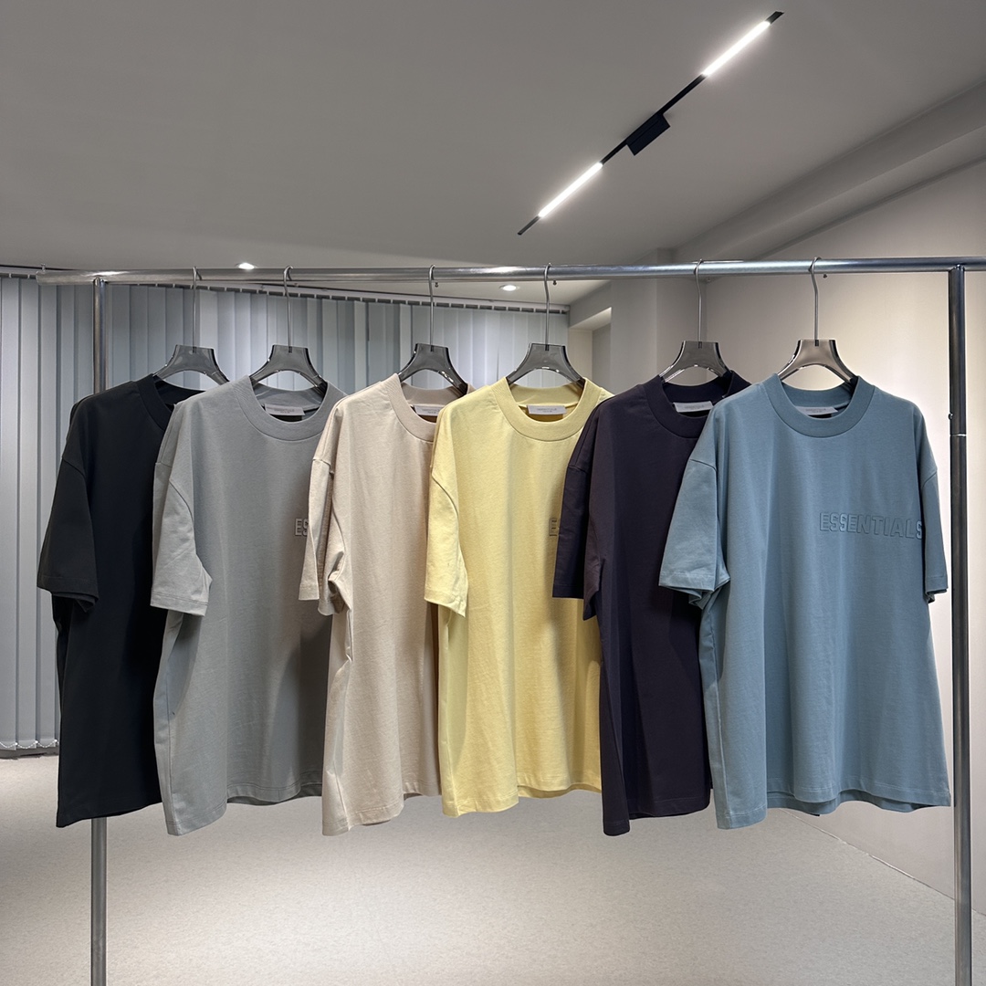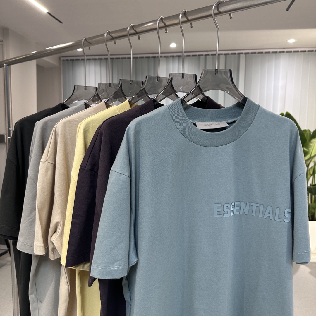 #096 23ss硅胶字母印花短袖 FEAR OF GOD ESSENTIALS(FOG复线)第九季 #单品信息 新款徽标短袖T恤,平纹针织面料 罗纹针织圆领,后领黑色浸胶徽标贴花,3D立体硅胶复合徽标logo #关于工艺 面料# YB分解送专业机构检测成分,结果为16支单纱 230G精梳棉,市面上所有布行都不会做16支单纱超过180G的面料,所以只能买纱订织 高价去染厂订染 花费整整一个月时间才出货 #领标 主码唛都与YB一样采用滴胶工艺制作,字体明显看的到3D立体感 洗不掉扣不烂,非市面丝印的便宜货扣就掉,洗就消失 #徽标 后领黑色浸胶徽标贴花,新款YB购入到手直接分解定制各种辅料,徽标为半透黑灰色,所以在各色面料上看到的都不同色,由于第一批辅料厂做错成不透光全黑 市场跟风倒是整个市场都是错版,并非全黑不透光 详情看图文介绍 细节完美到位 区分市场垃圾版本 官方配色: 雾霾蓝 梅紫色 鹅黄色 沙石色 淡黑色 海豹灰 SIZE码数: (官方尺码)XS.S.M.L.XL