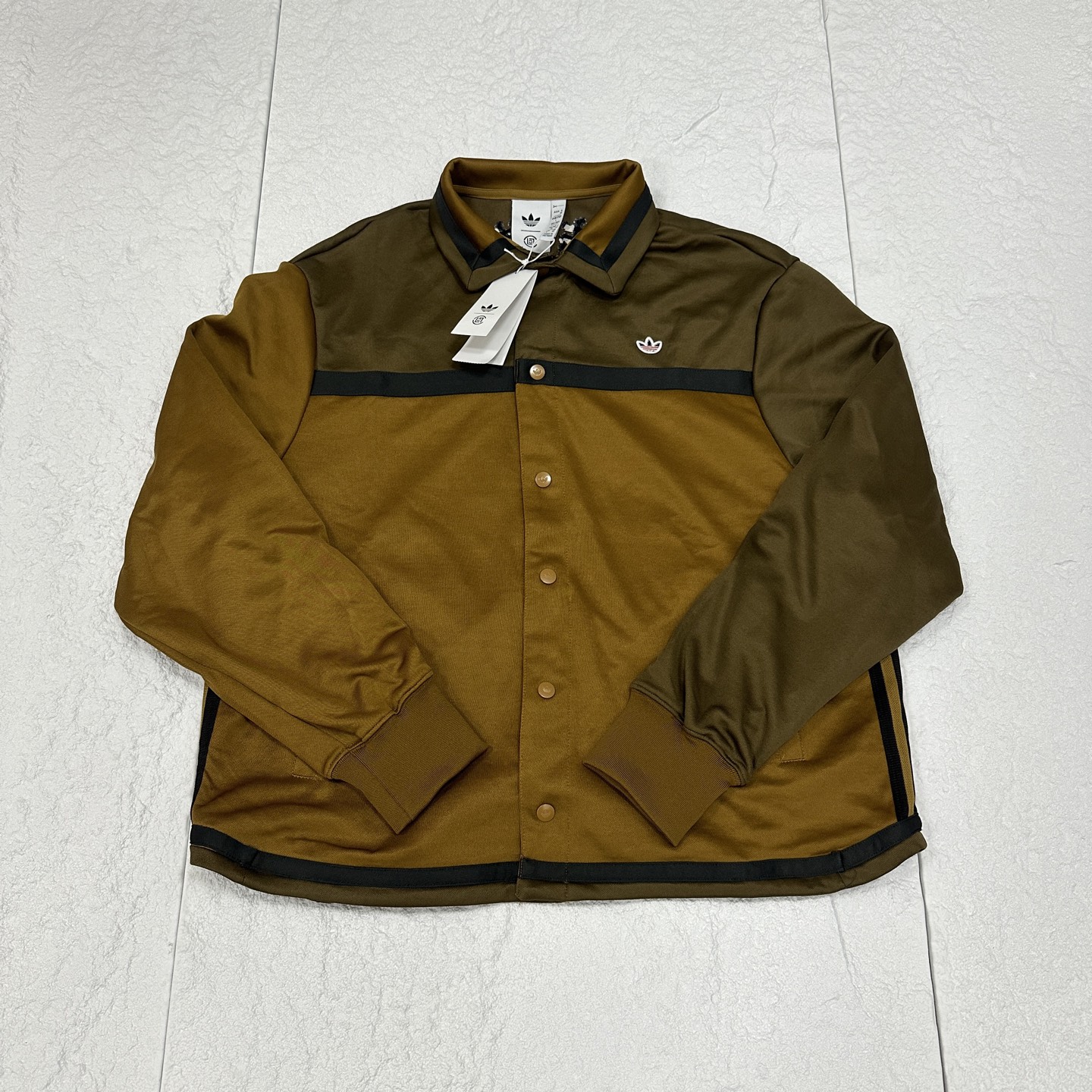外套💰200!裤子💰160 adidas originals x CLOT 联名款 CLOT BY EDISON CHEN FW24 拼色舒适翻领长袖夹克 裤子 套装!凝结集团 建议一套入|可得两套穿搭风格! 裤子两边排扣可以全部打开! 潮流➕运动风格、无论是日常或者运动休闲都可以!上衣外套无论是搭短袖或者卫衣都非常百搭!衣服和裤子的细节非常多! 不对称的设计很独特!颜色搭配非常亮眼很吸眼球! 领口、袖口和两侧有拼色条纹,既有阿迪以为风格有很好融入CLOT的元素!裤子排扣设计很独特!很多种穿法以及满足各种需求性! ‼️宽松版型、亚洲码数 Color: 青铜色|亮蓝色 Size: S M L XL 2XL 上衣 肩宽 胸围 衣长 袖长 S 52 122 68 65 M 53 126 70 66 L 54 130 72 67 XL 55 134 74 68 2XL 56 138 76 69 裤子 裤长 腰松紧 臀围 S 97 72 90 M 99 76 94 L 101 80 98 XL 103 84 102 2XL 105 88 106