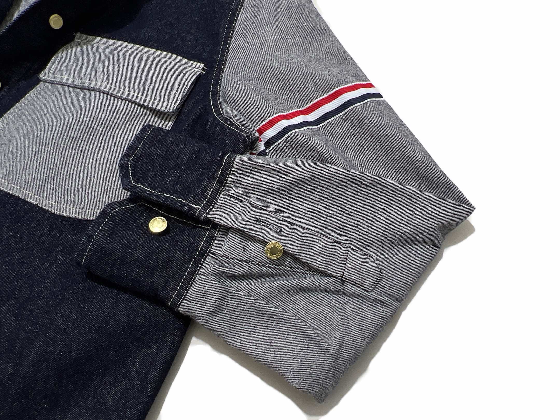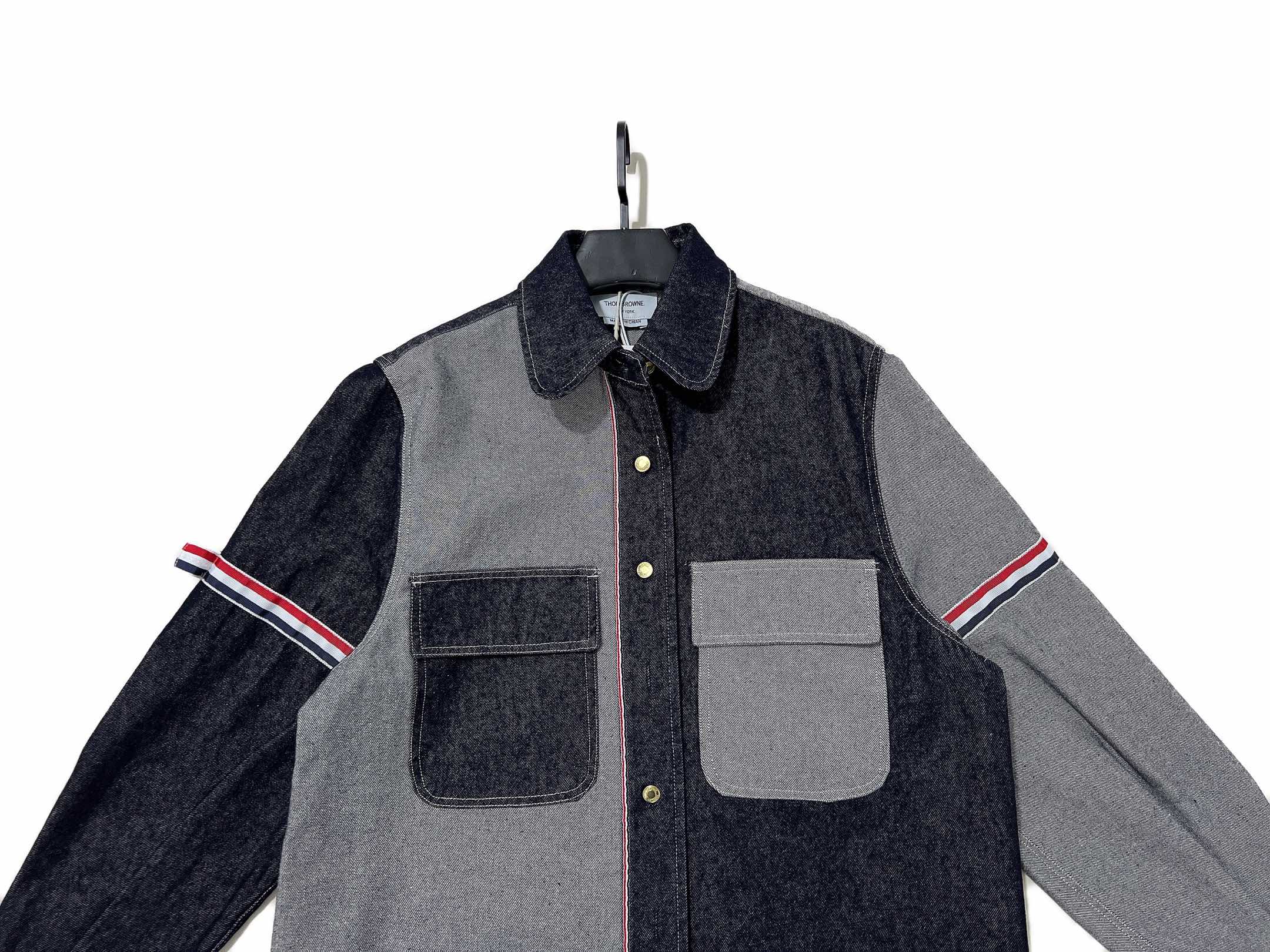 💰200 独家臻品 Thom Browne/汤姆布朗情侣款拼接设计双袖织带牛仔衬衫 休闲夹克外套 整体延续了不对称拼接设计,利用面料的正面和反面相拼接,深蓝与灰色的对比,视觉冲击感很强,两个口袋也是不同色的,立体有型,有着率性不羁的酷感!这种拼接做法,从剪裁到缝制都比普通款复杂很多! 门襟、手臂代表性红白蓝织带装饰,下摆处经典白标,为整体奠定了复古学院风的基础,既是衬衫又是小外套,不分男女,都好穿! 纯棉牛仔面料,看起来是一件衬衫,实际是外套的厚度和版型,成衣克重750g左右,面料肌理晰膏级,扎实硬挺有骨架感,上身飞常有型! 颜色:拼色 尺码:1//2/3/4 1码 衣长82胸围118袖长61.55肩宽48下摆66.5 2码 衣长83.5胸围122袖长62.5肩宽49.5下摆68.5 3码 衣长85胸围126 袖长63.5肩宽51下摆70.5 4码 衣长86.5胸围130袖长674.5肩宽52.5下摆65.5 温馨提示:商品为纯手工测量,如有1-3CM误差属于合理范围