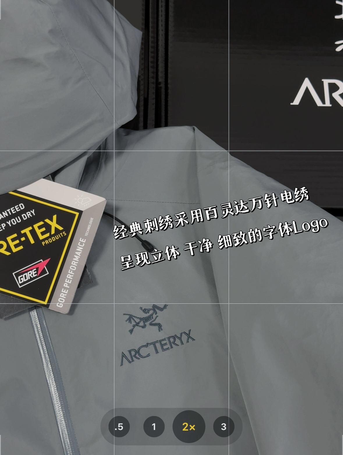 -传统风琴交叉反向进入高山口袋设置在高位,VISLON中央正面拉链,可调节Velcro袖口魔术贴标签,兼容Zip-in,在胸前采用百达灵机器绣上了ARC TERYX徽标
