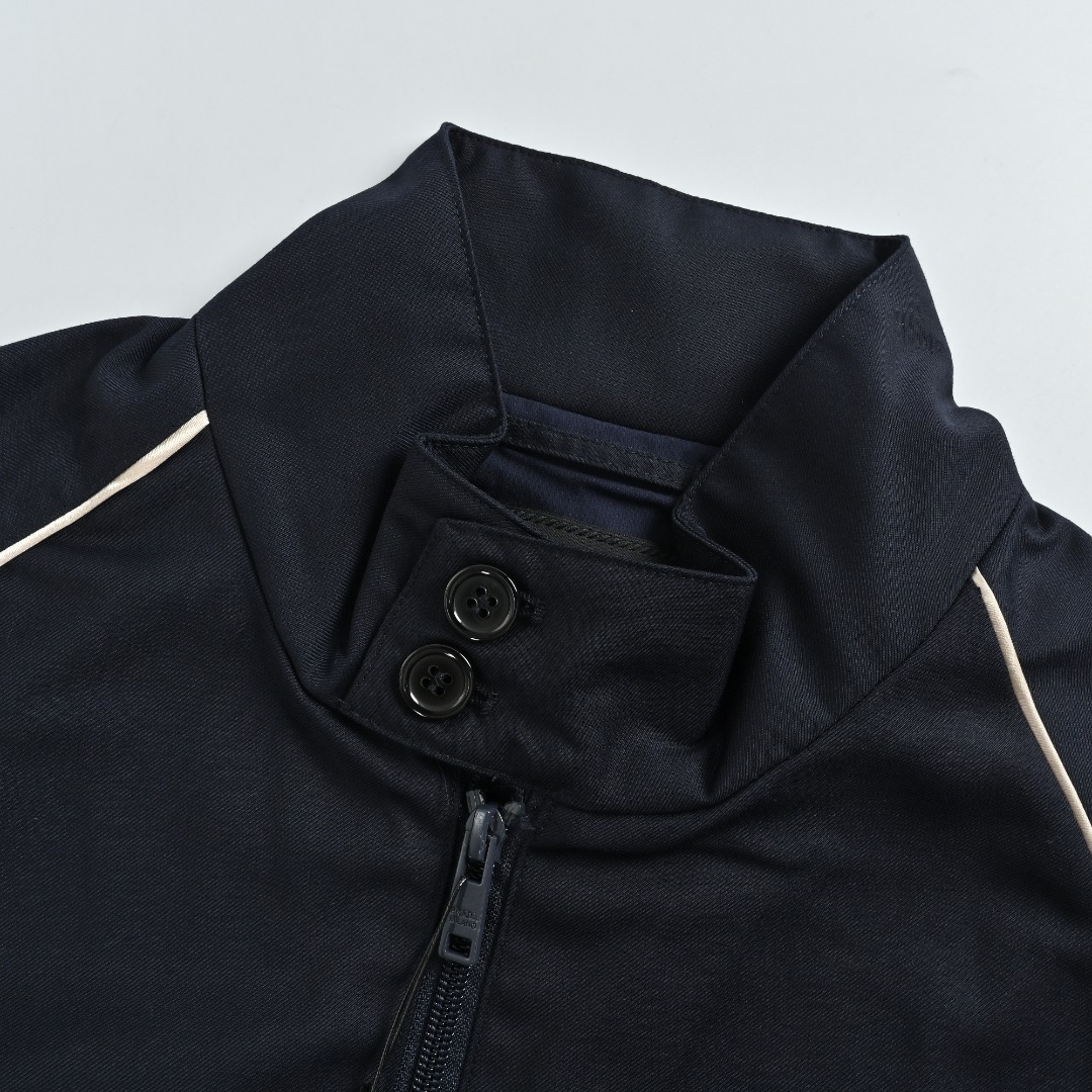 本地自取💰300 Prada 普拉达 25FW 线条立领夹克外套 天丝绉缎TEDDY夹克,衣服表面附有特殊肌理、高级面料自然的悬垂感、凉爽舒适贴肤透气、不沾尘且打理简便。内村采用T400铜氨纤维里布150克,开模领标搭配搭配CASSANDRE蛇骨链,胸口烟灰蓝色刺绣Logo 处运用田岛万针刺绣 ,用超细哑光线做加密平纹绣花,花型虽不大但针数高达二万多针,定位刺绣非常的饱满自然 色调品牌标志标识刺绣。立领设计,领口螺纹100%羊毛材质贴肤柔软舒适。全件捆条中段无接缝,片与片之间拼接完全精准对位。过肩点缀撞色滚边、漏白拼接设计,五金拉链、辅料三标一应俱全。 尺码:S M L