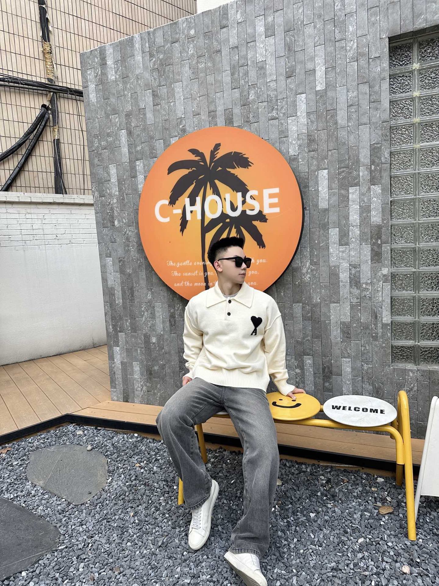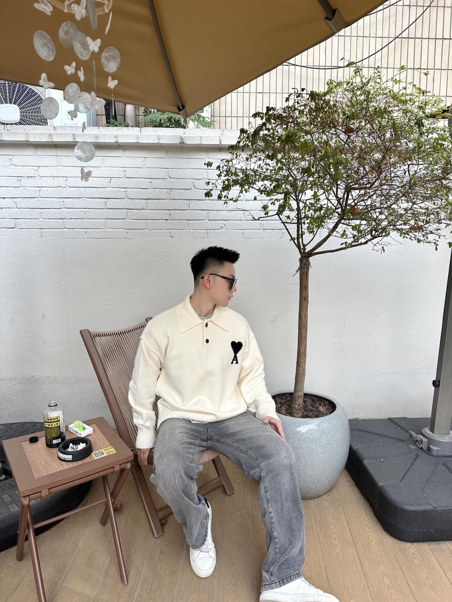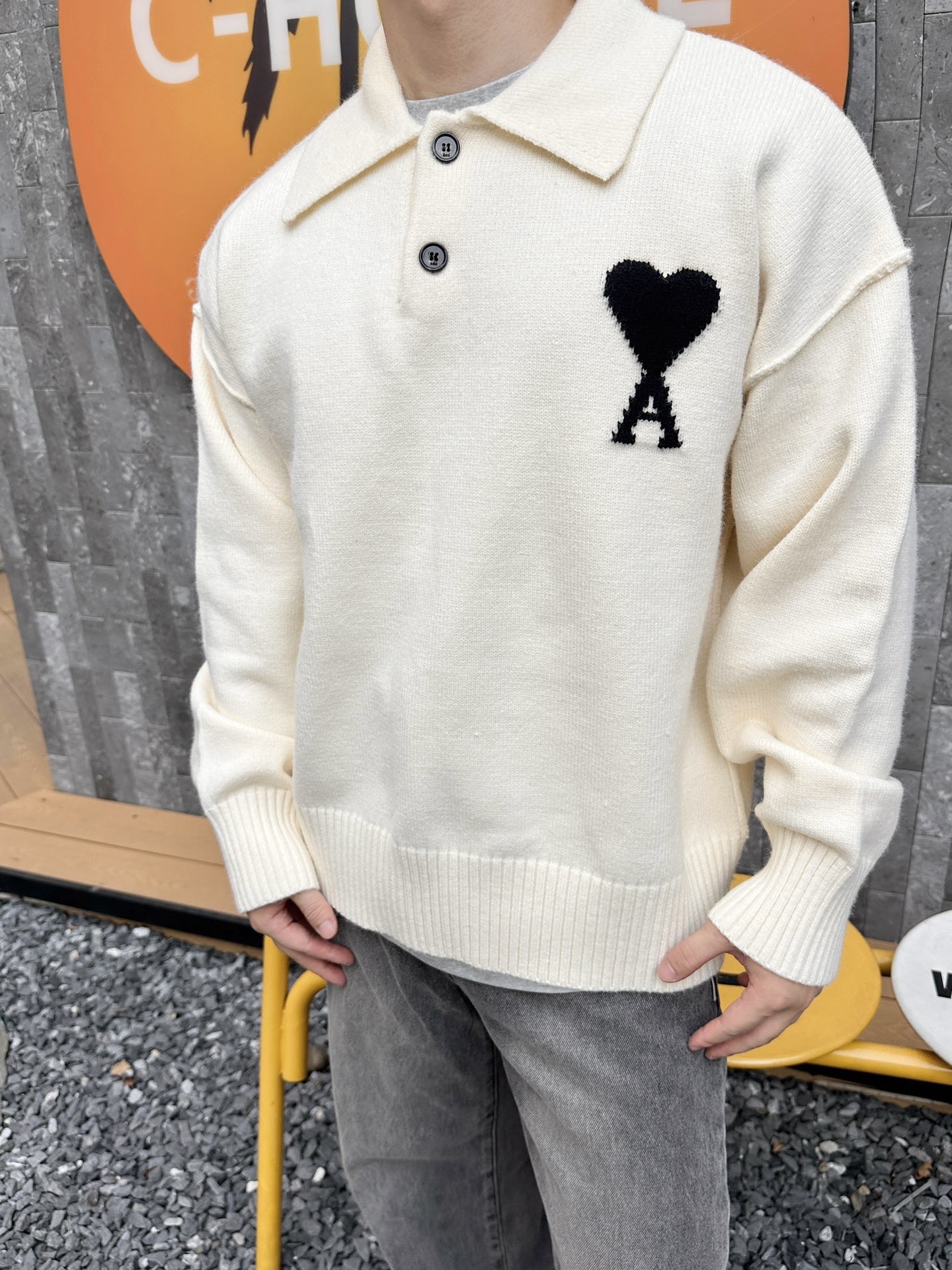 Ami Paris 爱心提花针织翻领Polo毛衣上身效果#