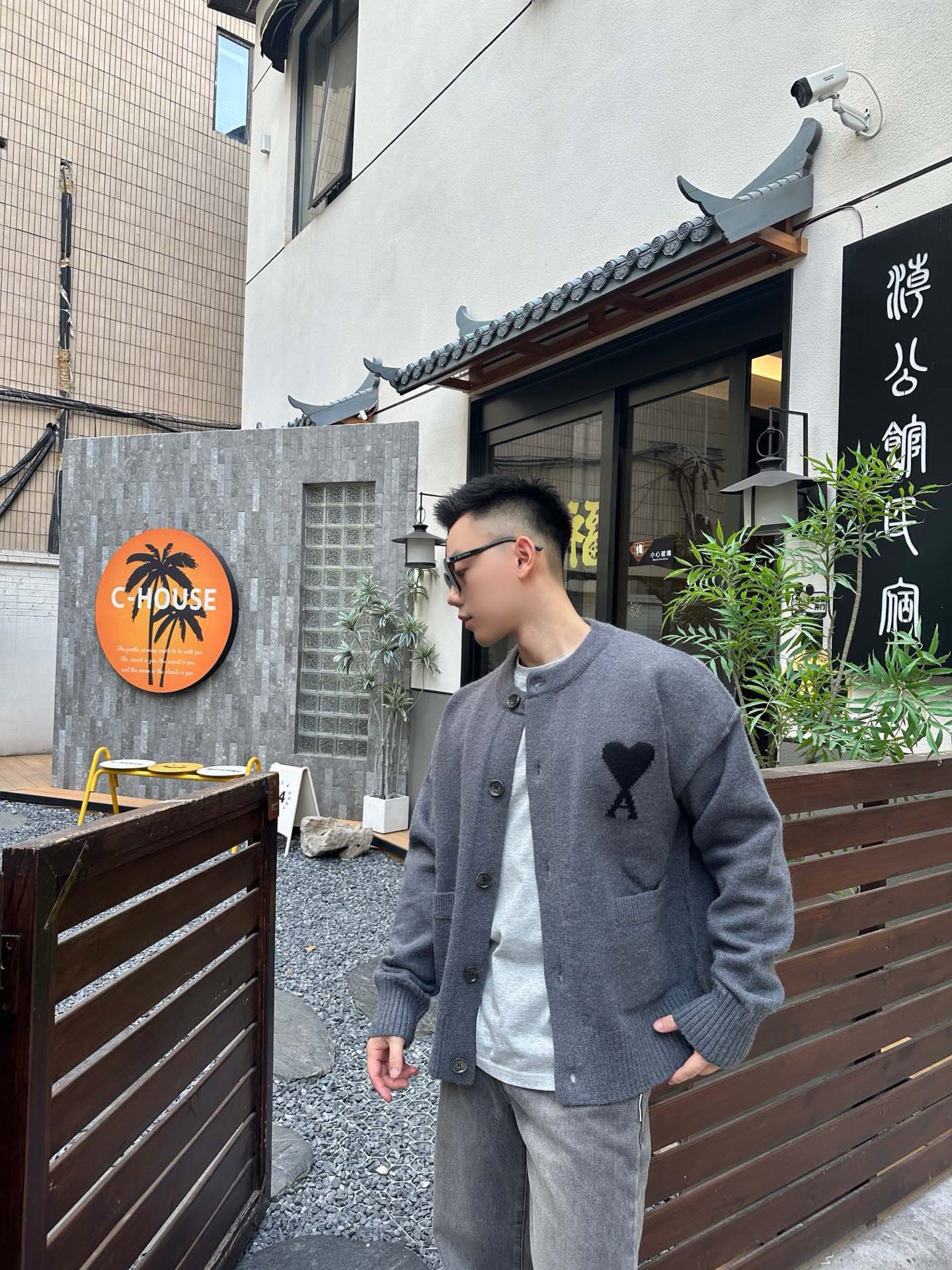 Ami Paris 爱心提花针织圆领开衫毛衣上身效果#